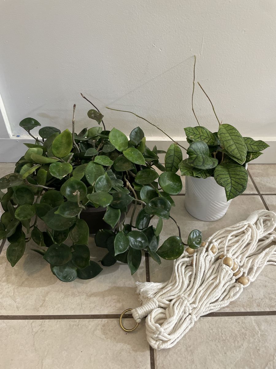 VenmoMature Hoya Chelsea in a 8” pot and Hoya Ranauensis in a 5” pot with decorative cover pot included. $20 each or buy both for $35 and will throw in a free macrame 3 plant holder. Cash or Venmo