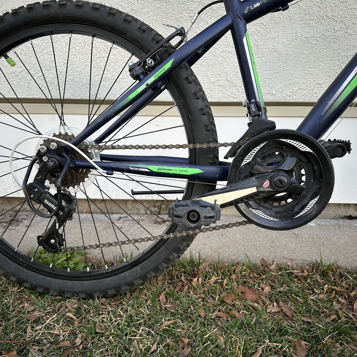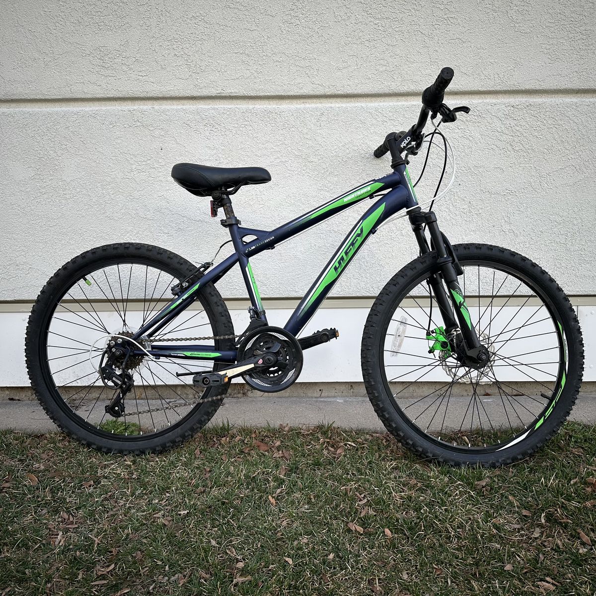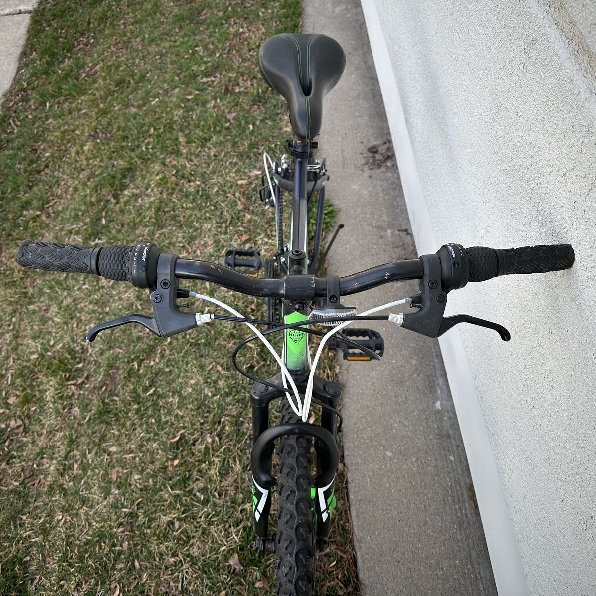 Has a 16” frame (size s), 18 speeds with twist grip shifters, front disc brake and rear rim brake, and 24” wheels.