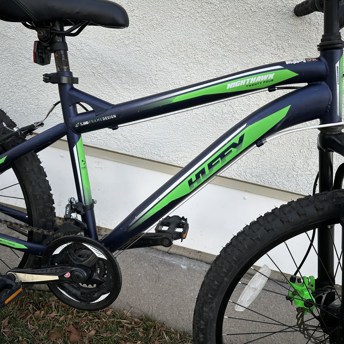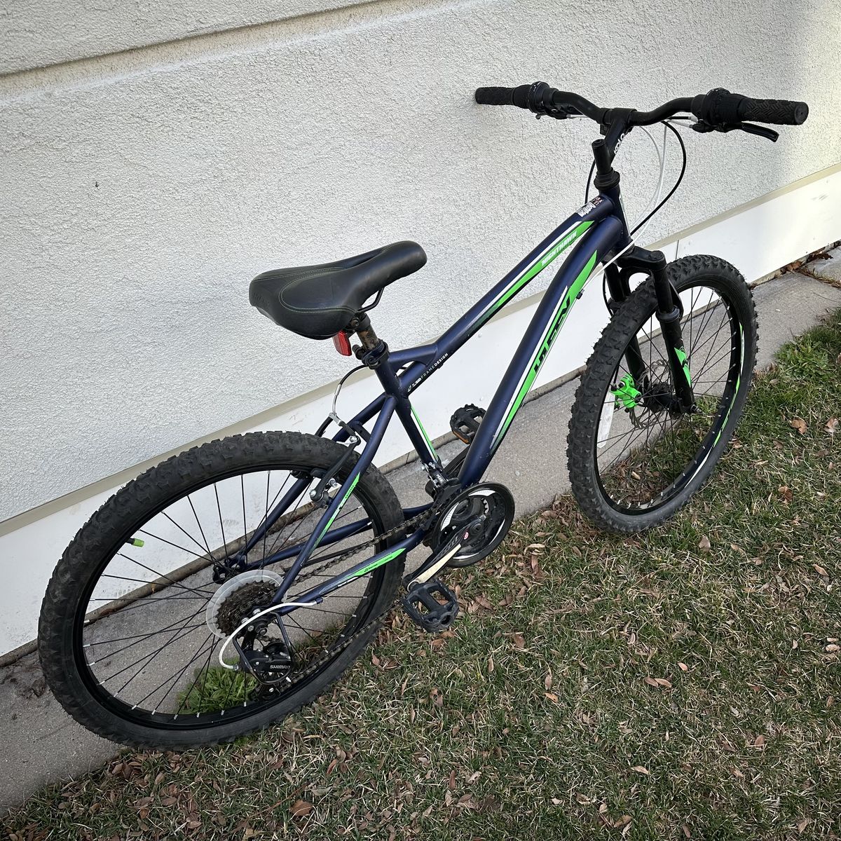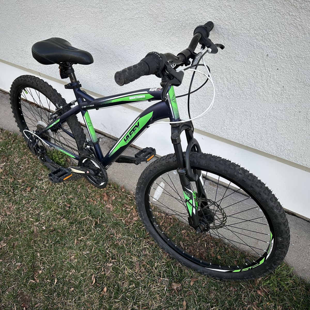 Has a 16” frame (size s), 18 speeds with twist grip shifters, front disc brake and rear rim brake, and 24” wheels.
