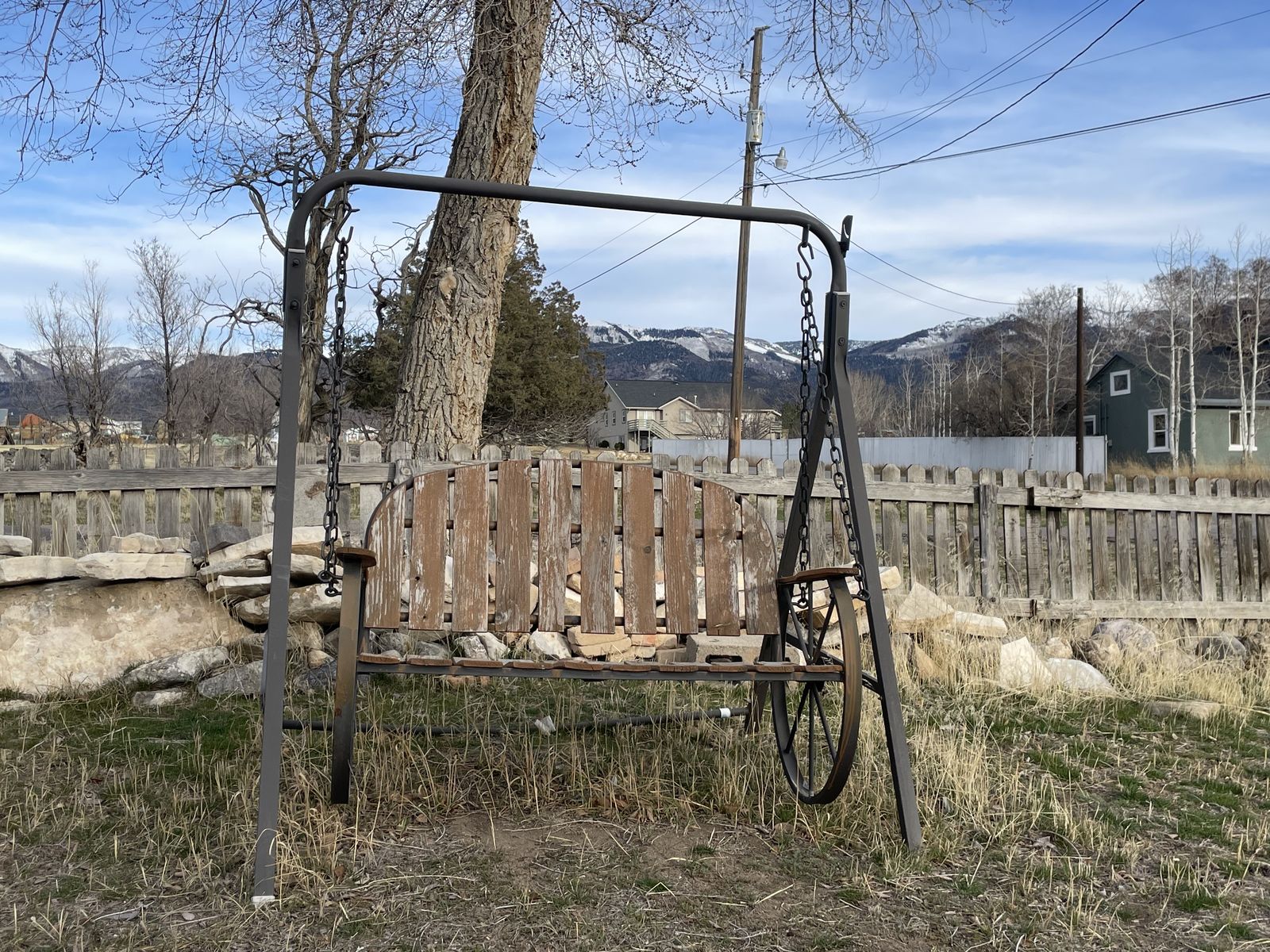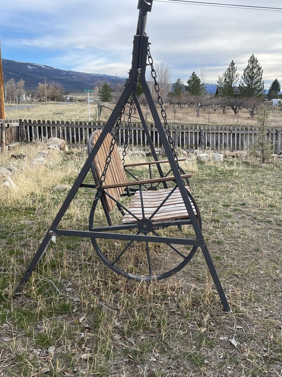Wagon wheel swing! Needs some elbow grease.