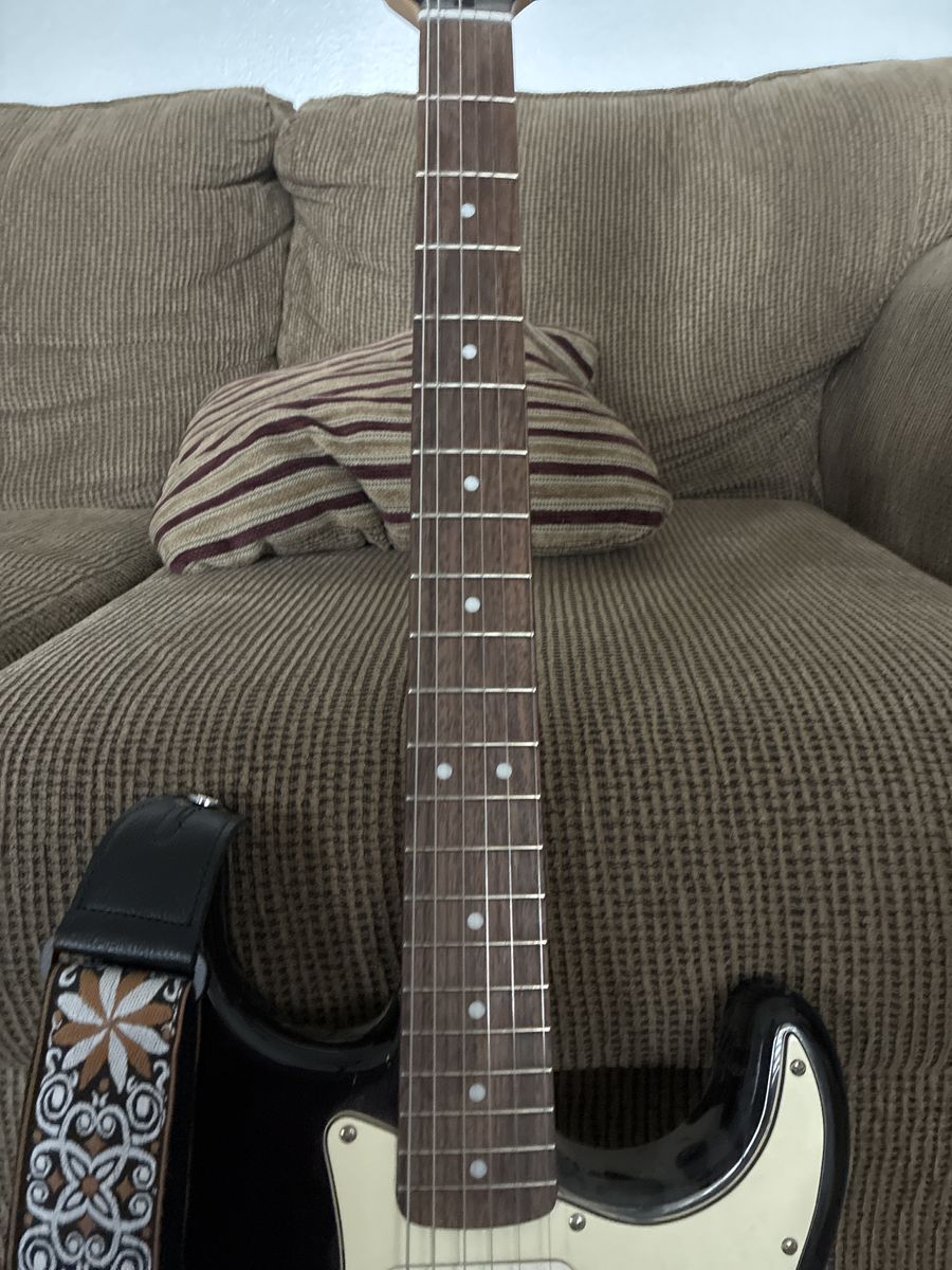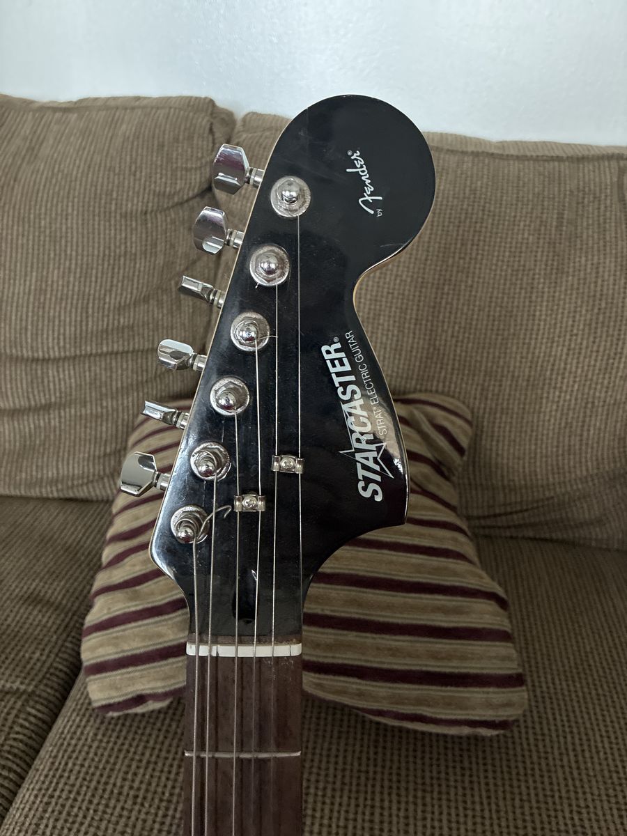Great guitar for beginners or someone who doesn’t play often. My brothers first electric then mine. Used it great for over a year I just don’t have time to play anymore. Brand new strings and strap, will also throw in a green glow in the dark cord. Willing to negotiate on price to serious buyers