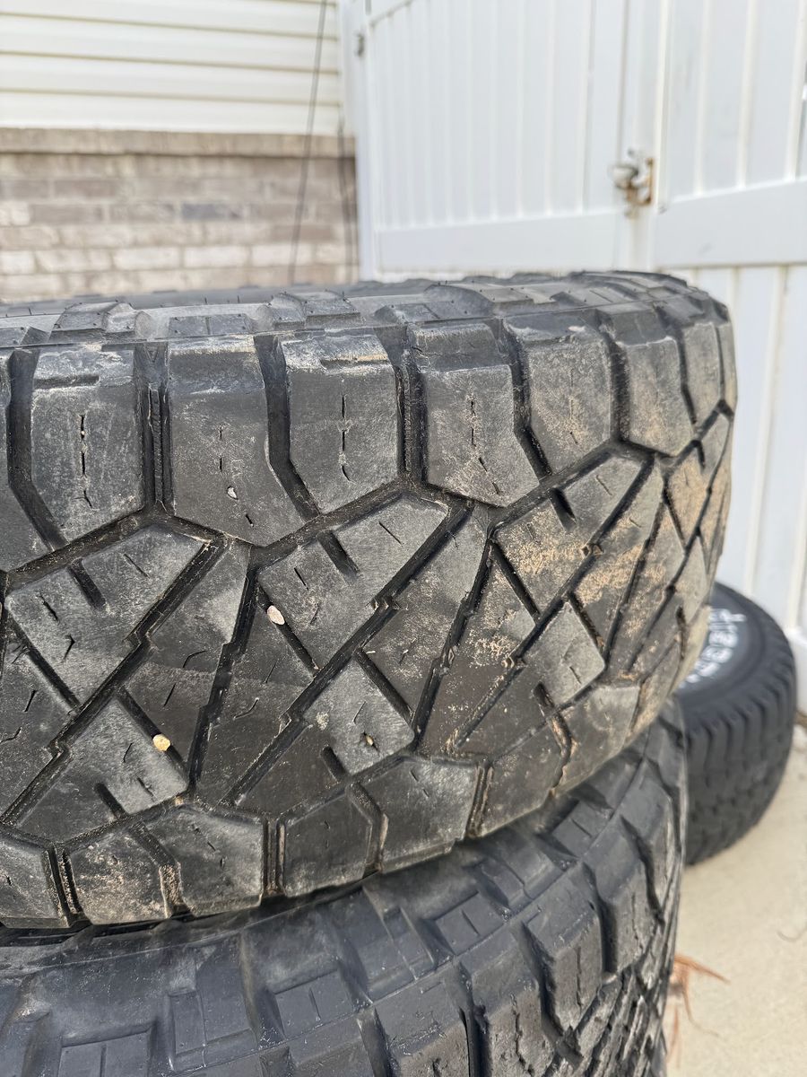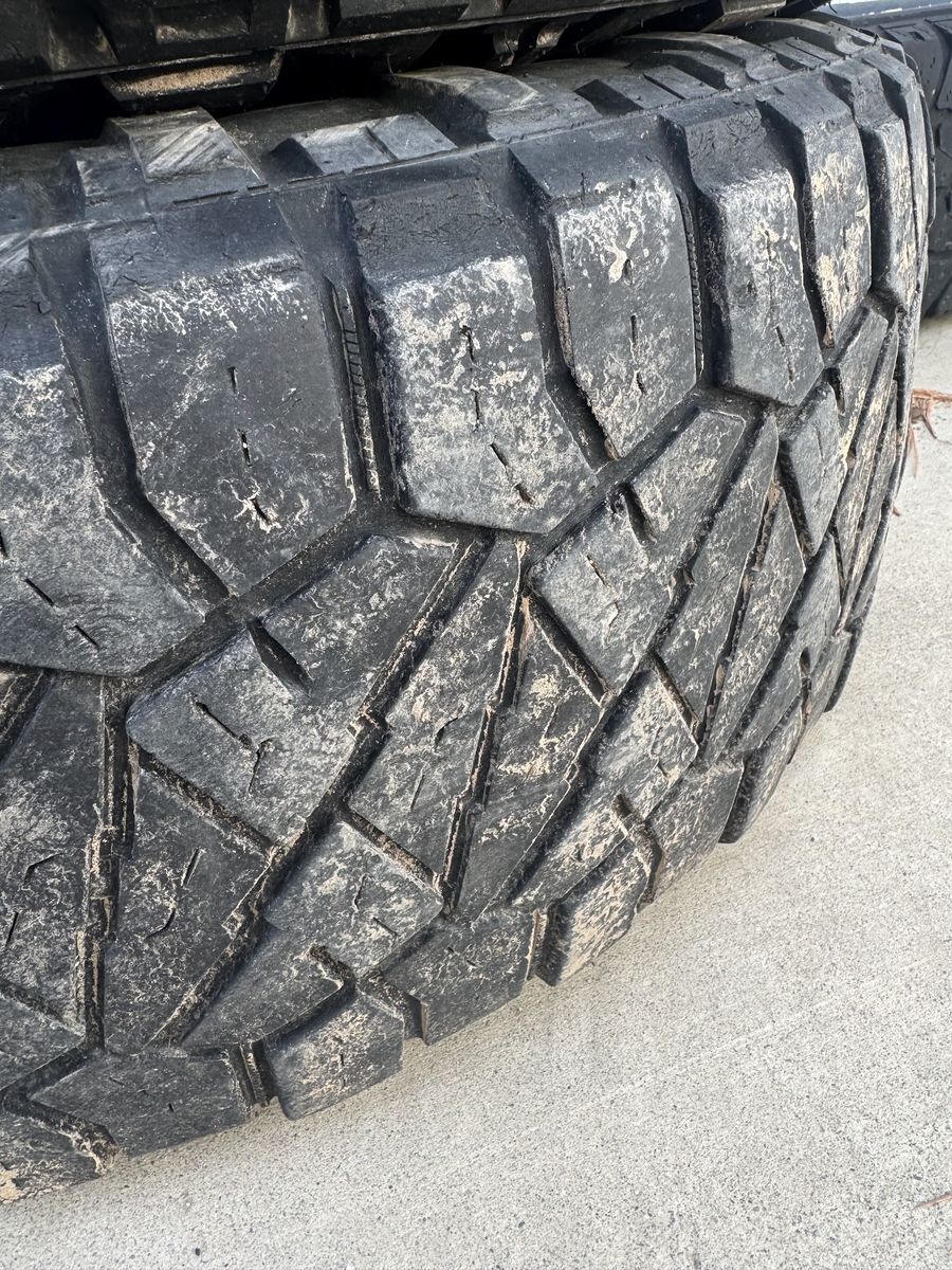 Set of used/worn 35x11.5r20 load range E nitto ridge grapplers on what appears to be american outlaw hollywood 20x9 et 19 wheels with no center caps 6x135