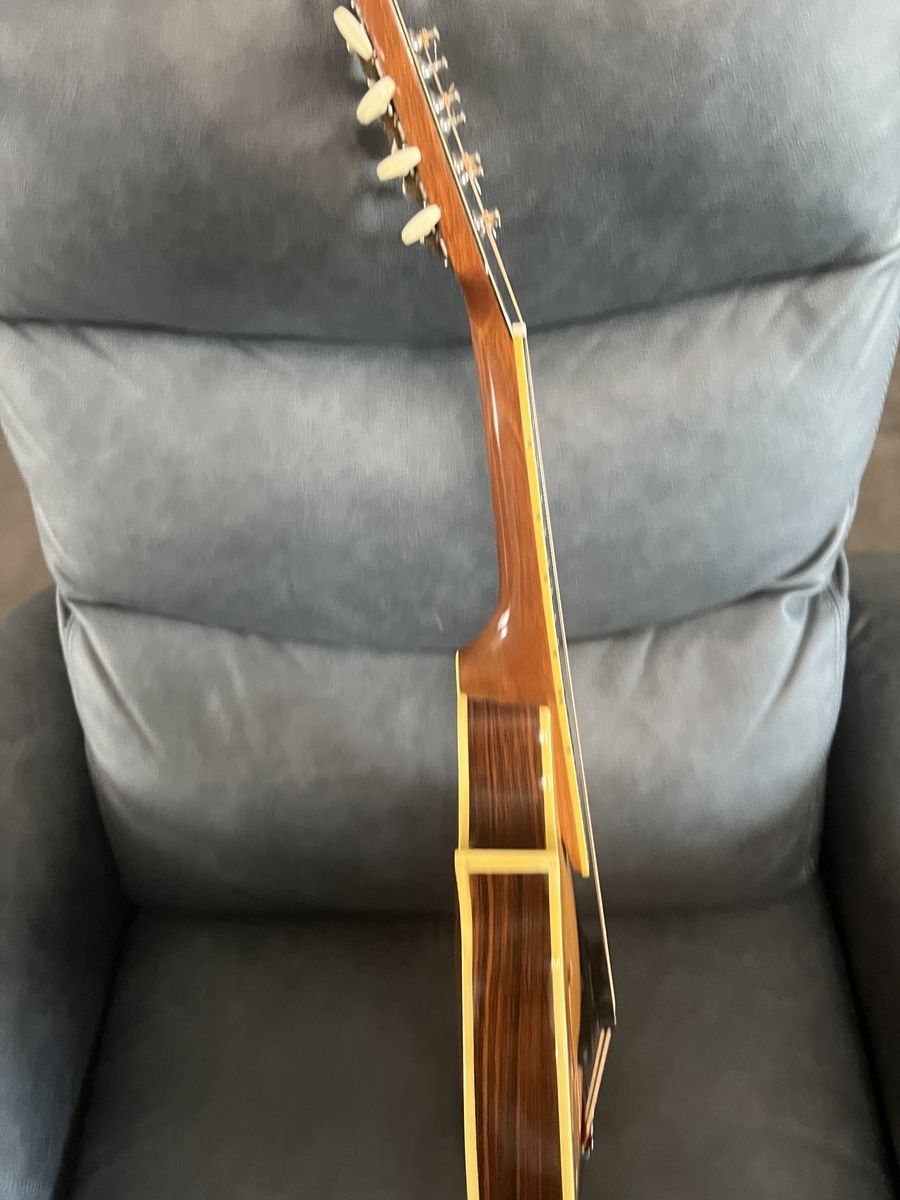 It has a compensating adjustable floating bridge and a Rosewood fingerboard. There is some slight fret wear as one would expect but there is plenty of life left in them.