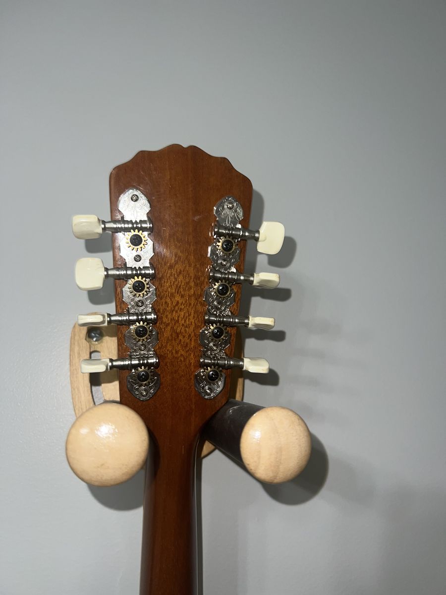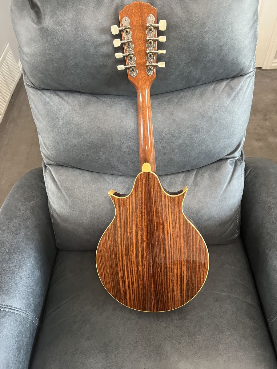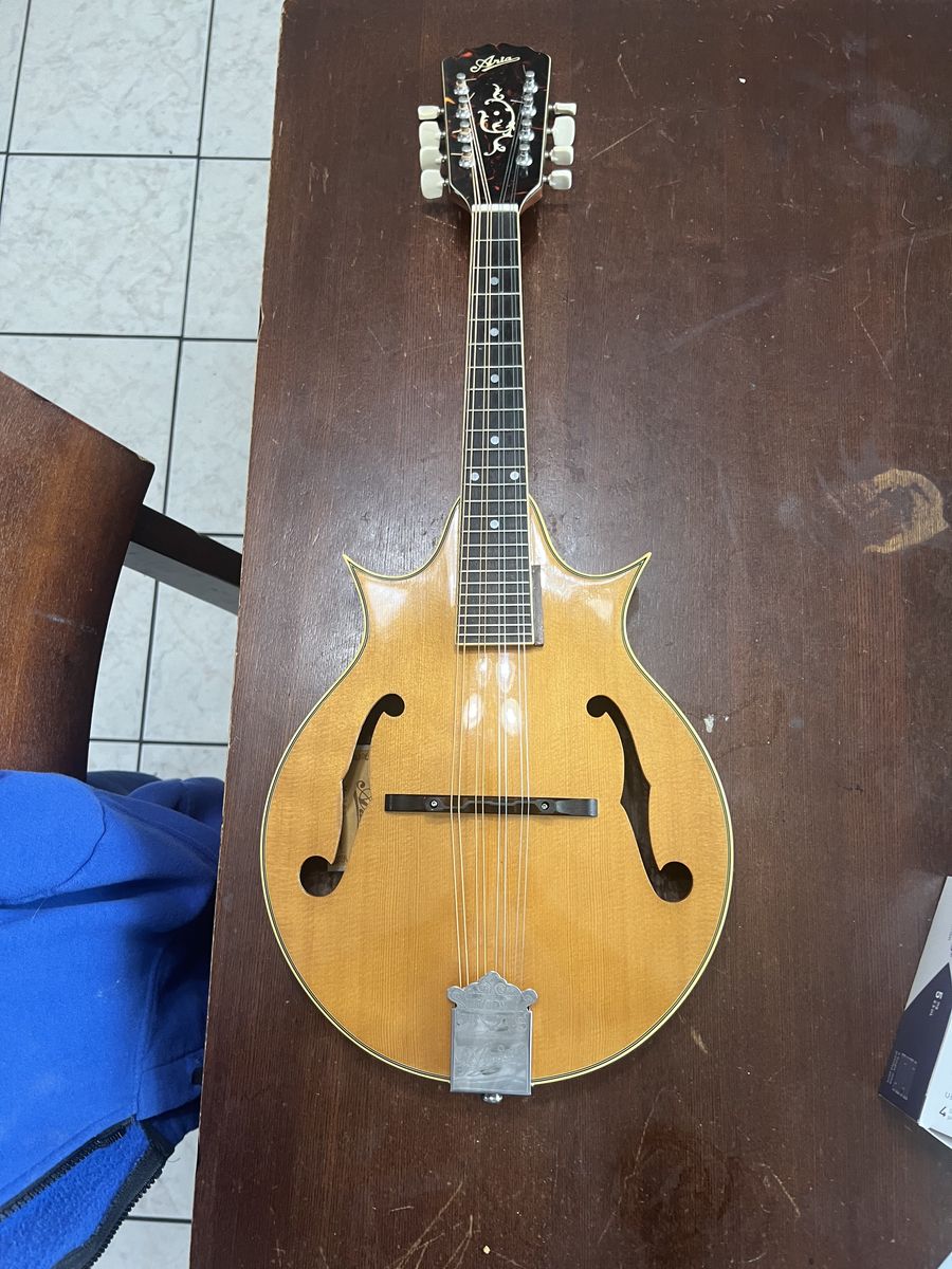 This is a very nice 1970s Aria M-300 "Two Point" Style solid Spruce top Mandolin manufactured in Japan. Superb build quality and premium cosmetic features, including a faux Tortoise shell-faced headstock veneer with Mother of Pearl inlays. Top wood is solid spruce and the back and sides are rosewood (not sure if it's laminate or solidThere is a cream binding front and back with some slight damage on one of the points.