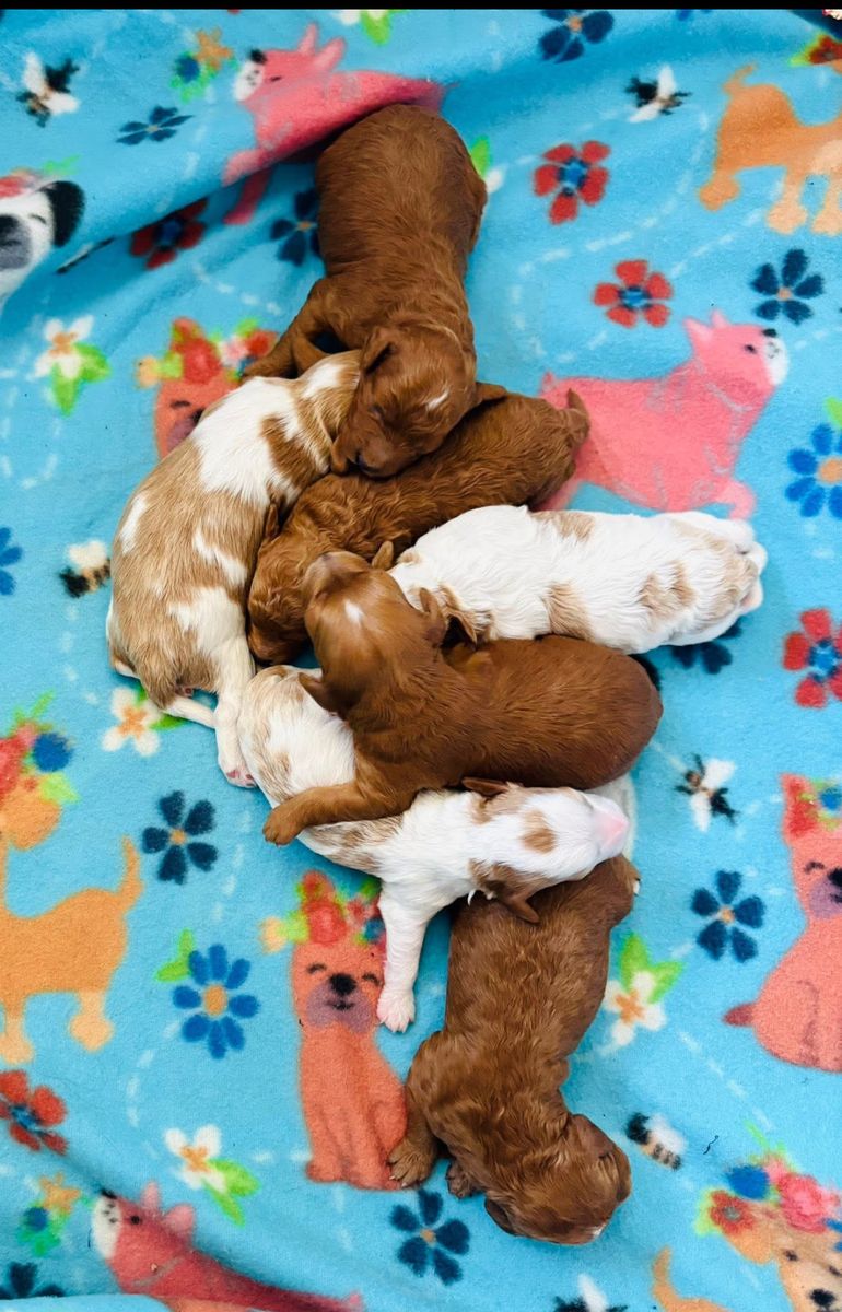 He has a soft wavy coat (no tight curls), 10/10 red intensity, and gorgeous Blenheim-style parti markings, making his puppies absolutely stunning.