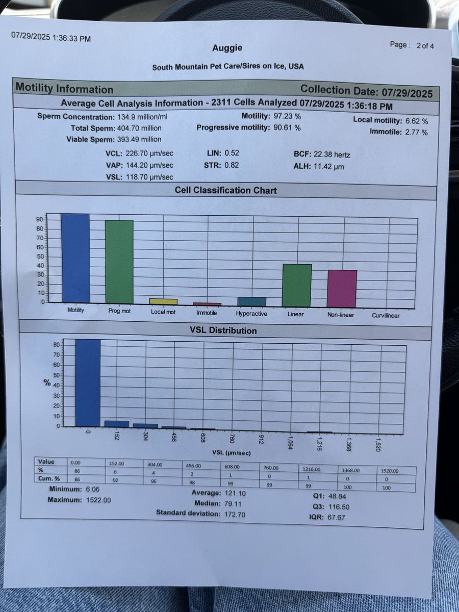 Shipping Available: We ship chilled semen across the U.S. regularly with excellent success often multiple times a month with large litter sizes. Stud fee + shipping paid by dam’s owner. (Note: Pregnancy not guaranteed on shipments due to shipping and variables outside our control.)