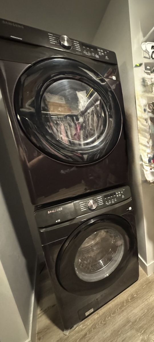 Clean, modern, and works great! This Samsung stackable washer and dryer set is perfect for saving space while still handling full-size loads.
