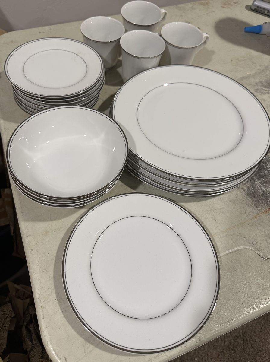 PayPalSimplicity china. This has been used and is not a complete set. Asking $60 4 bowls 4 dinner plates 1 salad plate 8 saucers/bread plates 4 mugs