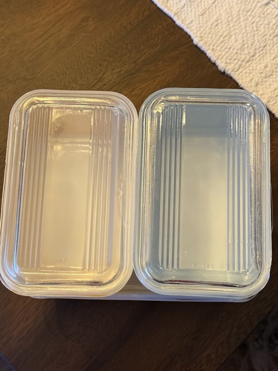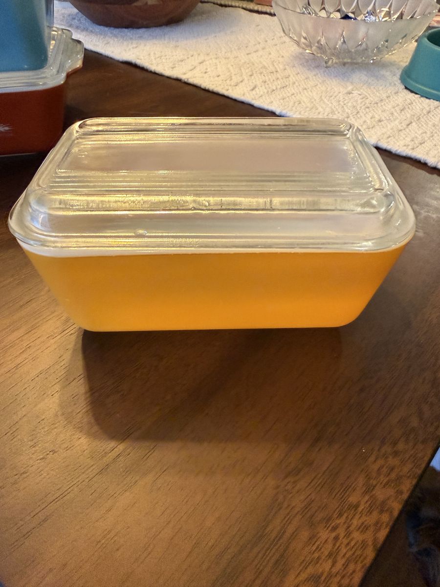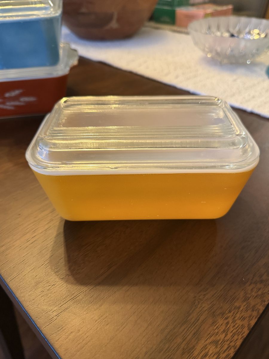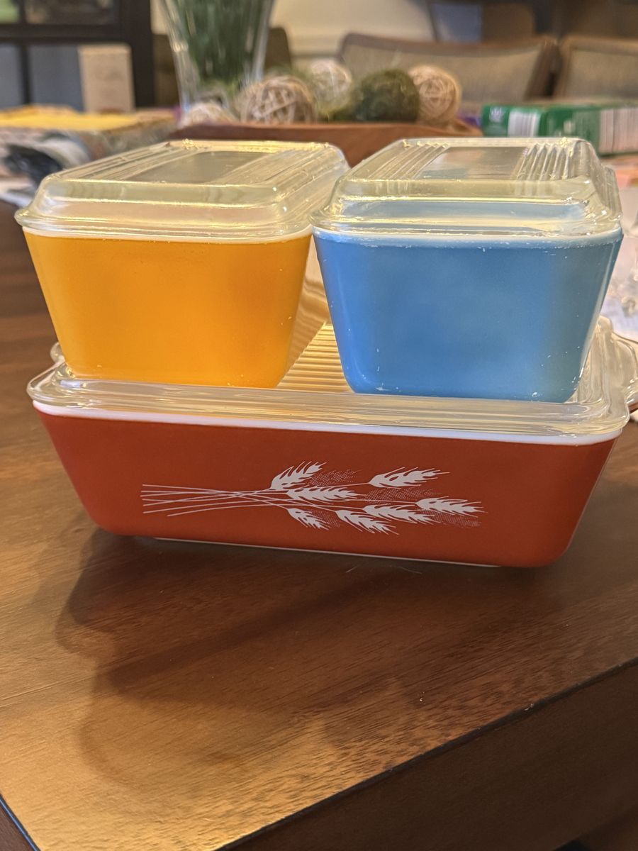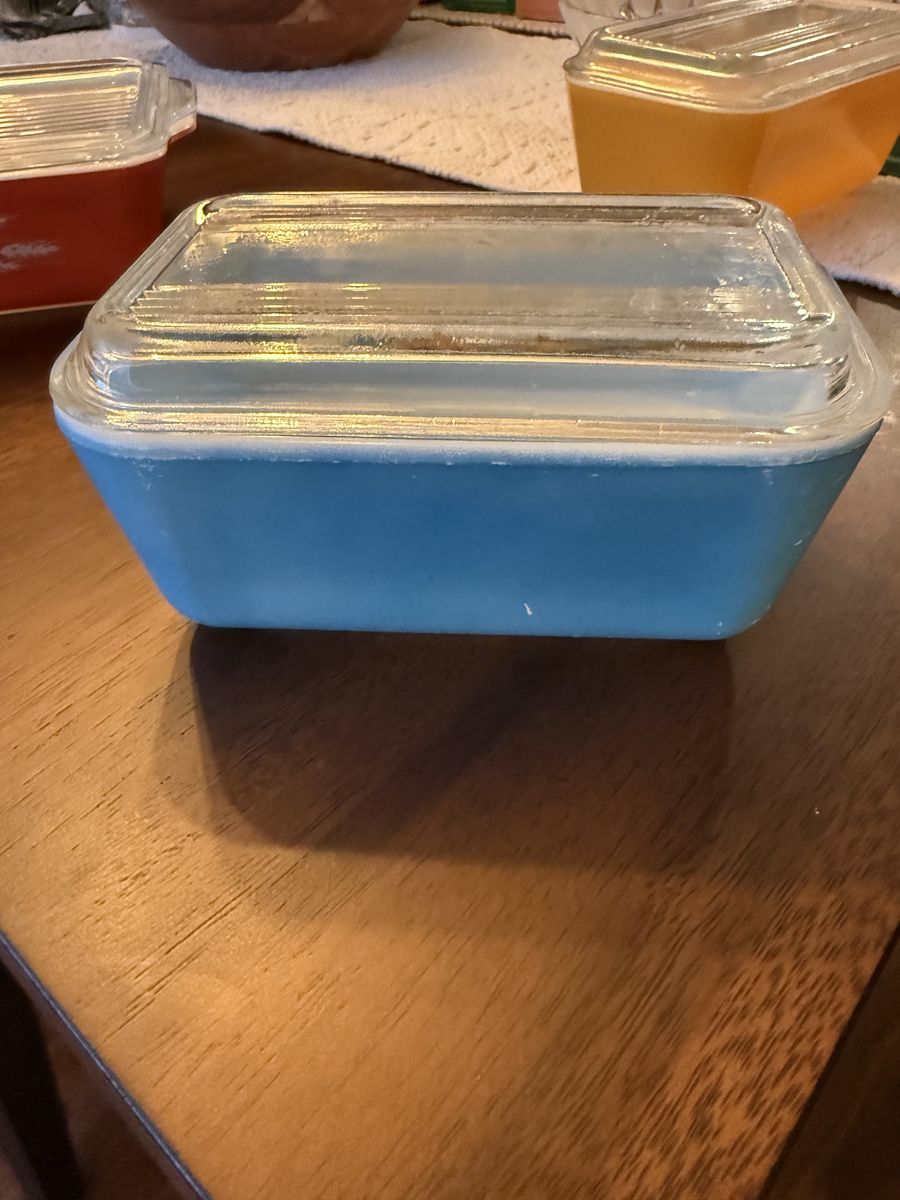VenmoVintage Pyrex non-matching refrigerator dishes . In good shape . The blue dish has some small wear marks on it . Lids are all included with no chips or cracks.