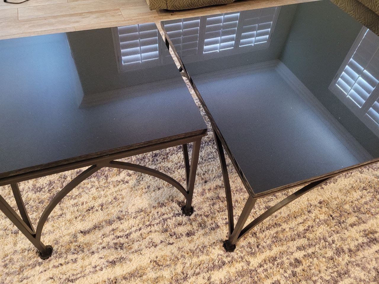 These two matching end tables have a iron base with a black polished marble table top. They are both in like-new condition. Sturdy and beautiful! Purchased from Bassett Furniture.