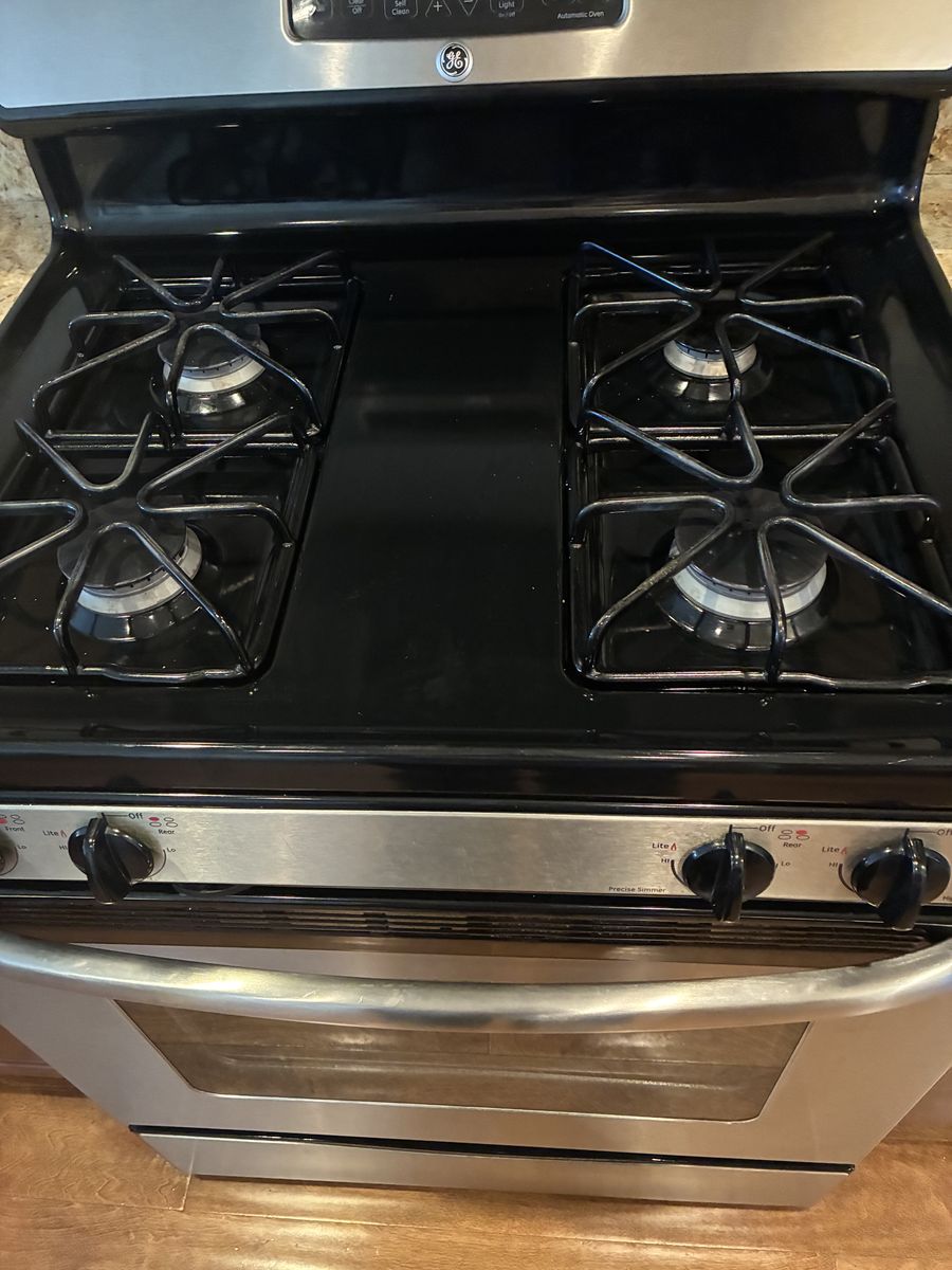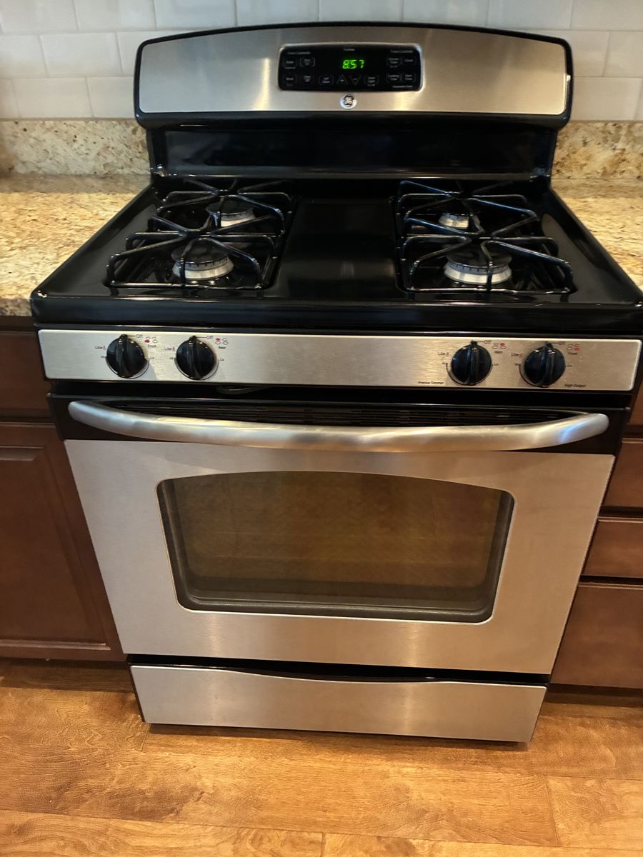 GE gas range with drawer in bottom. Oven needs repair but the 4 top burners work perfect. Price $50. It’s a standard 30” wide.