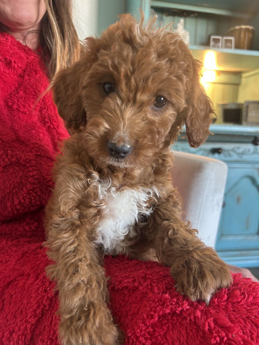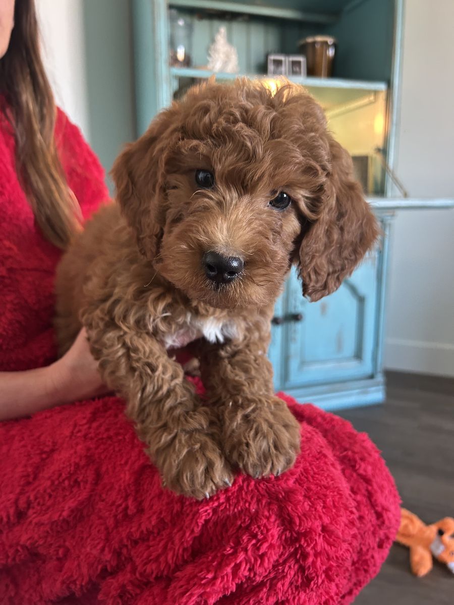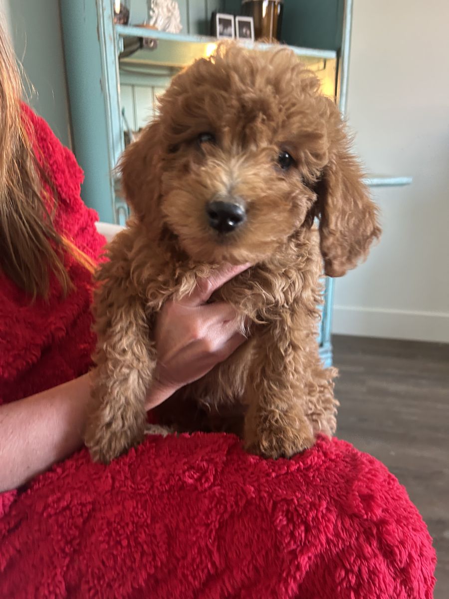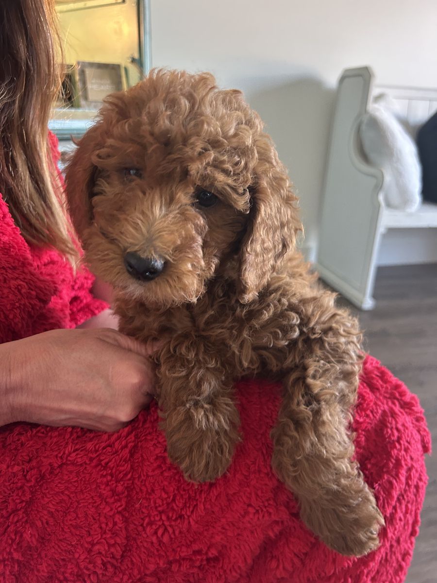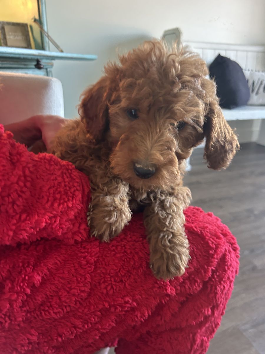 These adorable Goldendoodles are so sweet and smart. They are ready to go to their new homes. Boys and girls available. They were born December 28th. They are dark apricot and red colored. They have very pretty coats. Reach out with any questions.