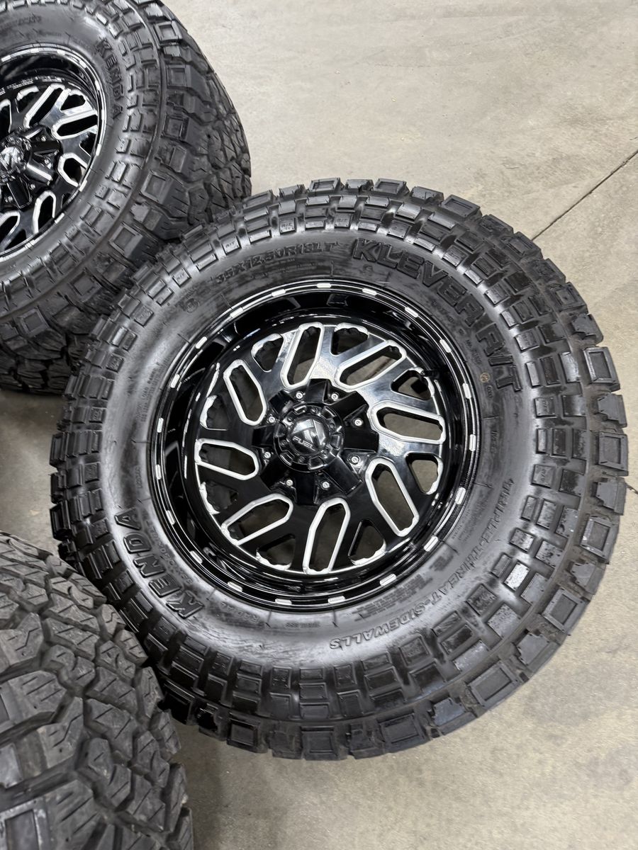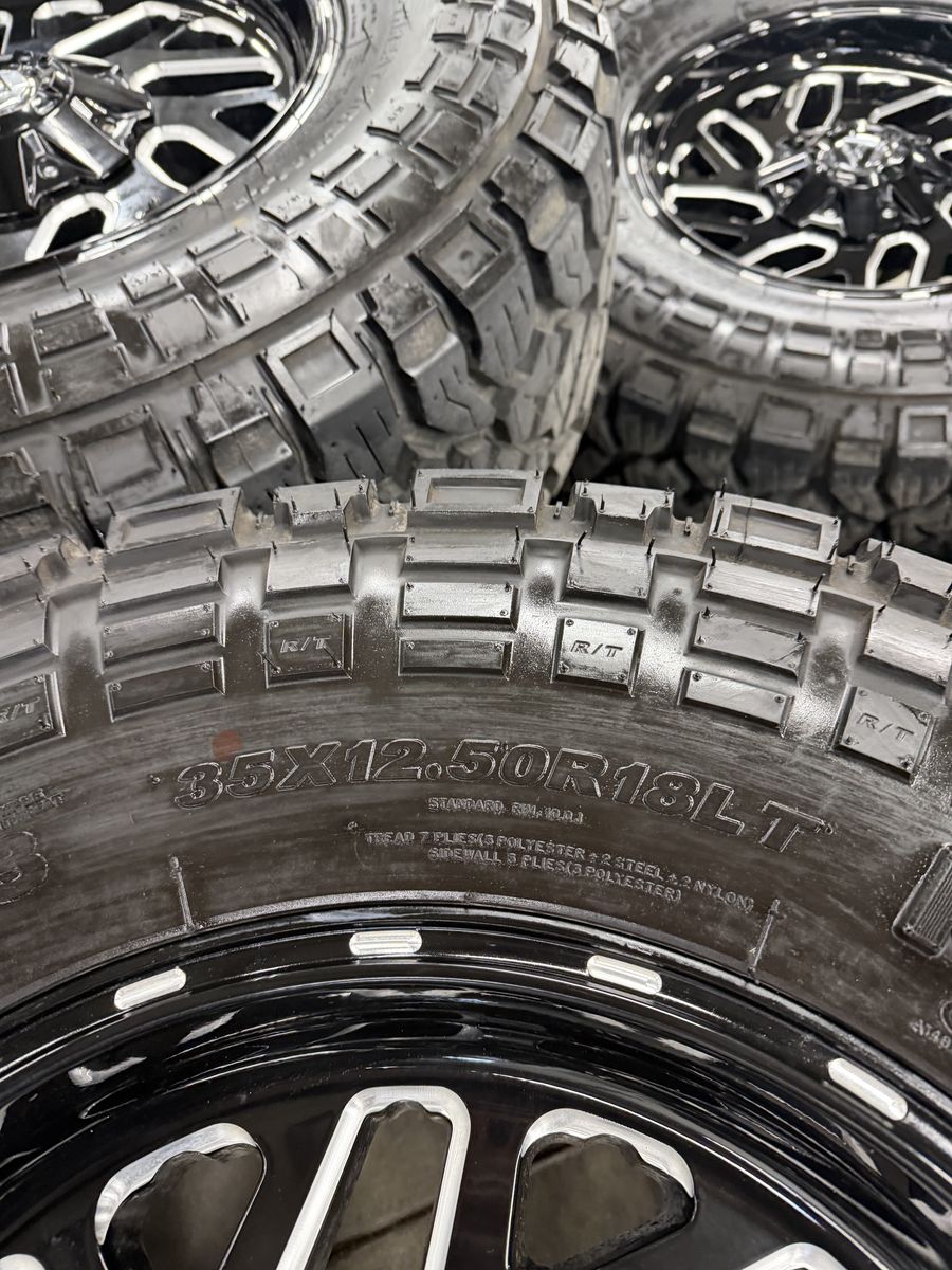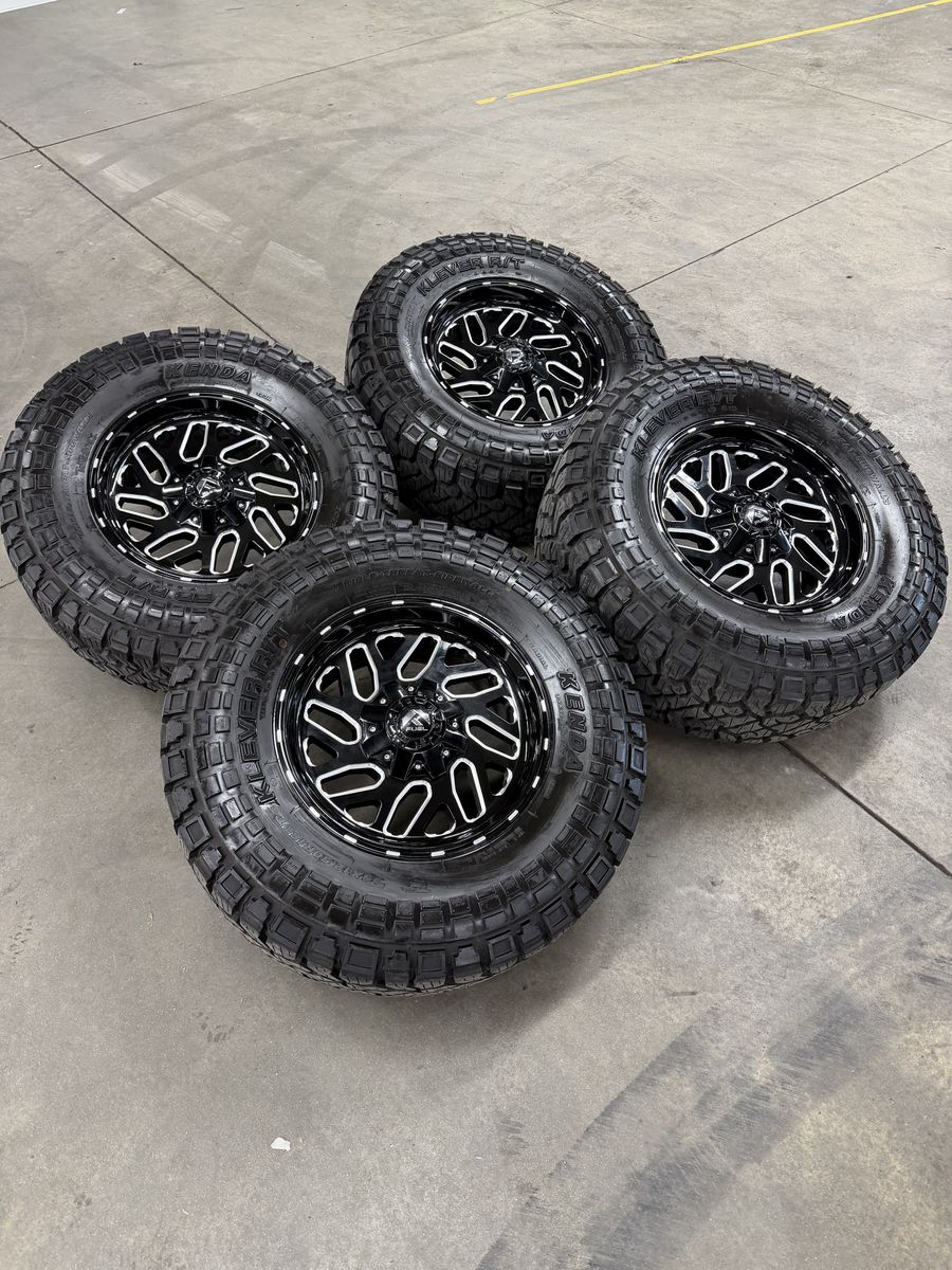 Wheels are 18x9 fuel triton custom wheels, black and milled finish, wheels are in like new shape, no curb rash, dings or damage on them, wheels look as if they just came out of the box. All of the center caps as well as TPMS are also included. Tires are 35x12.50r18 kenda kleavers, all terrain tires, load range E, 10ply, top of the like tires, no patches or plugs, tires have less then 400 miles, so they are pretty much brand new.