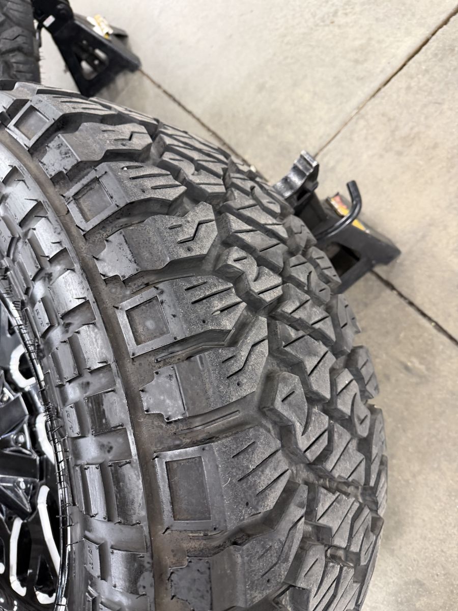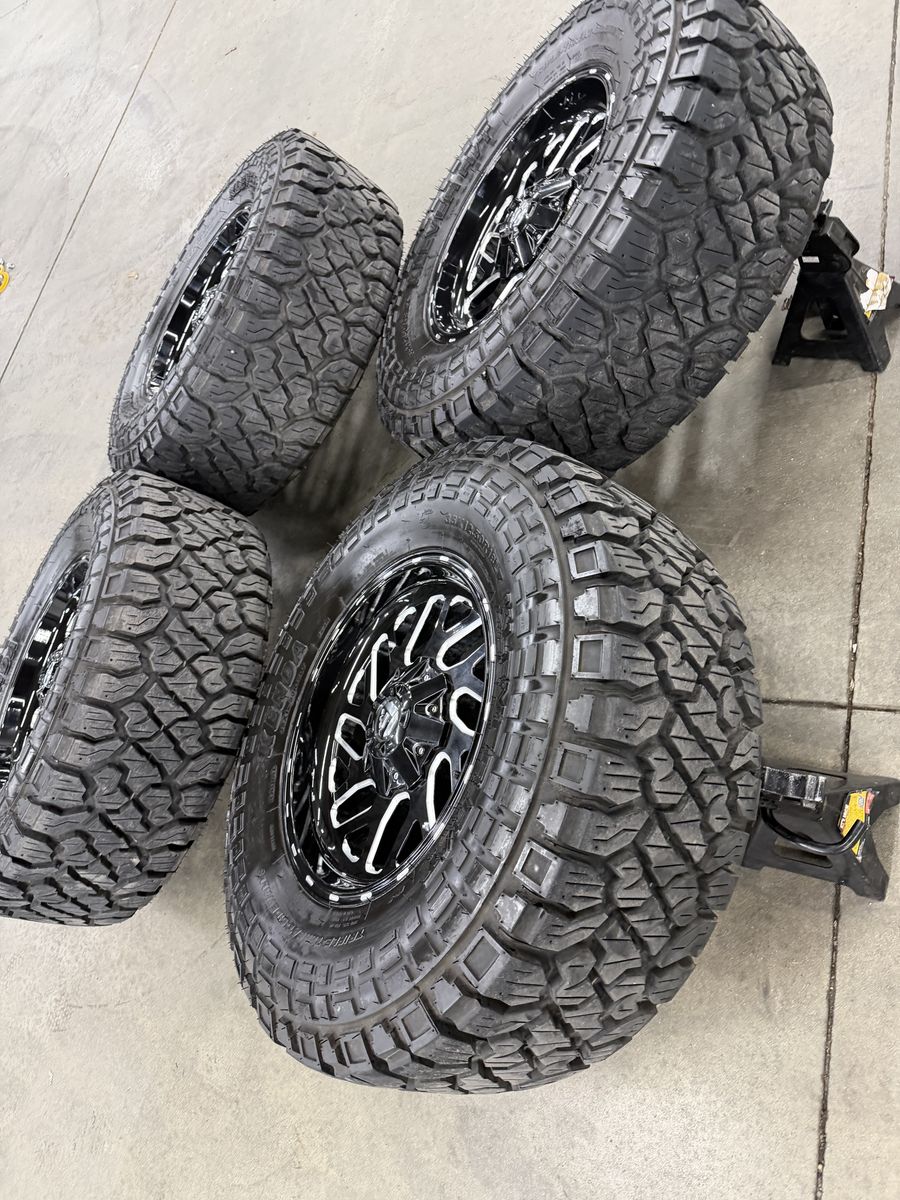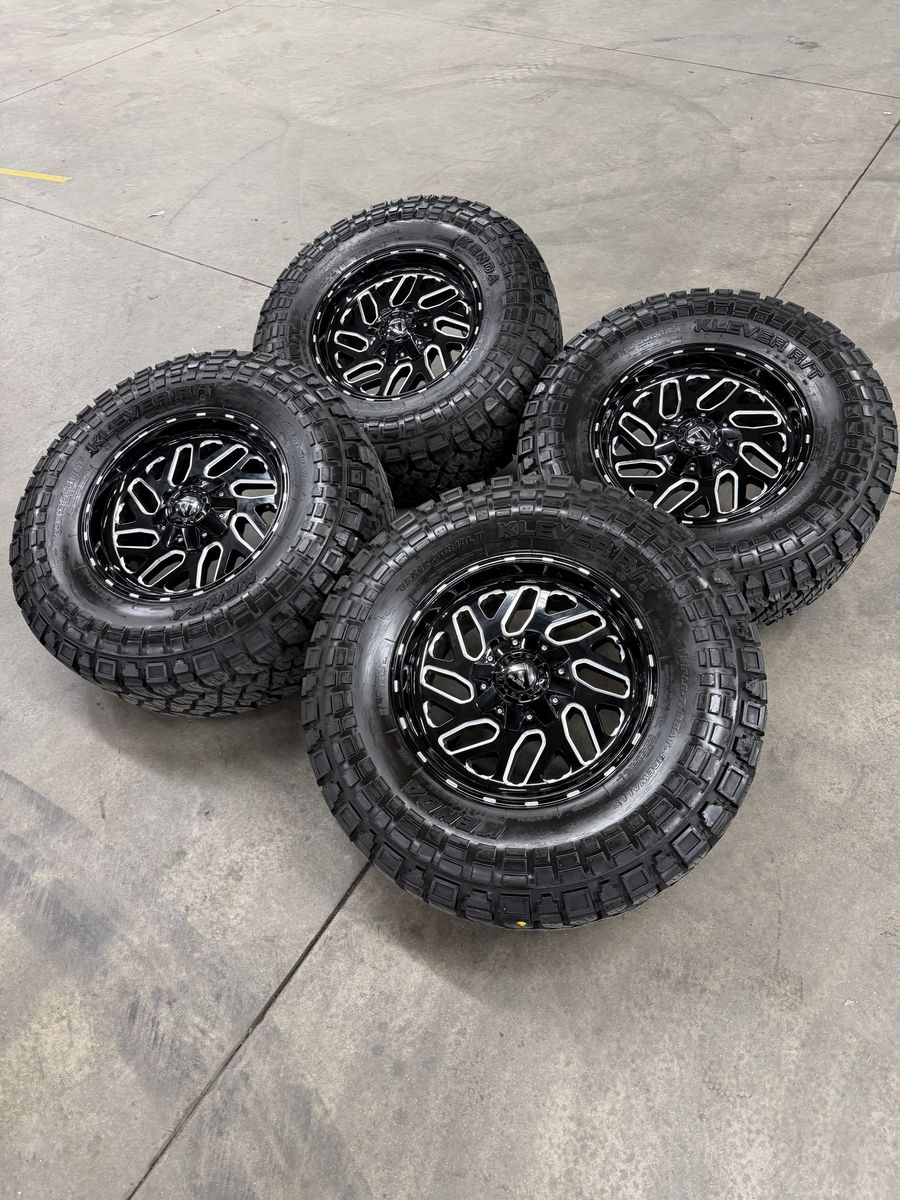Wheels are 18x9 fuel triton custom wheels, black and milled finish, wheels are in like new shape, no curb rash, dings or damage on them, wheels look as if they just came out of the box. All of the center caps as well as TPMS are also included. Tires are 35x12.50r18 kenda kleavers, all terrain tires, load range E, 10ply, top of the like tires, no patches or plugs, tires have less then 400 miles, so they are pretty much brand new.