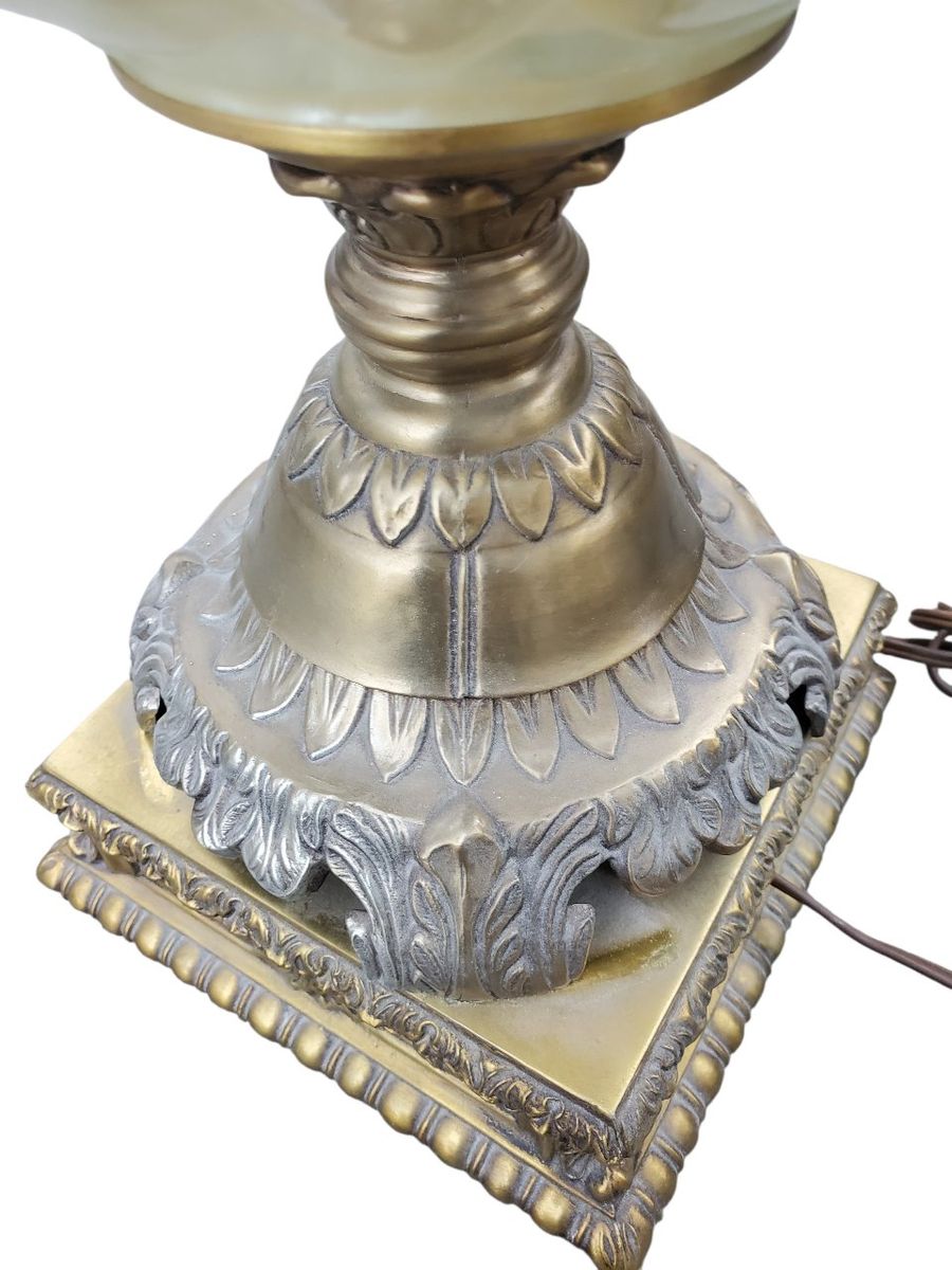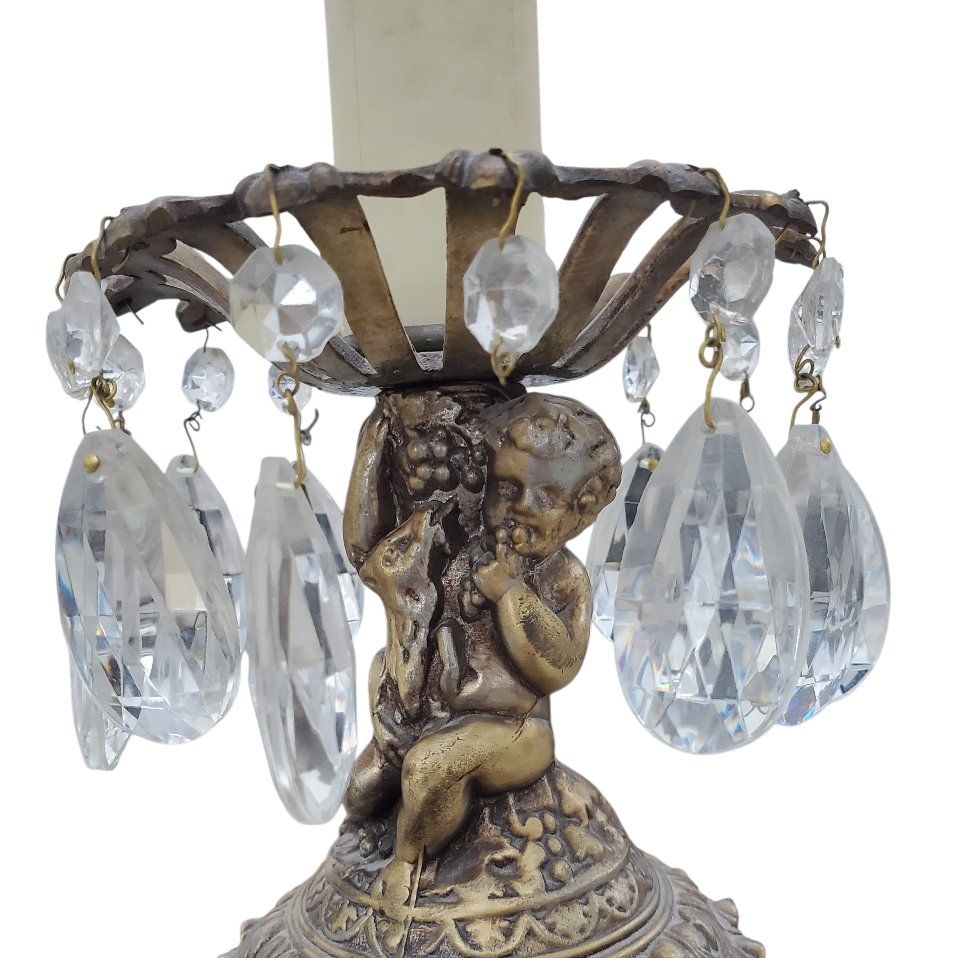 Mother of Pearl glass | Iridescent | opalescent | cherubs holding a lamb / goat | brass | vintage | Hollywood Regency | crystal prisms | opalescent blown glass globes | 1950's / 1960's | MCM | white lamp shades | white + gold tone | ornate | detailed