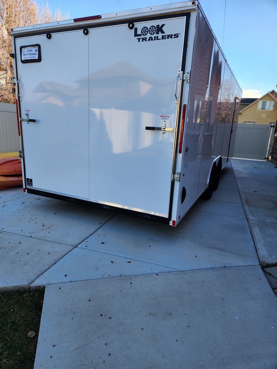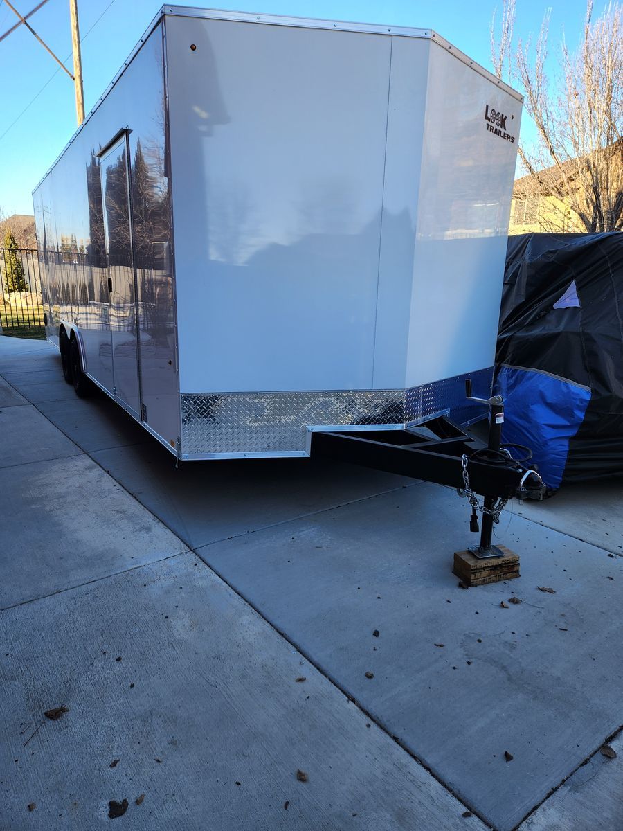 Look Model K-DXC10224-100. Virtually new! Cargo space 24' plus the V-nose by 8'1" (82" between the wheel wells). Low deck for loading (~15") with flip-down extension. Easy to load/unload anything you want to put in it.