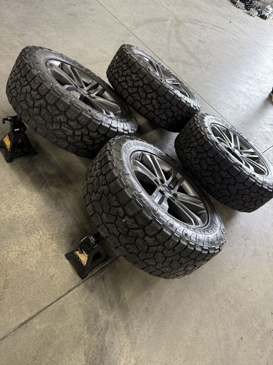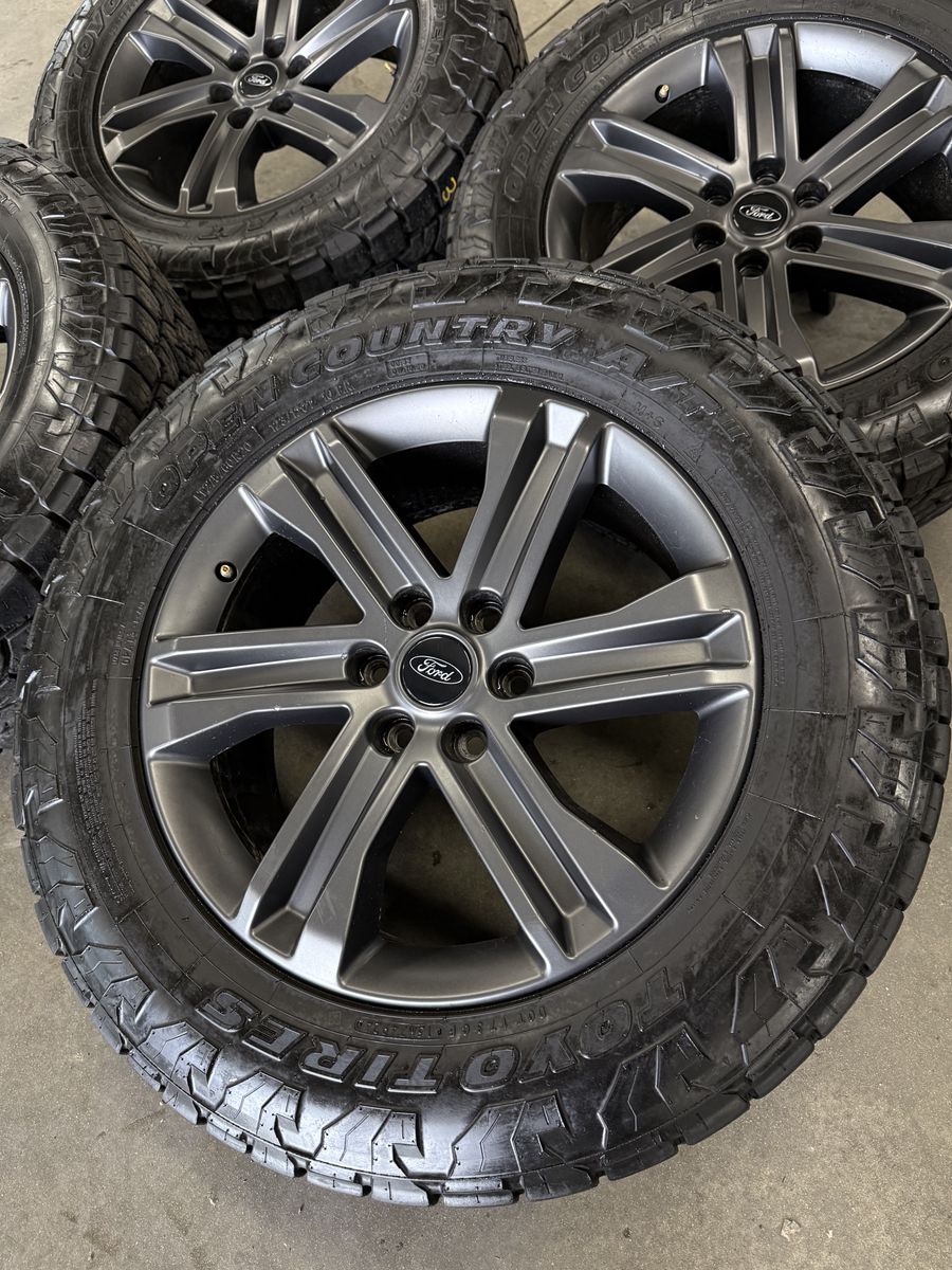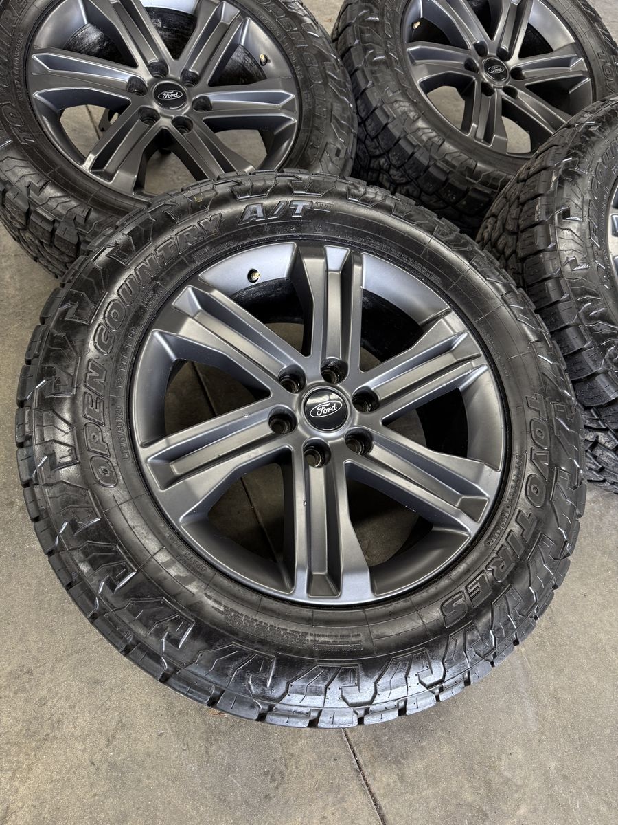 Wheels are 20in OEM wheels off a 2023 ford f150 performance package. Wheels are in great shape, no curb rash, dings or major damage on them, other then average wear they are in like new shape. All of the center caps are also included and in perfect shape as well. Tires are 275/60/20 Toyo open country at3, load range E, top of the line tires, no patches or plugs in them. Tires have about 70-75% tread life left.