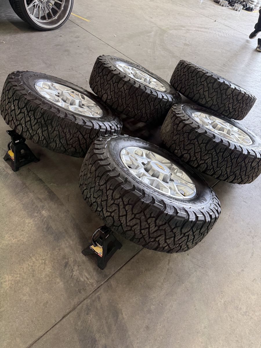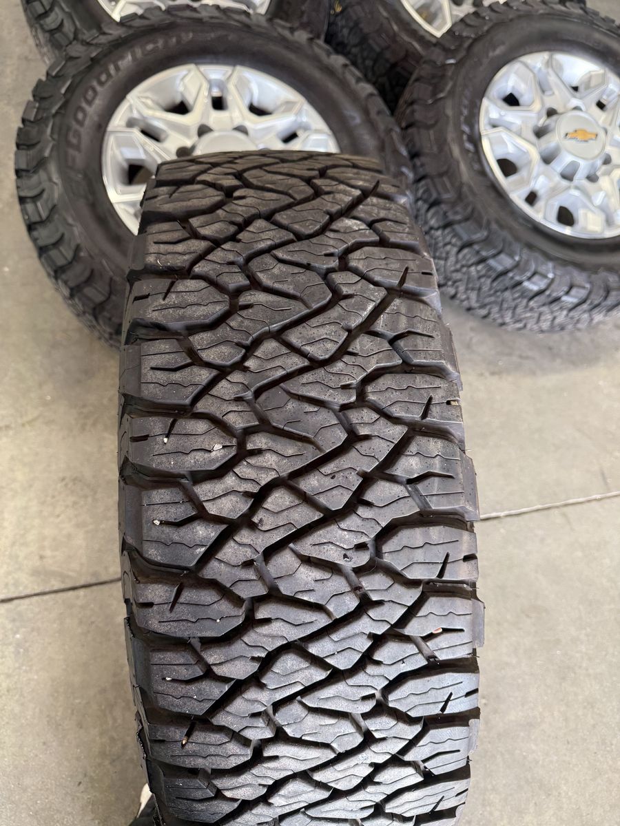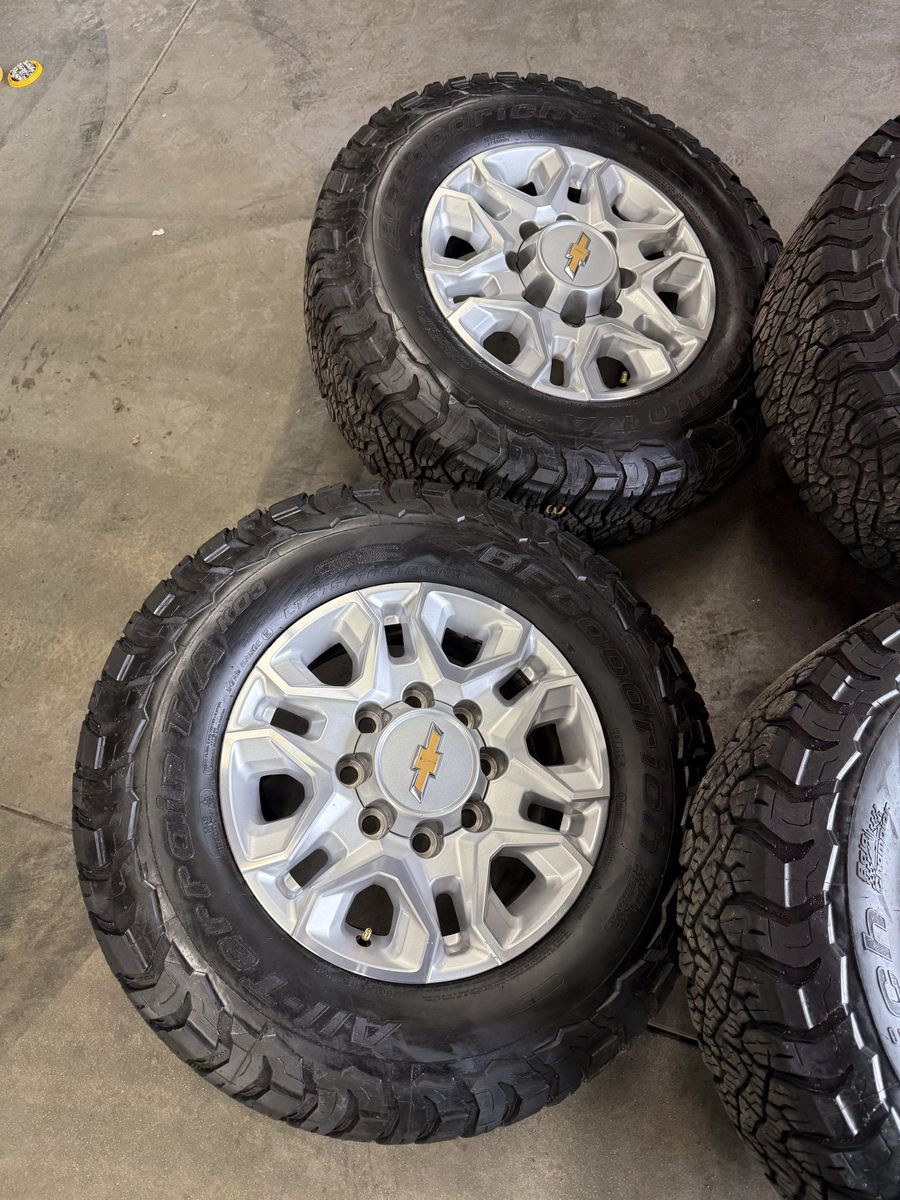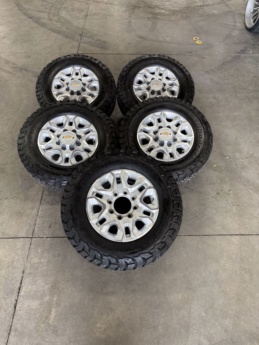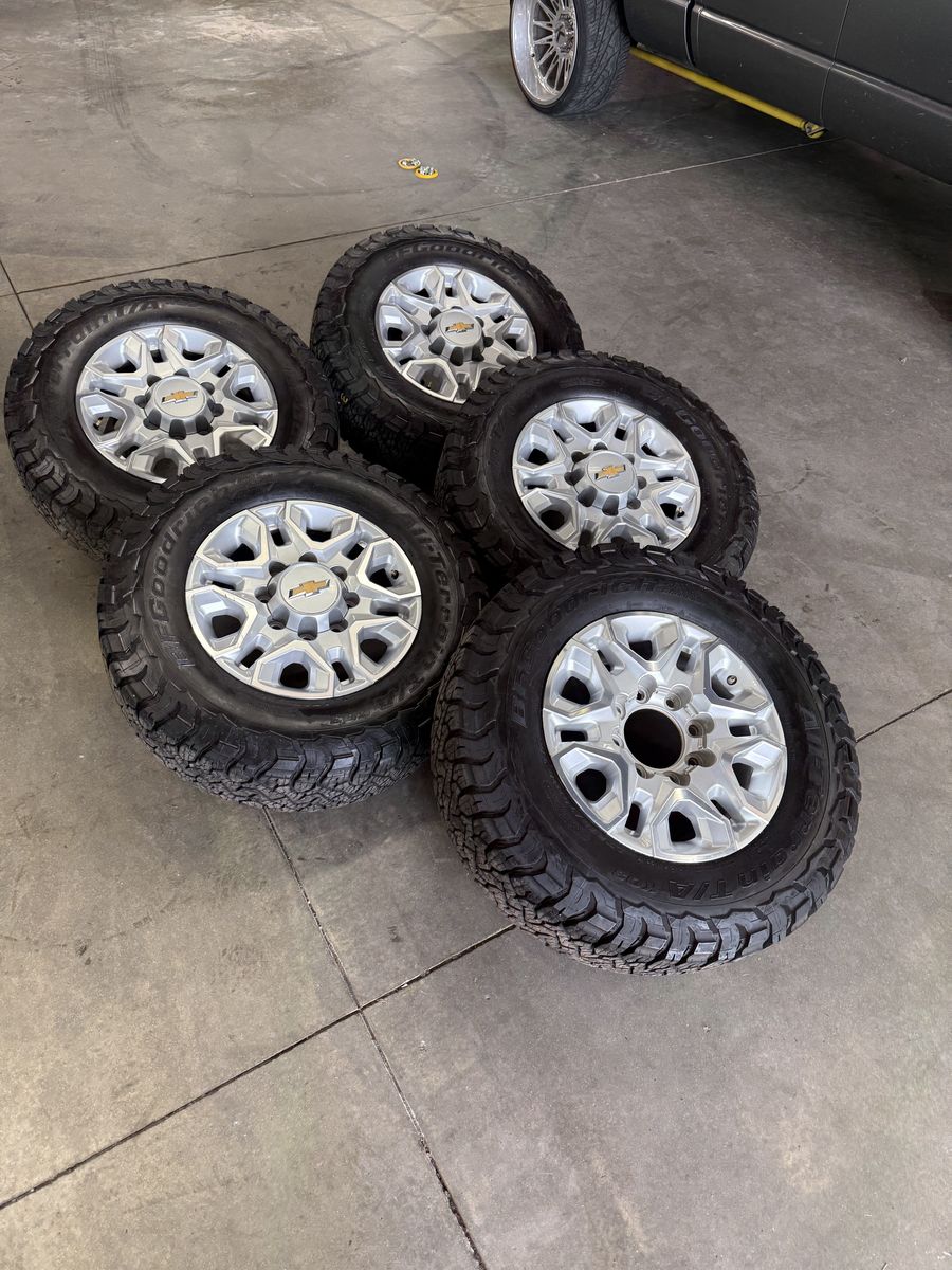 Wheels are 18in OEM wheels off a 2024 Chevy 3500, OEM snowflake wheels, full set or matching 5. All of the wheels are in great shape, no curb rash, dings or major damage on them, all of the center caps are included and in like new shape. Tires are 275/70/18 BFGoodrich KO3, load range E, top of the line tires, no patches or plugs in them, tires are all in great shape with about 70-75% tread life left.