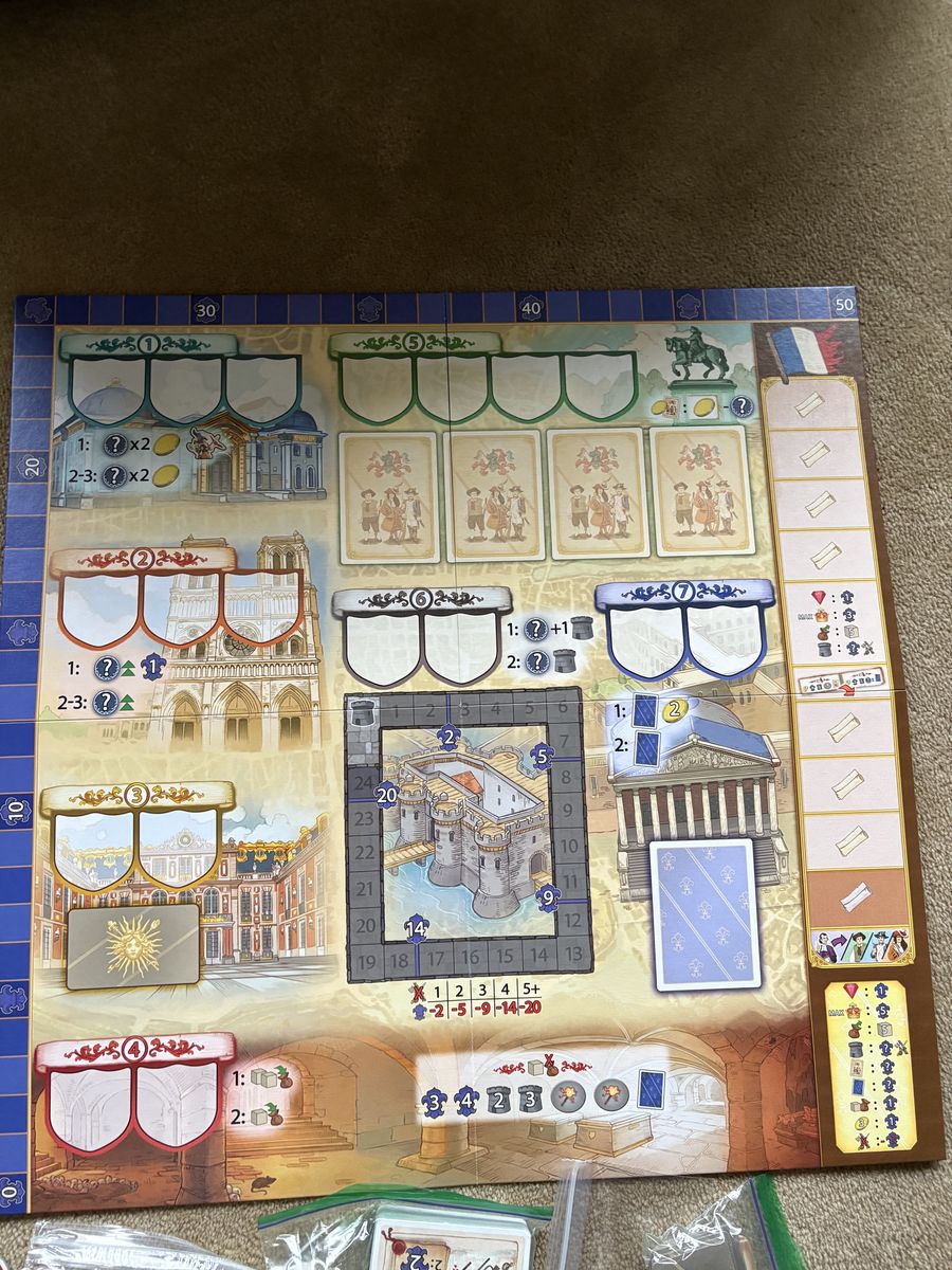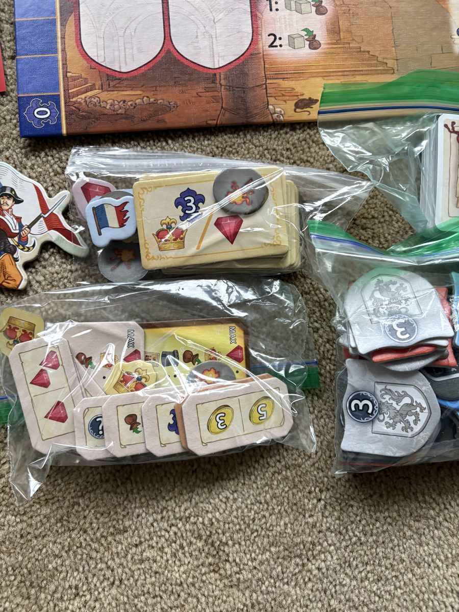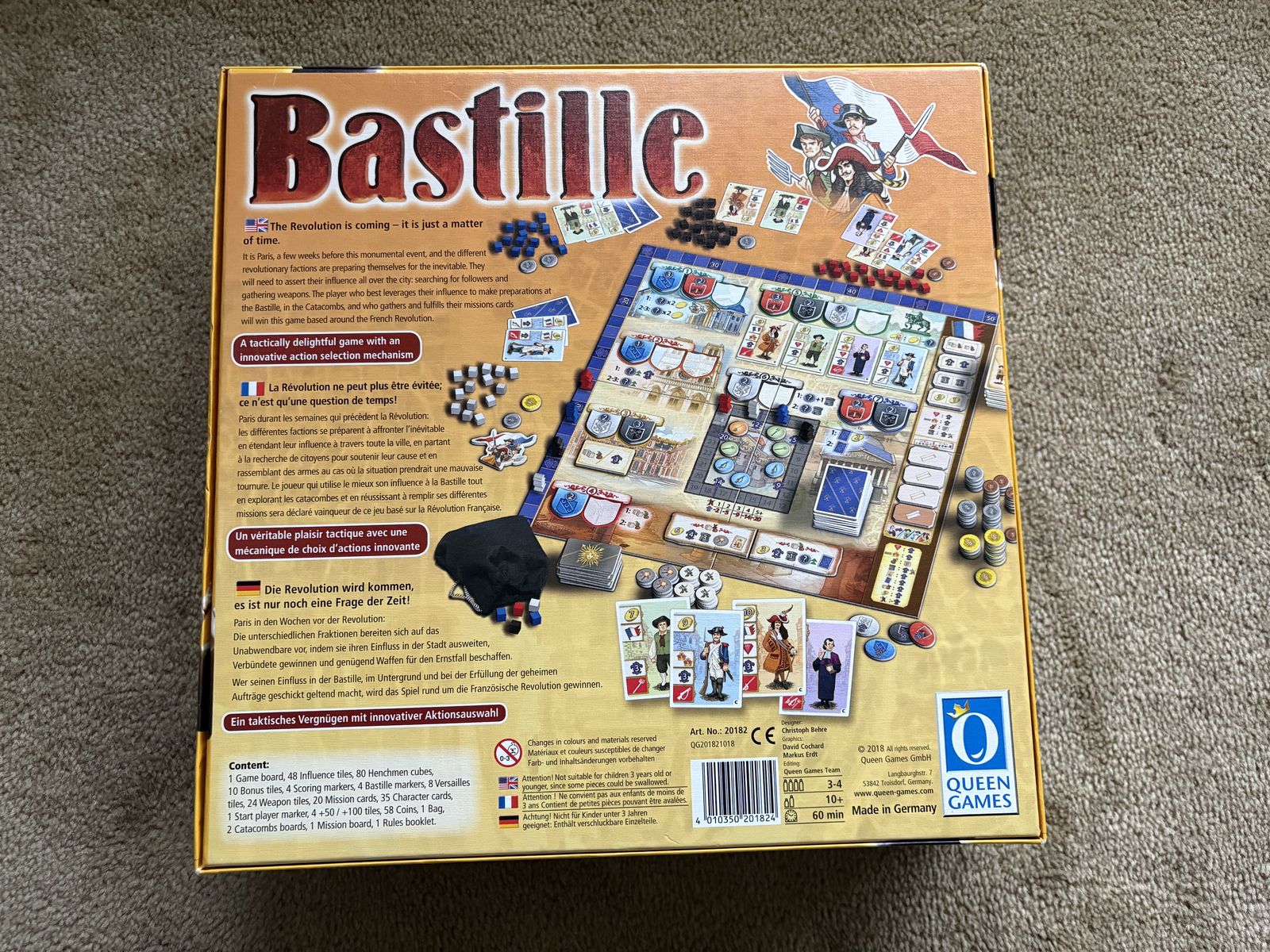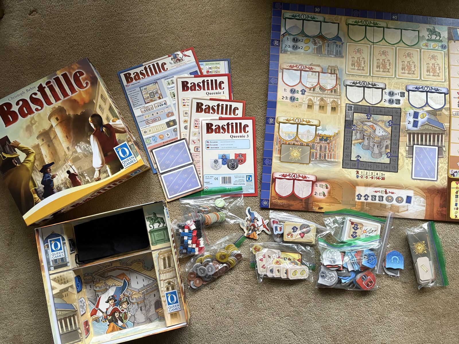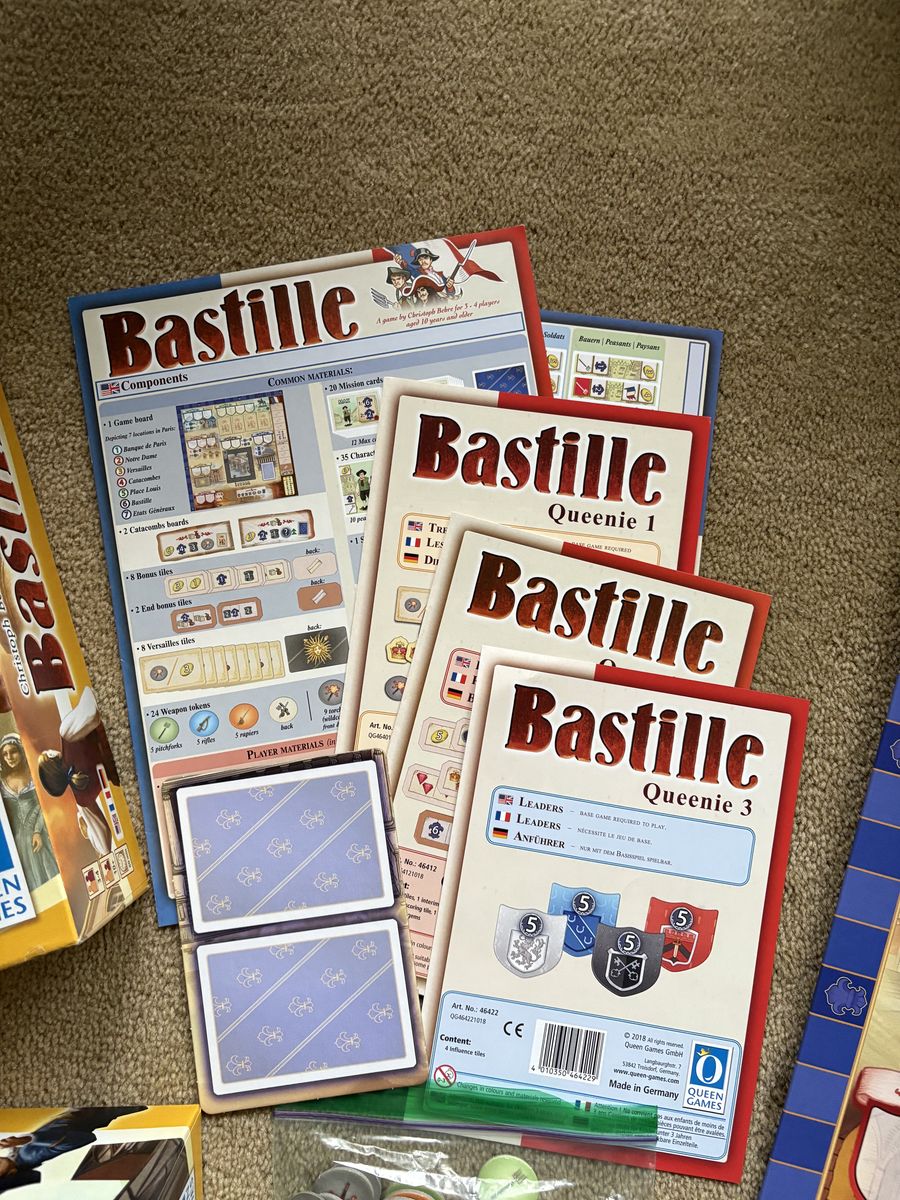 COMPLETE Bastille Board Game with all 3 Queenies (Expansions). The Revolution is coming—it is just a matter of time. Queen Games, 2018. 3-4 players, ages 10+. High-quality game, made in Germany. Complete, no missing pieces (including 3 expansions). Excellent condition. Text only. Cash or Venmo. Discount on multiple items.