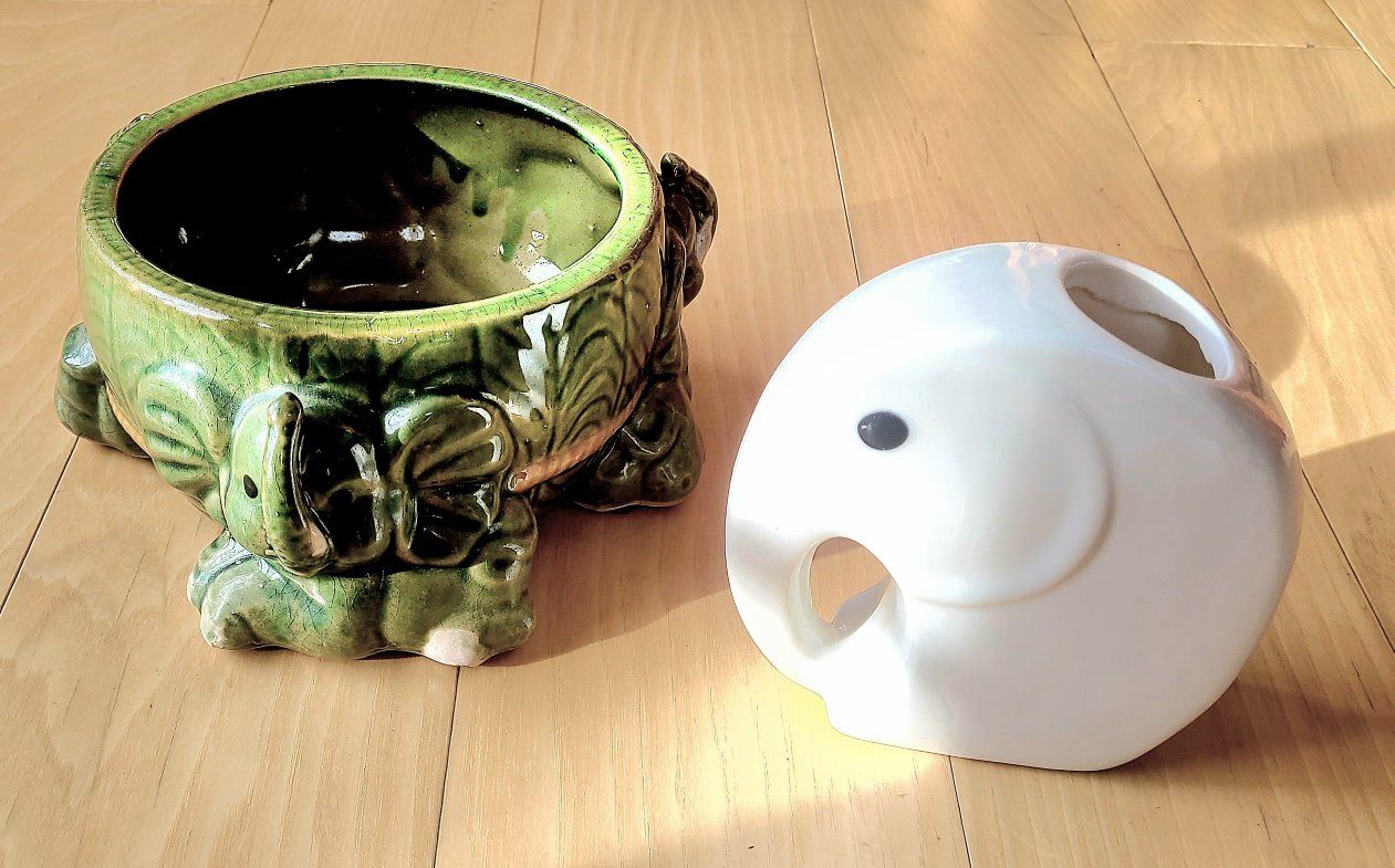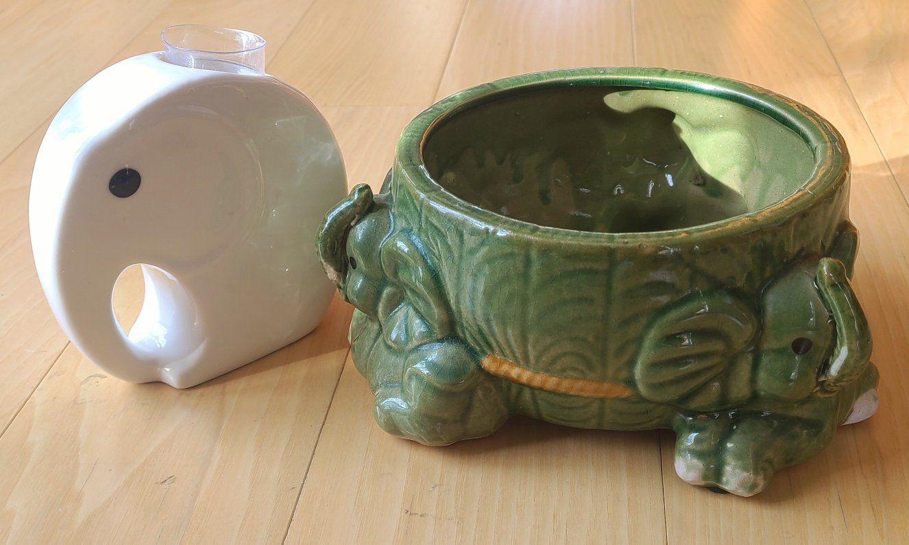 1 white ceramic for lucky bamboo. 1 green ceramic 3 elephants. Both are included in the price.
