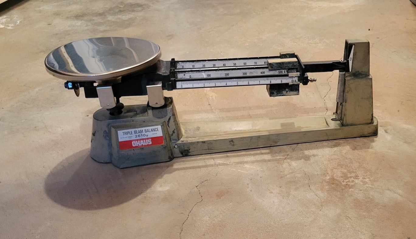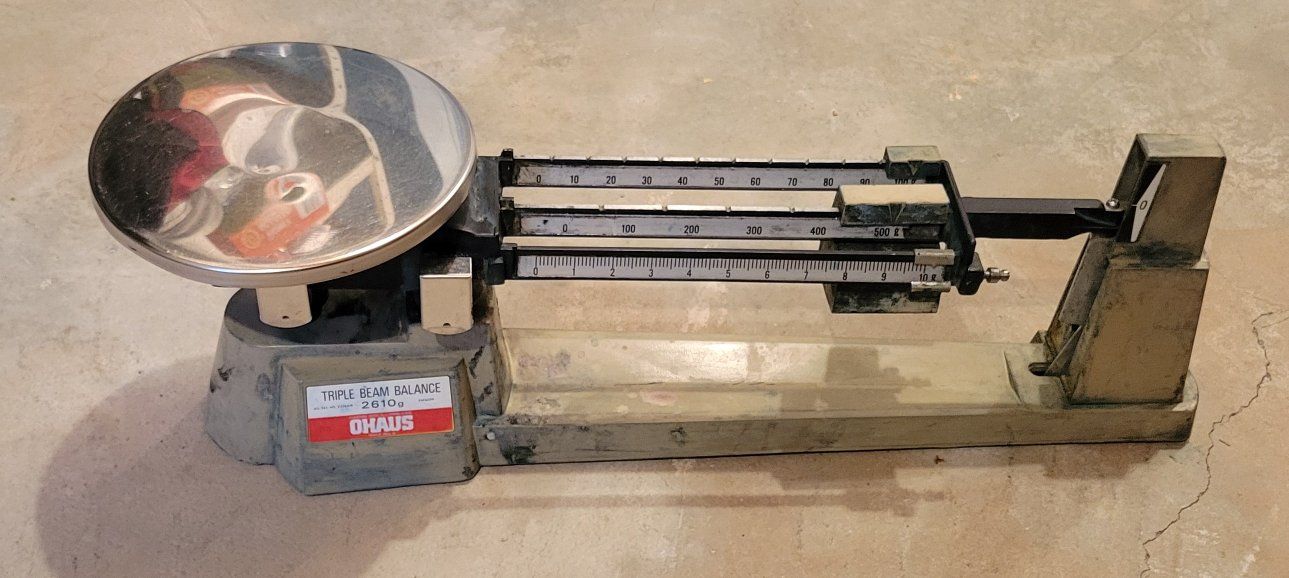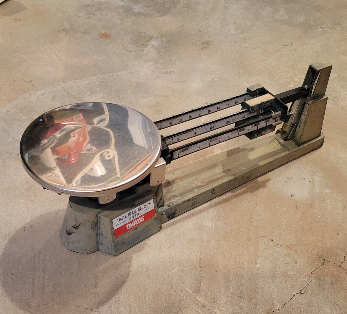 Triple Beam Balance Scale more pictures above. Some discoloration from age.