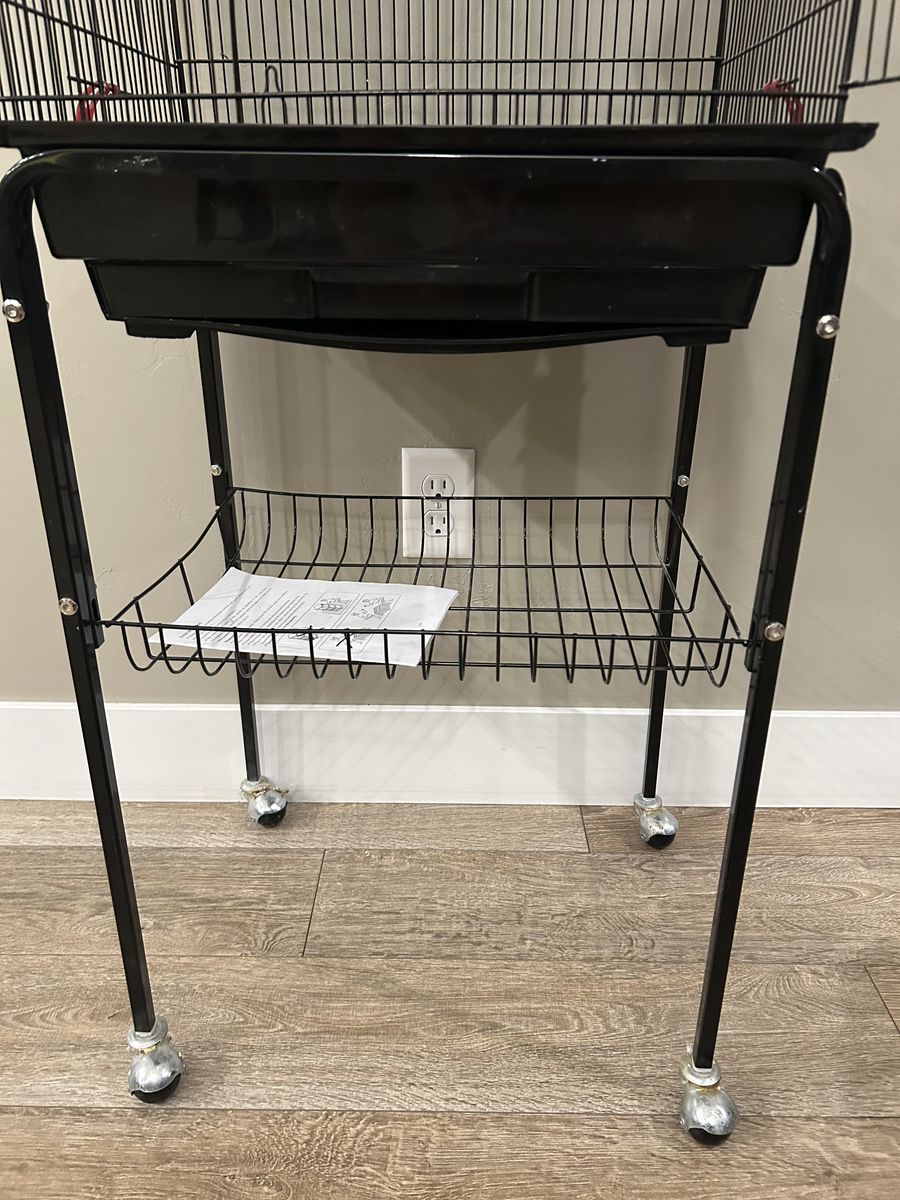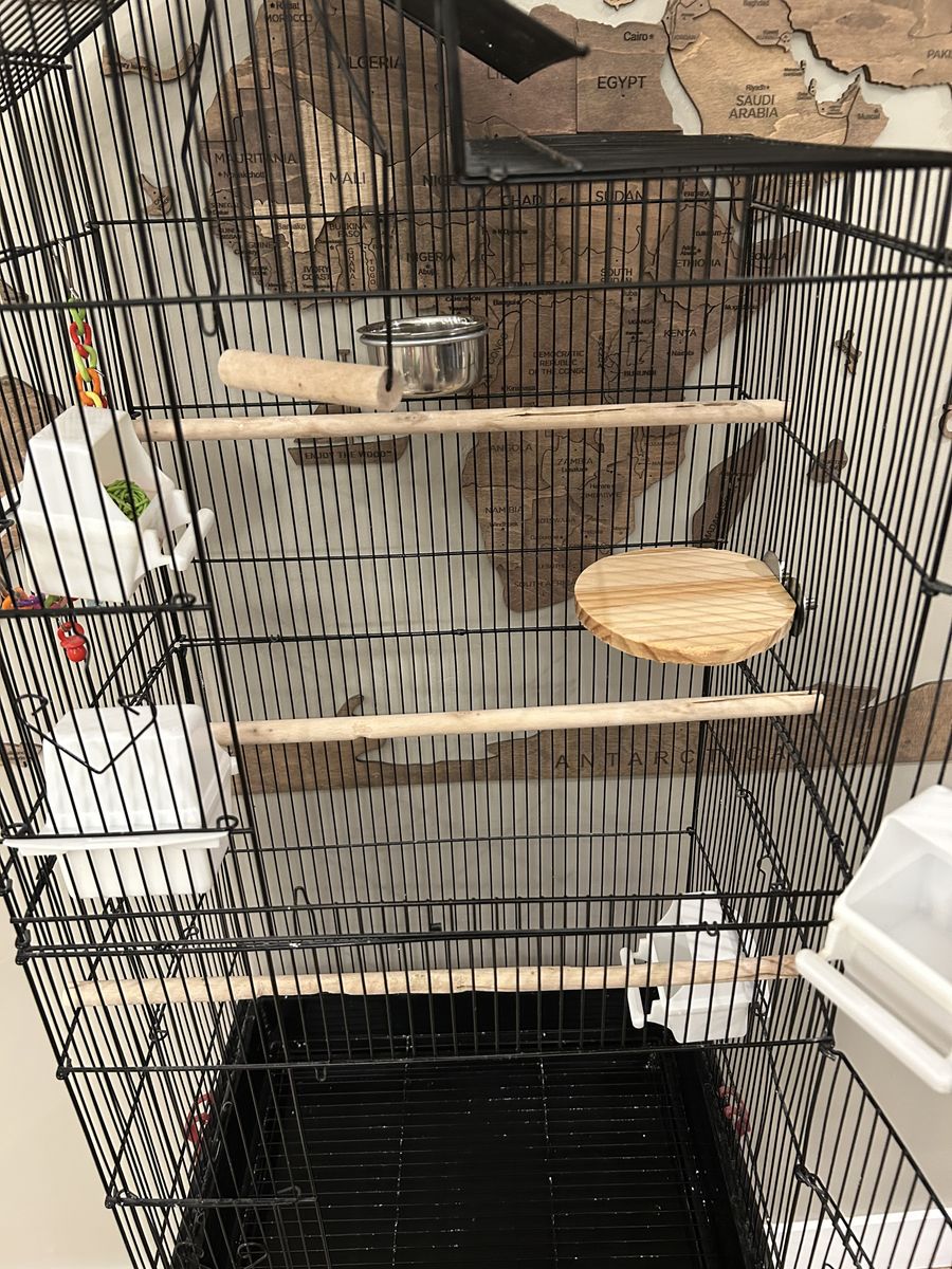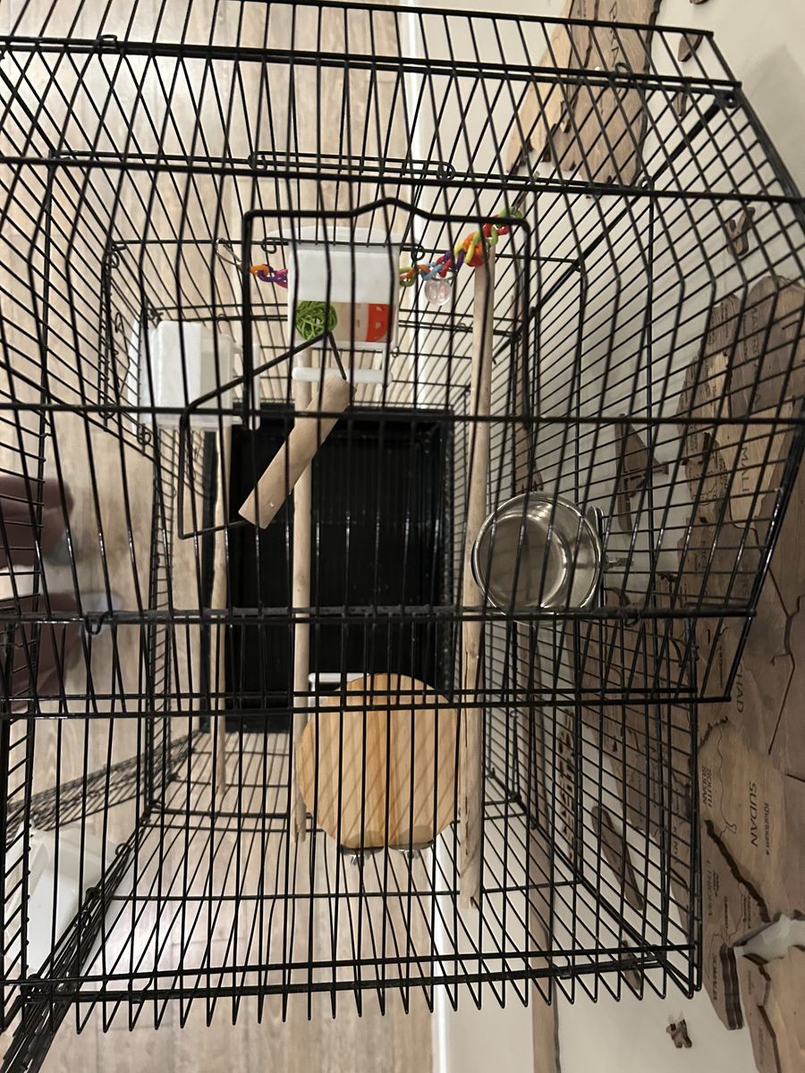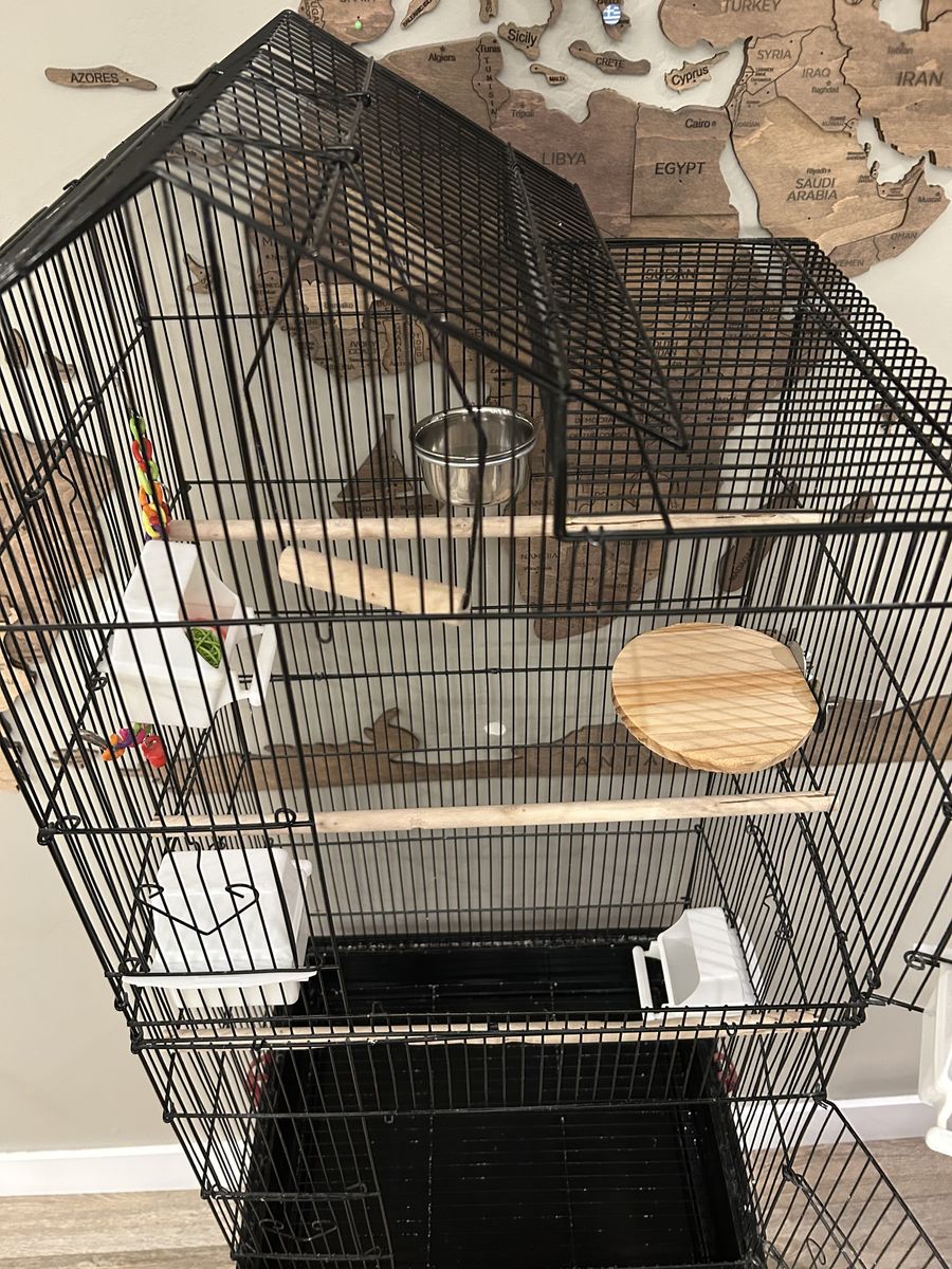 VenmoThis is a good birdcage for small birds like parakeets. My birds have been upsized for a few years and I no longer have any use for it. Recently cleaned, comes with some base perches and a few ball toys. Width- 17” Height (with stand) - 82”, Cage height- 39”, Depth- 13”.