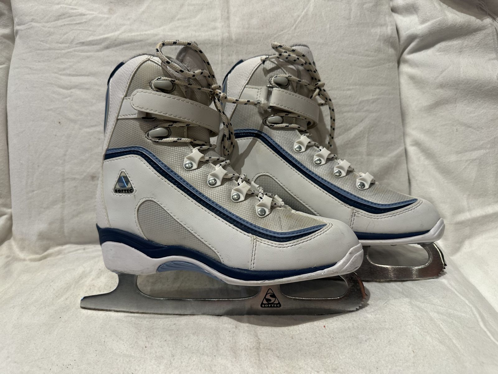 Softec by Jackson womens size 9 figure skates. These are white with blue trim and in good condition. Very good quality skates. See photos for details. I take cash or venmo but cash is preferred. text is best. 801-201-4446.