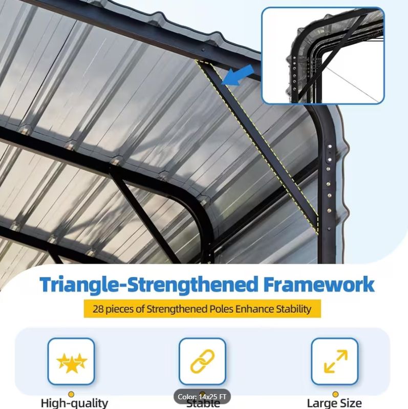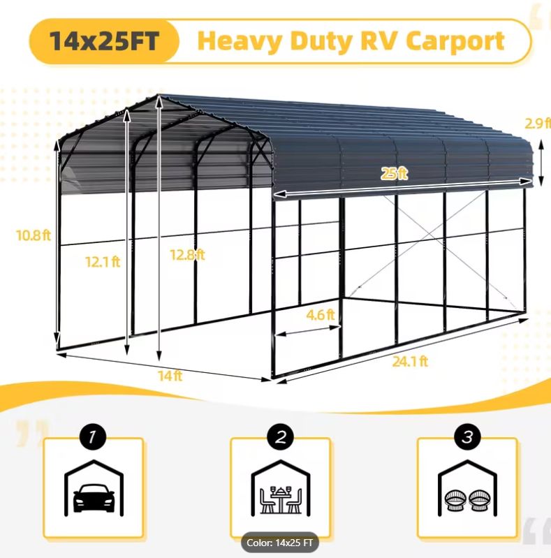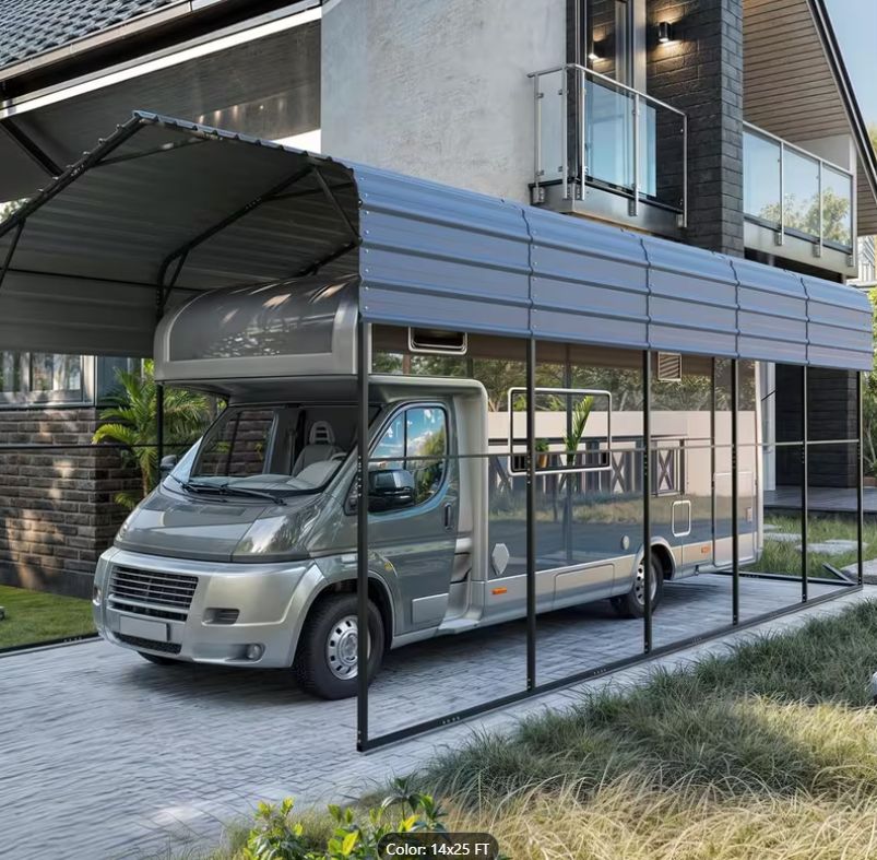 Double-High Hardened Steel RV Carport – 13x24x12'8 – Never Used We purchased this hardened steel carport in December and ended up not needing it. There wasn’t any real winter weather this year, so we took it down in January. It was never actually used. Dimensions: 13 ft wide x 24 ft long x 12 ft 8 in high It’s designed as a double-high RV carport, but it can also be set up as a single-high unit if preferred (see pictures). Either configuration works. All parts are included — nothing missing. The harder frame sections are already partially assembled, so most of the heavy work is done. You just bolt the main sections together and install the steel roof panels last with a ladder. The disassembled parts have been covered and kept out of the weather. No need to take anything apart — just load it into a truck, SUV, or trailer and go. $1,422 If you’ve looked at new ones, you know what they cost. This one is basically new without paying retail. Message me if you’d like to come see it.