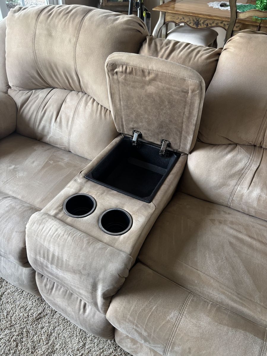 Works great! Cleans up easily. Has adjustable head rests and 2 USB charging ports (fastest in the house). Generous sized console for storage and two cup holders.