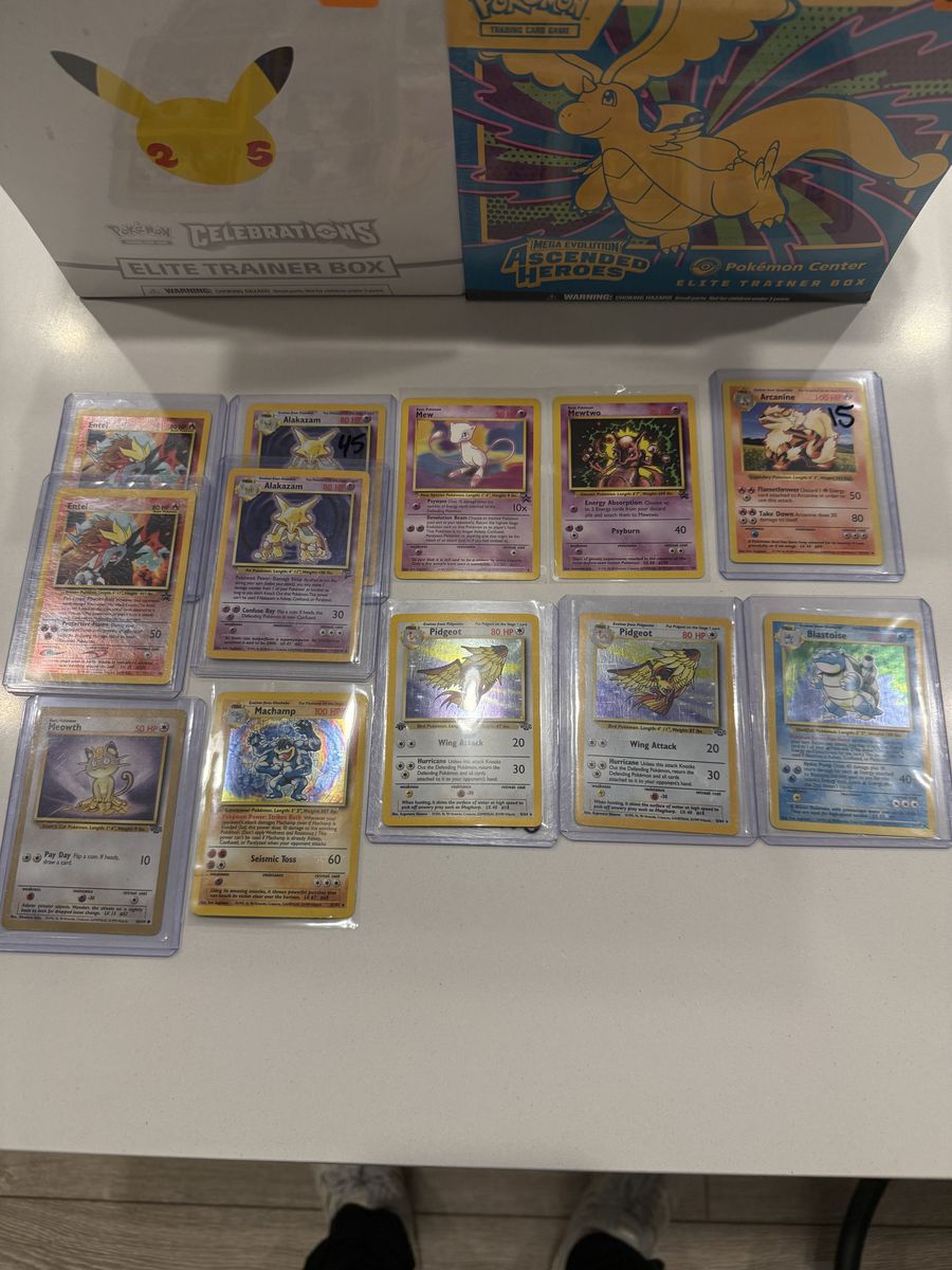 $30 entei $45 alakazam $5 mew promo black star $10 mewtwo black star promo $15 meowth golden border promo $15 machamp 1st edition $15 arcanine $100 pidgeot 1st edition $50 pidgeot unlimited $120 Blastoise base set