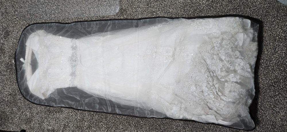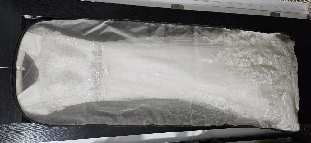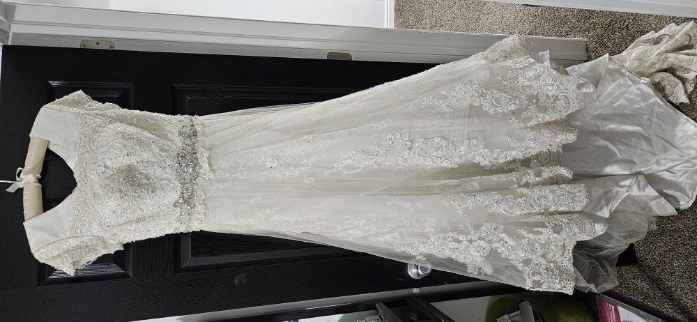 Off white a-line weddig dress from Hong Kong. This dress has lots of intricate lace and beading. The dress was only worn once, and doesn't have any damage.