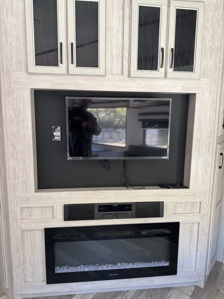 Theater seating + fireplace + big TV