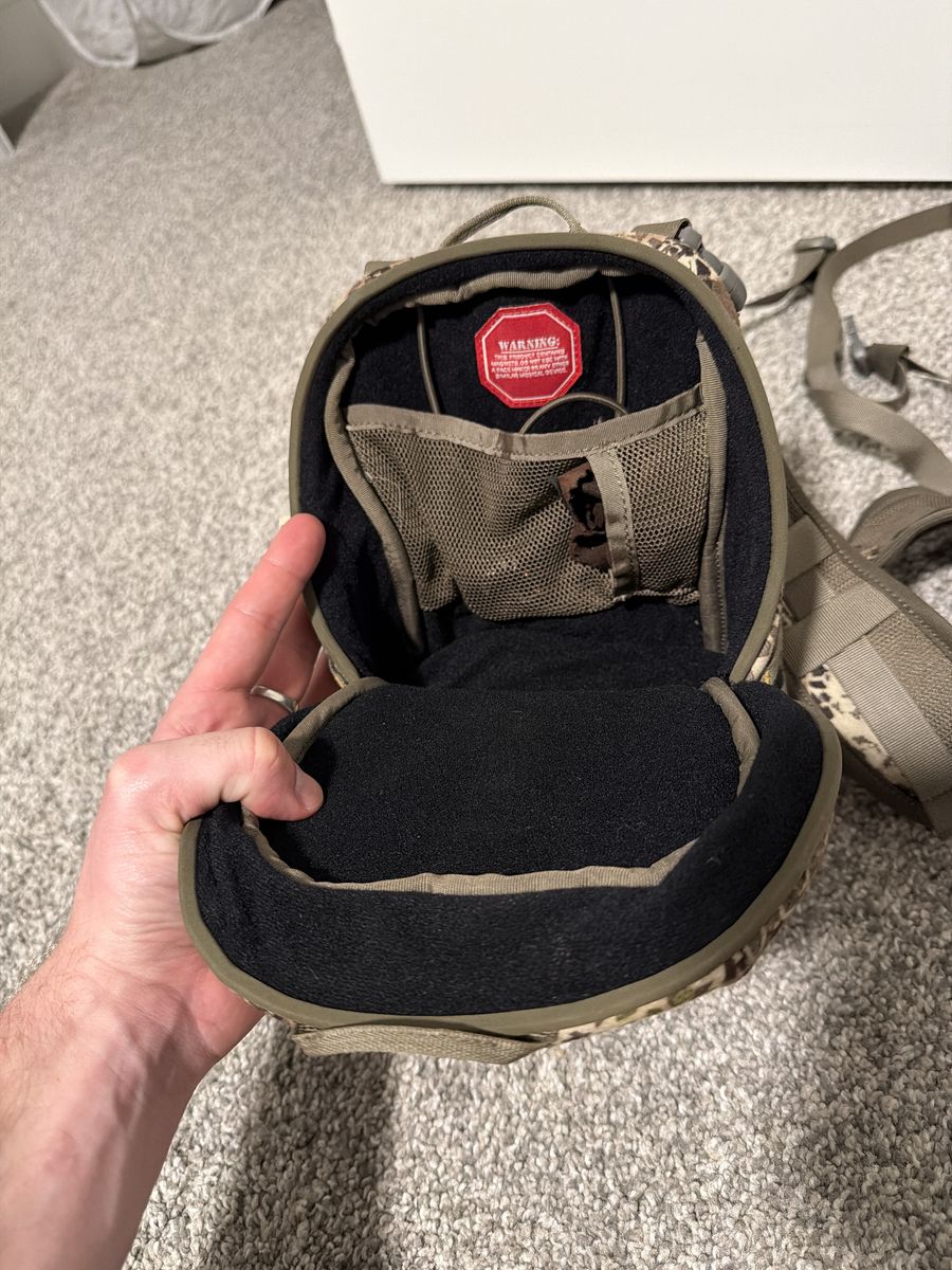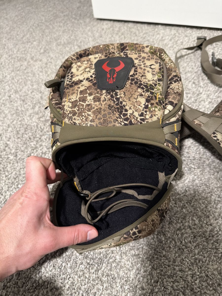 VenmoAdjustable bottom fits large to small binos, but definitely works best with medium or small sizes. Magnetic closures for top and bottom pouches. Comes with a built in rain fly that stows back into its own pocket in the harness. Good harness, practically new.