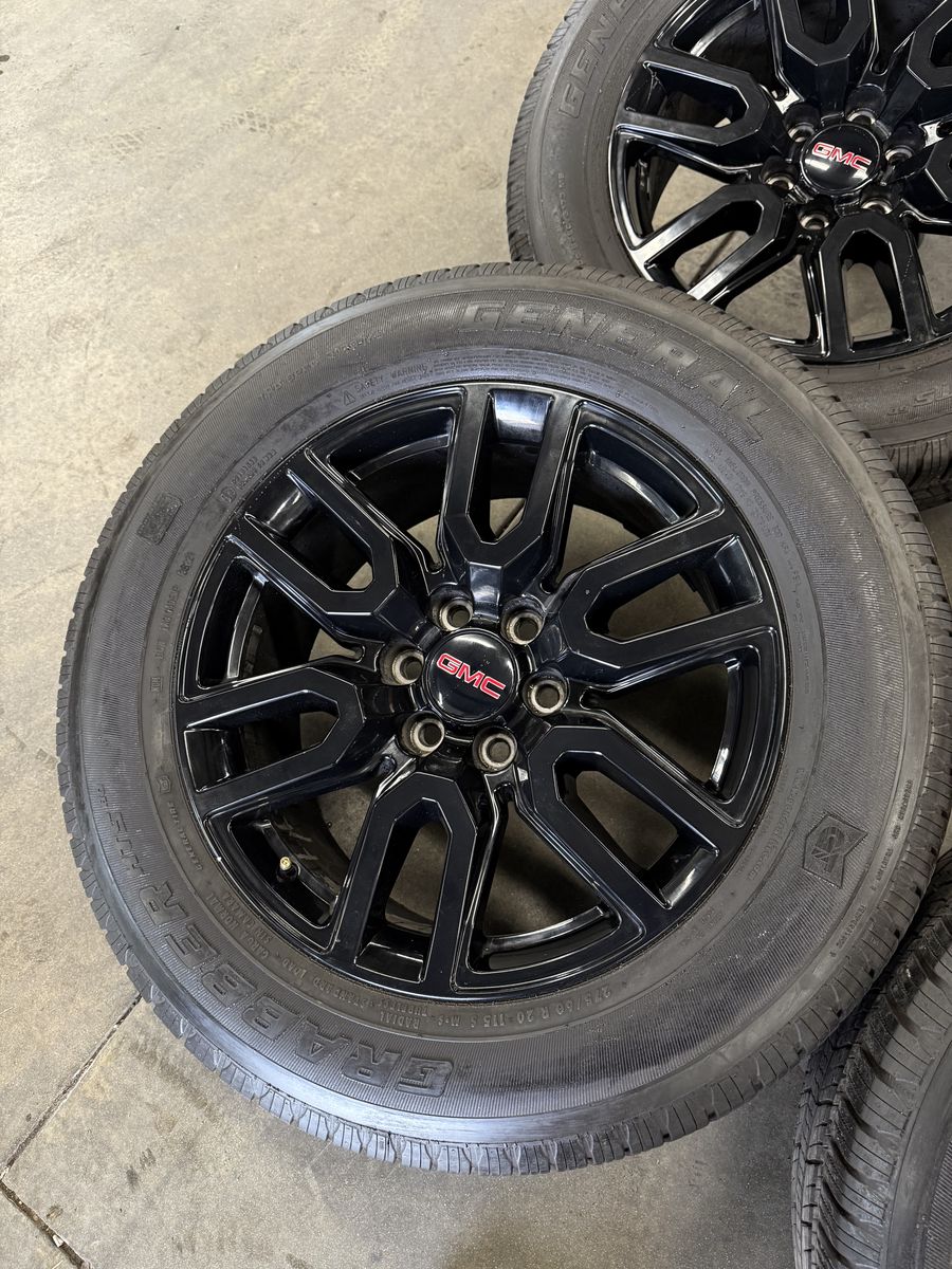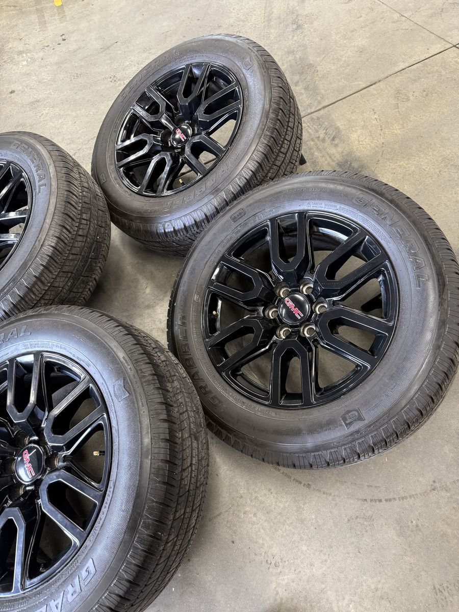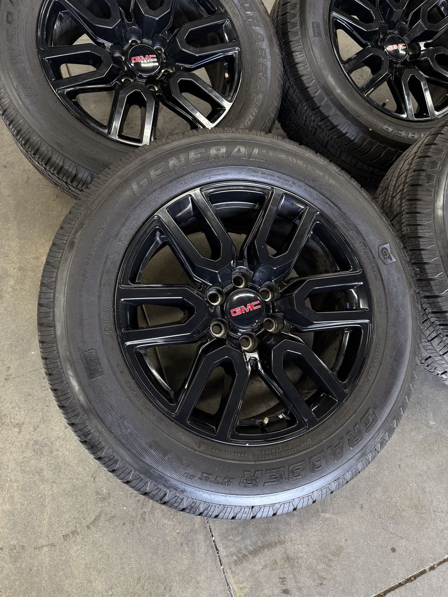 Wheels are 20in OEM wheels off a 2023 GMC 1500 at4 package. Wheels are in amazing shape, no curb rash or major damage, all of the wheels are in like new shape, and look great, all of the center caps as well as lugs are also included. Tires are 275/60/20 general grabber tires, amazing performing tires, no patches or plugs in them, all of the tires are in great shape, only 1500 miles on them so they are in like new shape.