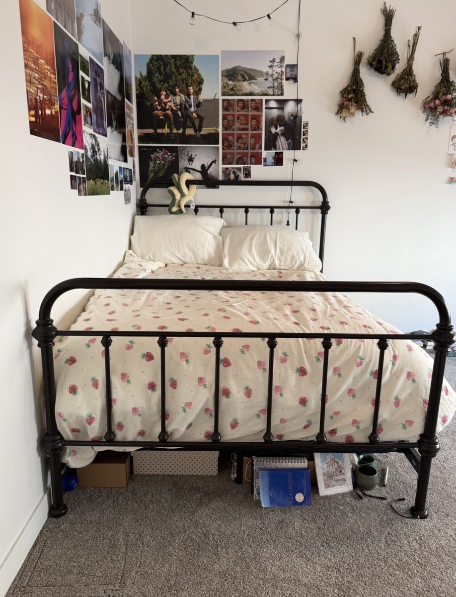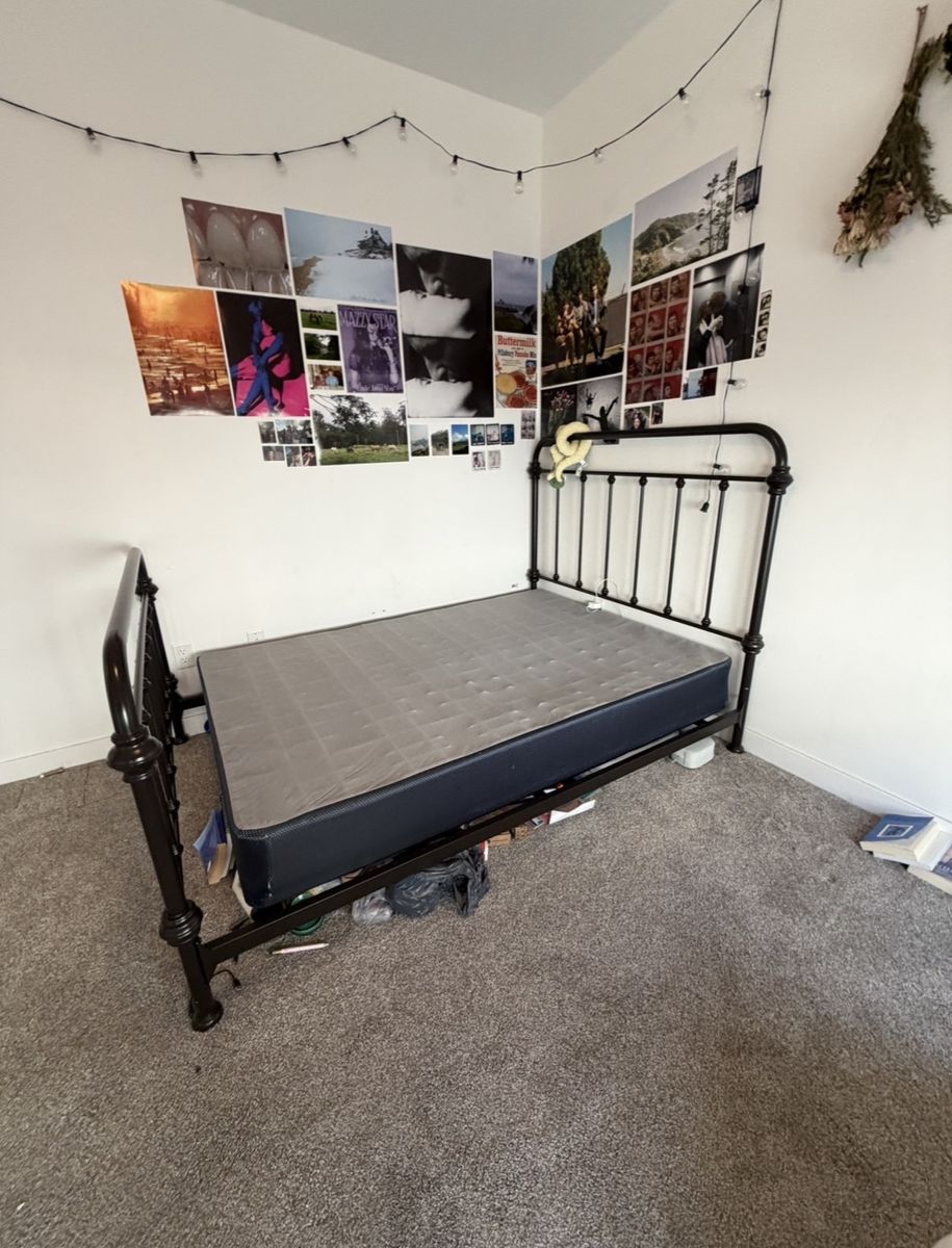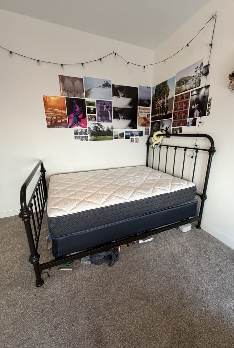 ZelleMattress (no stains), box spring, and bed frame for sale. frame can be unscrewed and taken apart for transport.