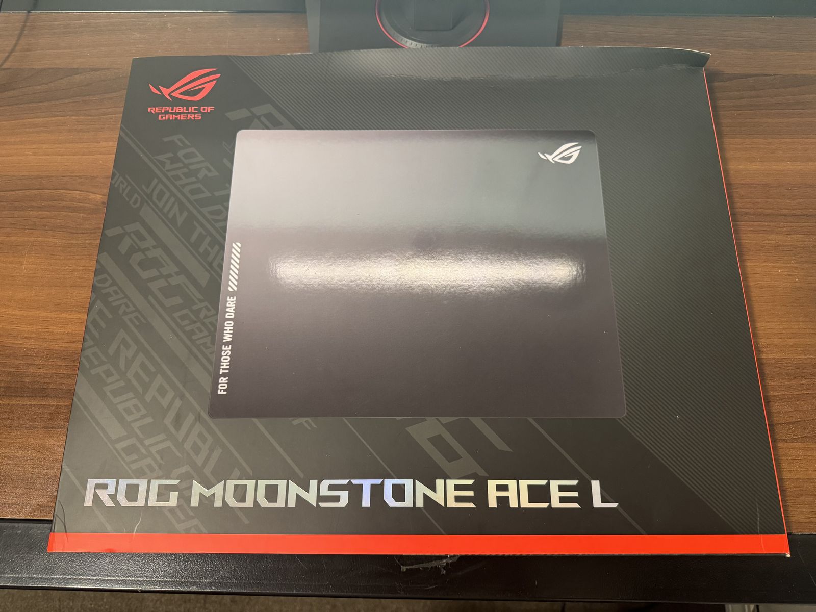 ROG Moonstone Ace L: • 500mm x 400mm / 19.7 x 15.7 • Tempered glass surface • Extremely consistent glide • Anti-slip base • Original box include