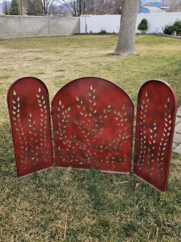 VenmoThis is a vintage red fireplace screen. Made from metal, with leaf cutouts, trifold, sturdy, and in great condition! Beautiful and will compliment most decor, or be a fantastic statement piece! Measurements tall 30", wide 24", deep 1", the wings are the same except each is wide 11 3/4". In excellent condition, no damage. From a smoke and pet free home. I'm moving from a house to an apartment. Please see my other lstings. Thank you