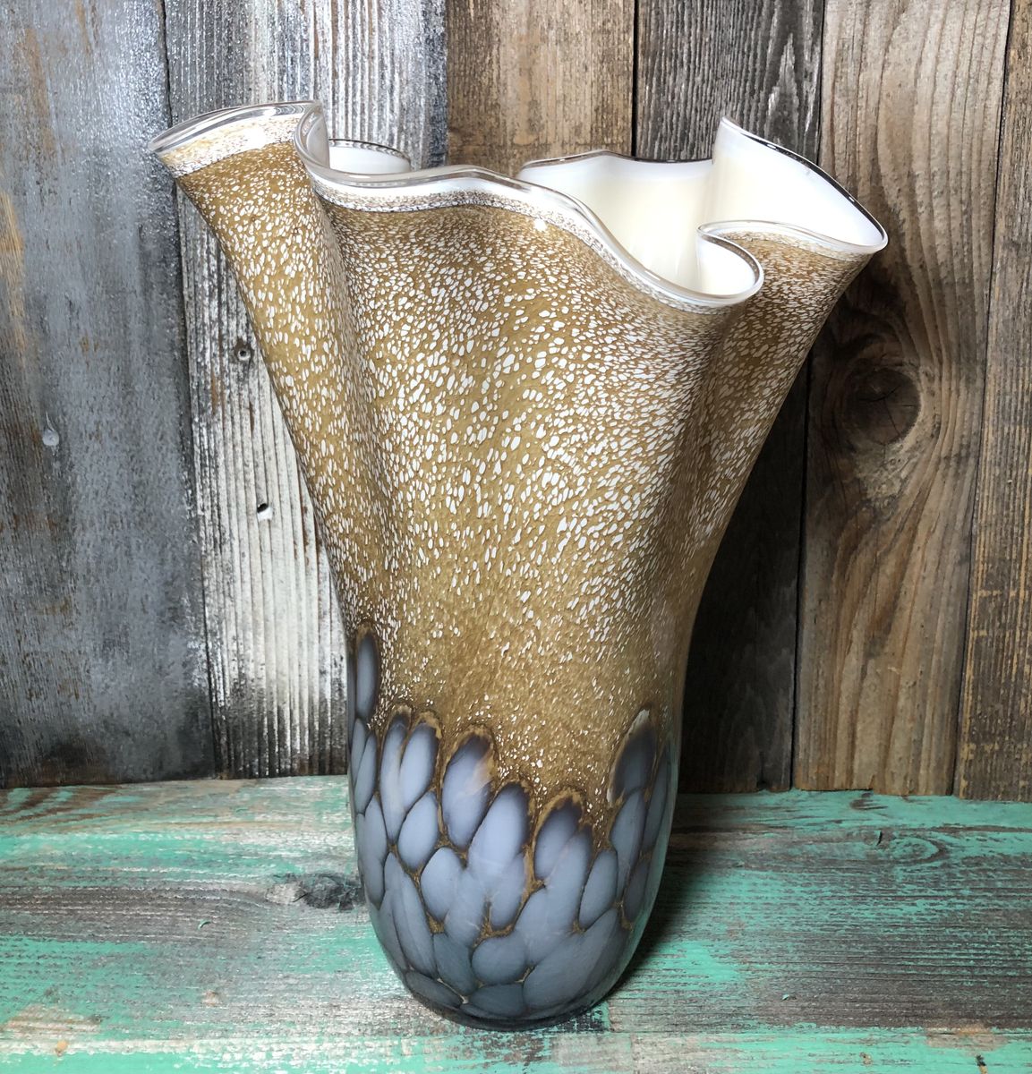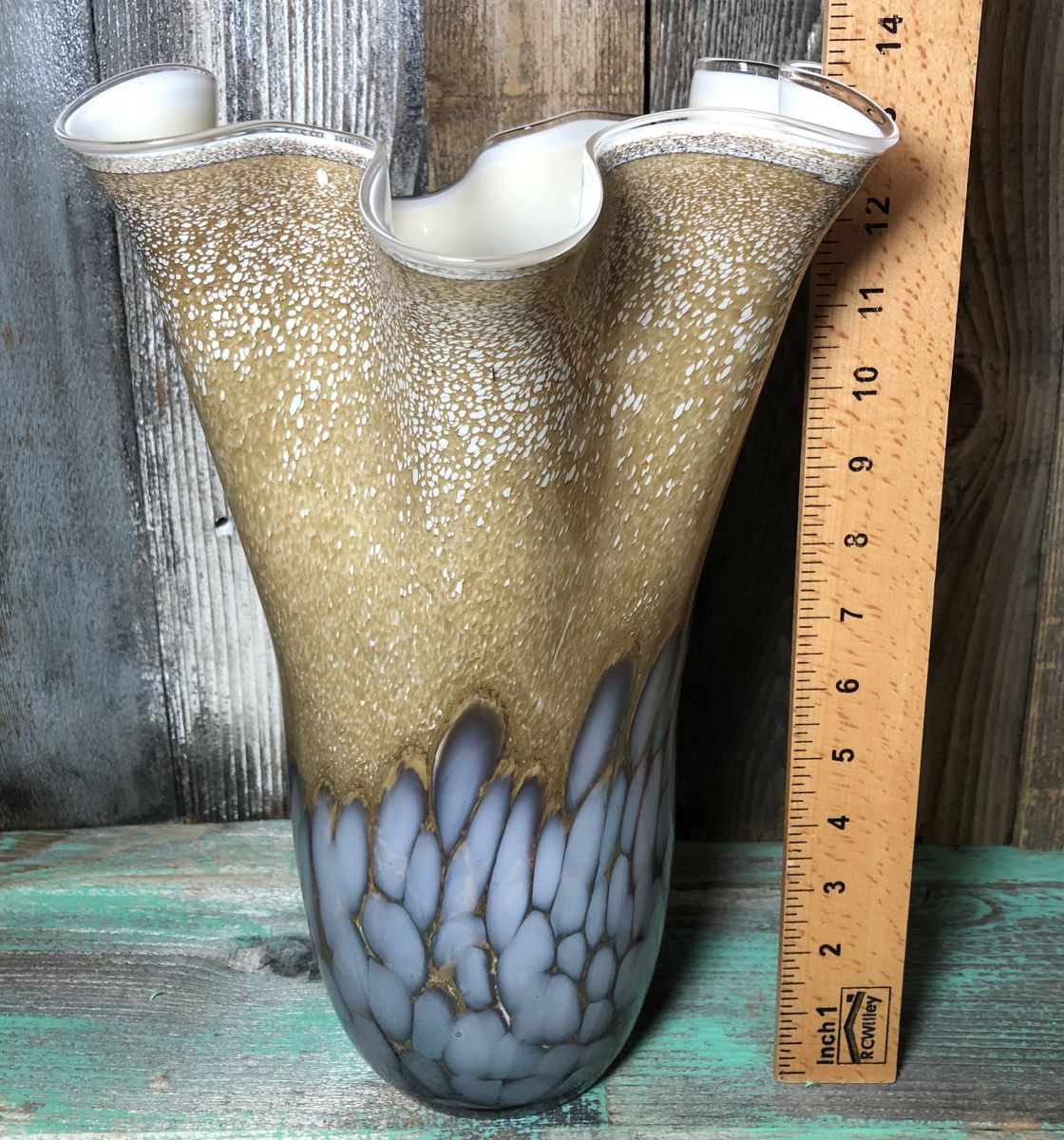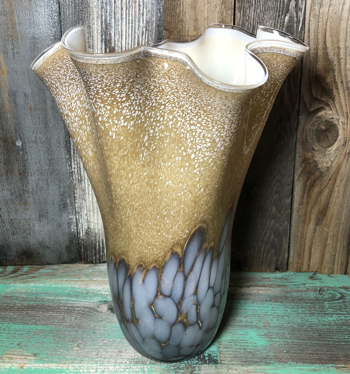 Large 14” tall Murano Style hand-blown encased art glass vase. this handkerchief vase has varied earthy colors with a balance between a bluish grey base that looks like “smooth River-rocks” transitioning to a fine grainy light brown texture interspersed with white ending in a clear rim. No cracks, chips or defects. Photographs are of the exact vase you are purchasing. Probably a one-of-a-kind. Delivery available to convenient location when in your area for $10.