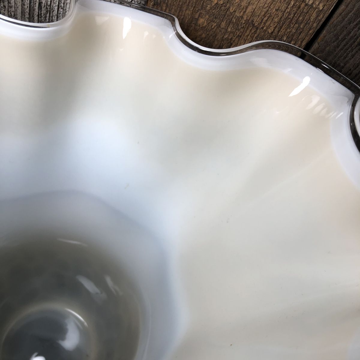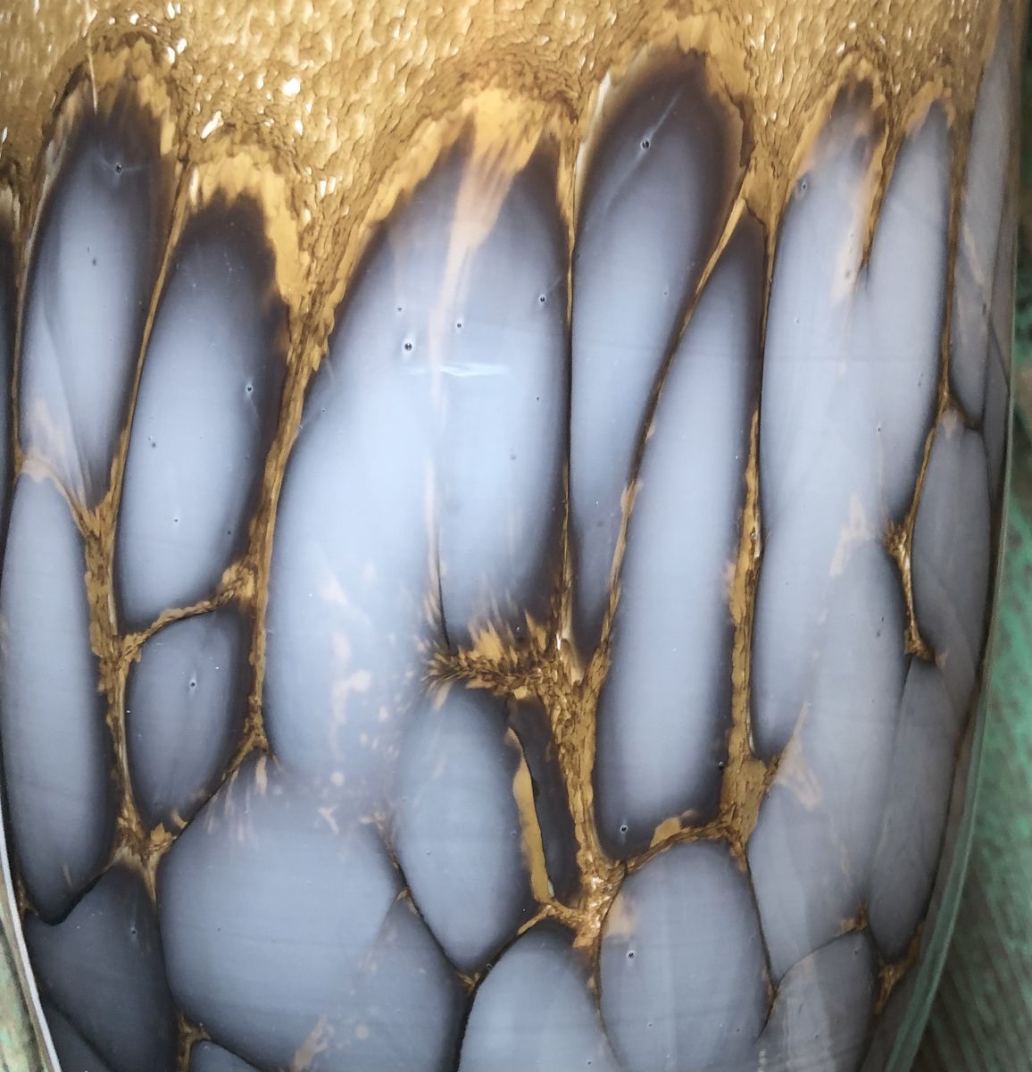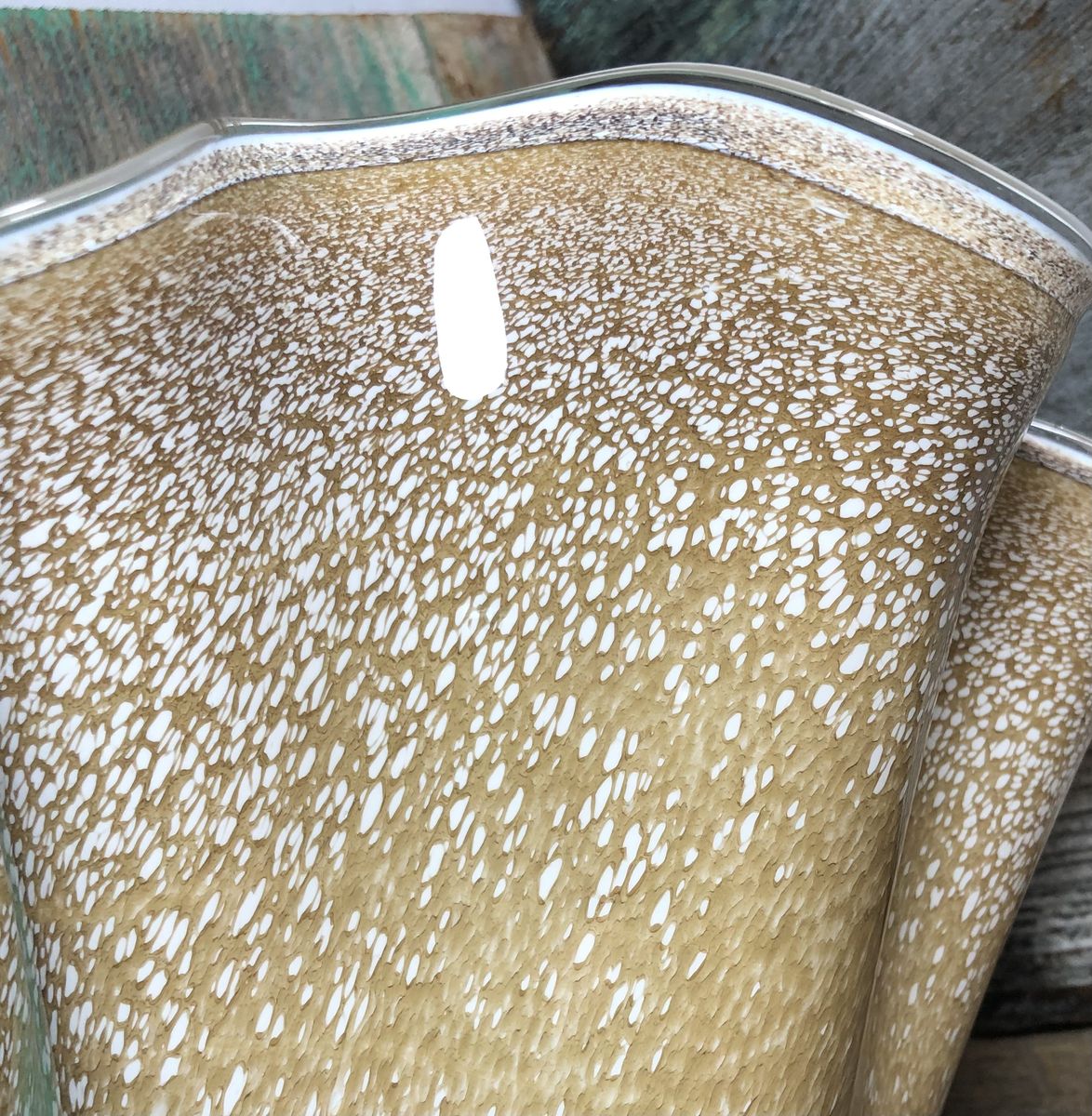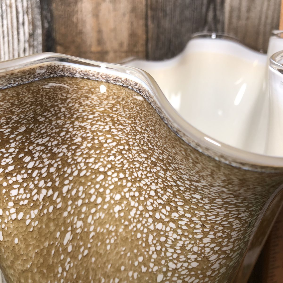 Large 14” tall Murano Style hand-blown encased art glass vase. this handkerchief vase has varied earthy colors with a balance between a bluish grey base that looks like “smooth River-rocks” transitioning to a fine grainy light brown texture interspersed with white ending in a clear rim. No cracks, chips or defects. Photographs are of the exact vase you are purchasing. Probably a one-of-a-kind. Delivery available to convenient location when in your area for $10.