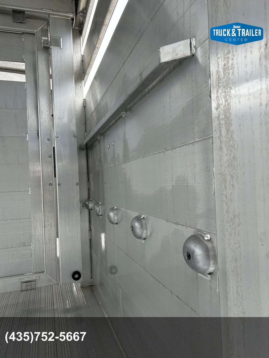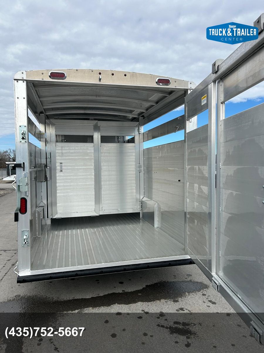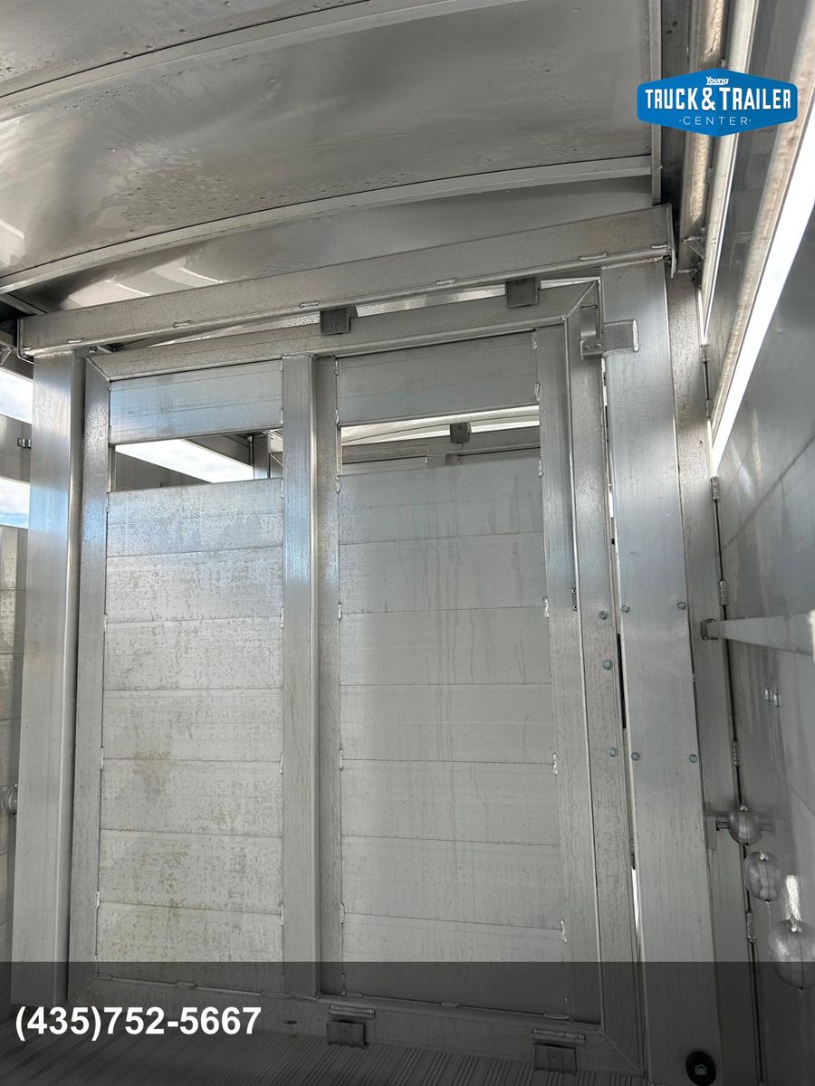 7X24 Stock Trailer Slider on Rear Door Rear Center Gate Full Swing with Slider Front Center Gate is a Roller with Slider Front Escape Door Nose Gate Tie Rails Inside Outside Tie Loops