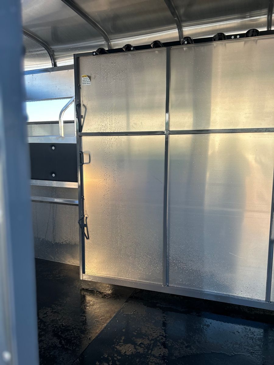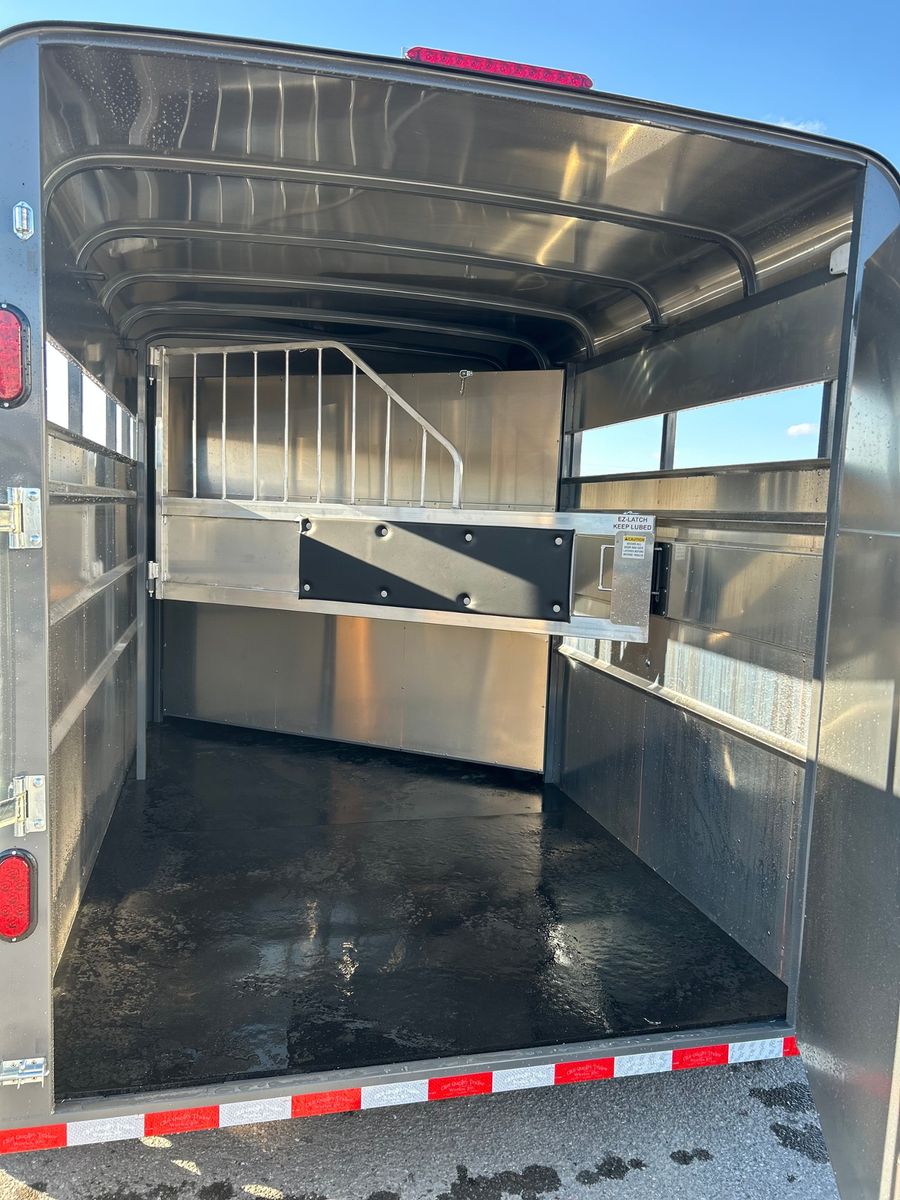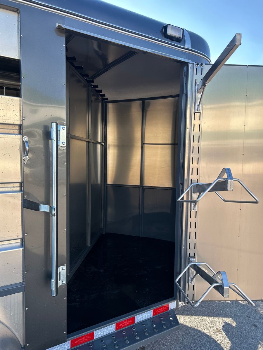 13' 2 Horse Has Swinging Bulkhead Wall Saddle Rack Swings out On Door Bridle Hooks Horse Area Has Floor Mats Aluminum Jail Bar Divider w/ Pad Spare Tire