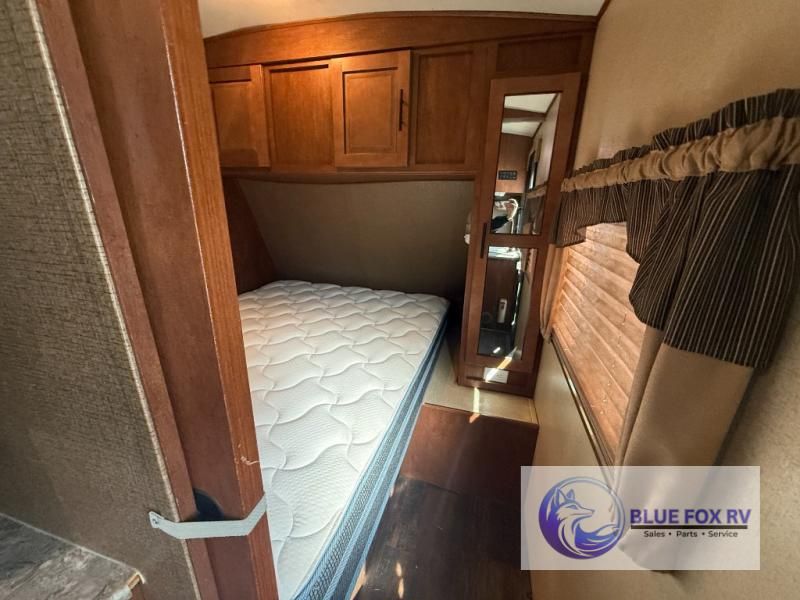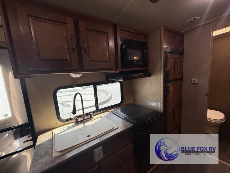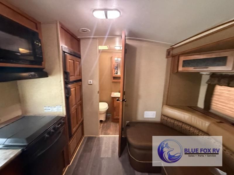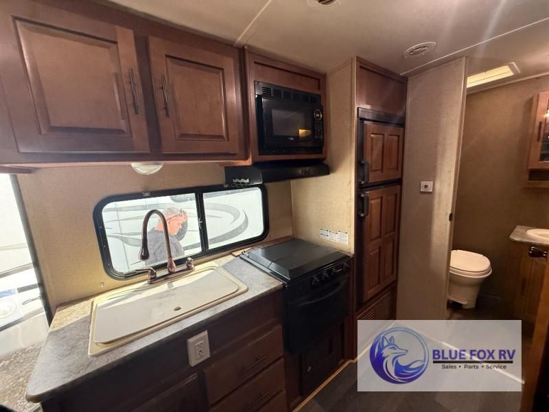 As you enter the travel trailer, to the left is a double kitchen sink, three burner range, and refrigerator. The opposite side of the trailer offers a slide with sofa, pantry, and a table. You are sure to enjoy the entertainment center.
