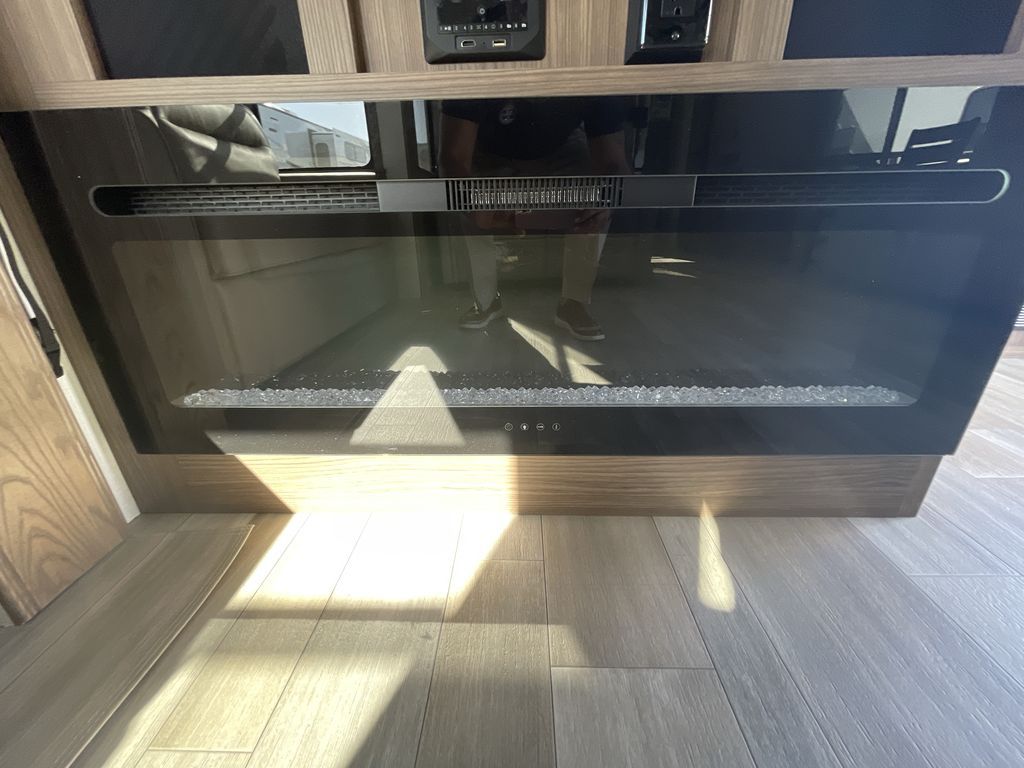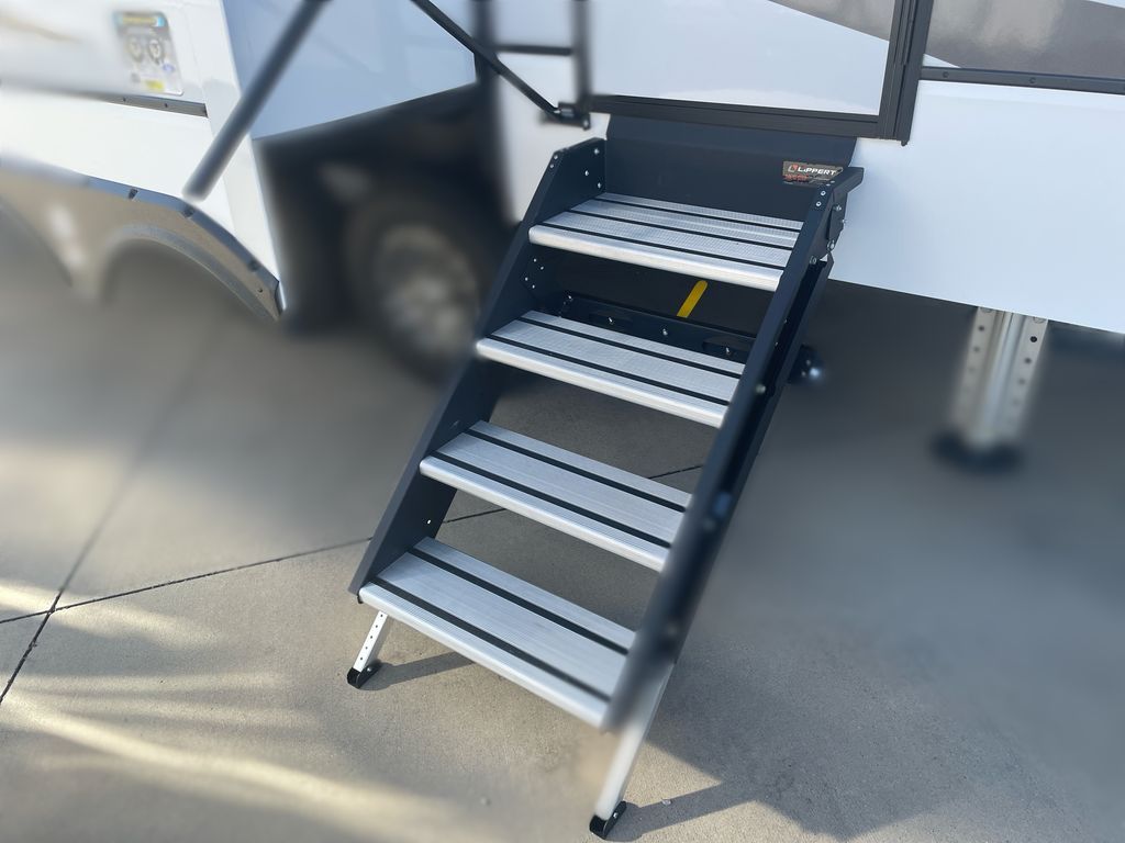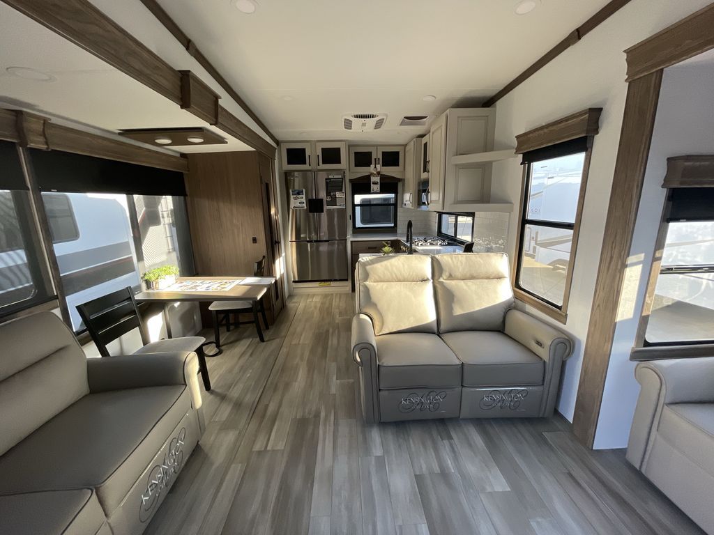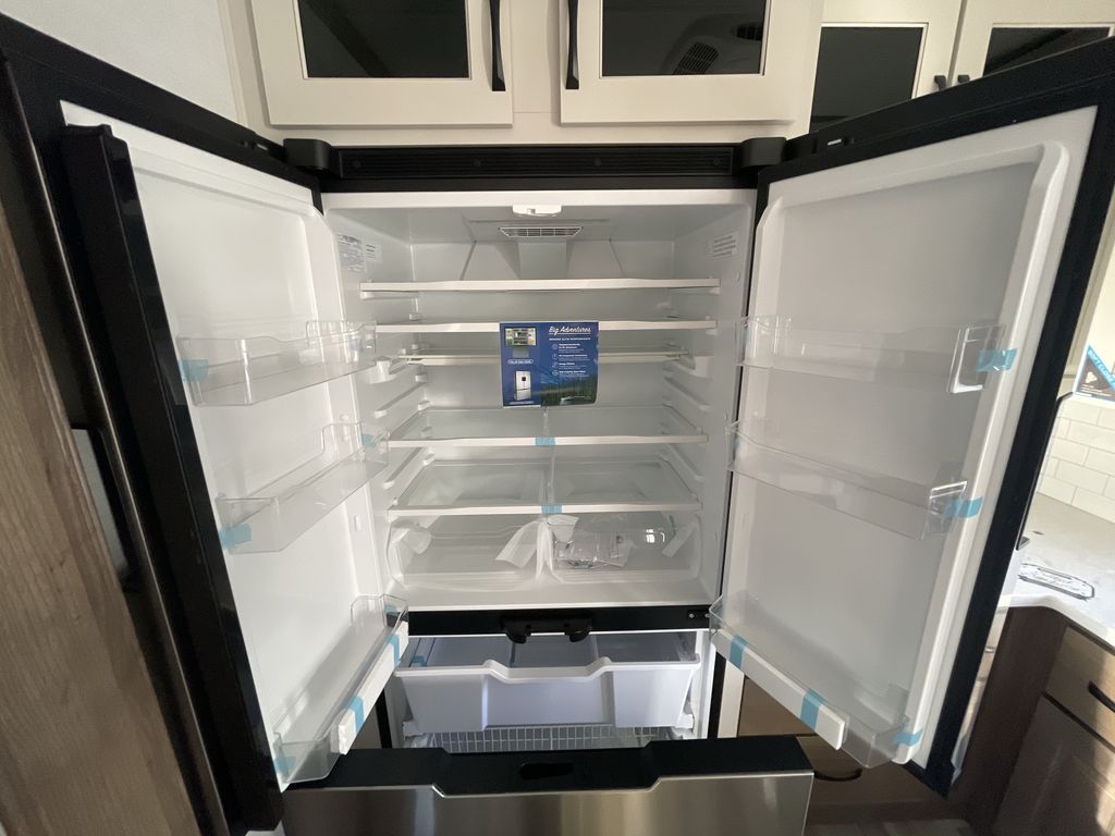 You won't want to camp any other way once you step inside this fifth wheel! the chef will enjoy all of the space in the rear kitchen with ample counter space, a 19 cu. ft. 12 volt residential refrigerator, and a pantry for snacks. Everyone will love to meet in the middle living area that includes dual sleeper sofas and a dual recliner loveseat across from the 50" Smart TV and fireplace. The half bathroom is nearby for quick bathroom breaks too. You will feel right at home in the master suite with a king bed slide to lay your head on at night, a flip top dresser with a Smart TV above it to watch your movies in true comfort, and a seat with storage, plus access to the front full bathroom. Inside the bathroom, you will find a 61" x 30" shower to freshen up in and a walk-in closet with a hamper, shelves, and washer and dryer prep for clean clothes throughout your entire trip!