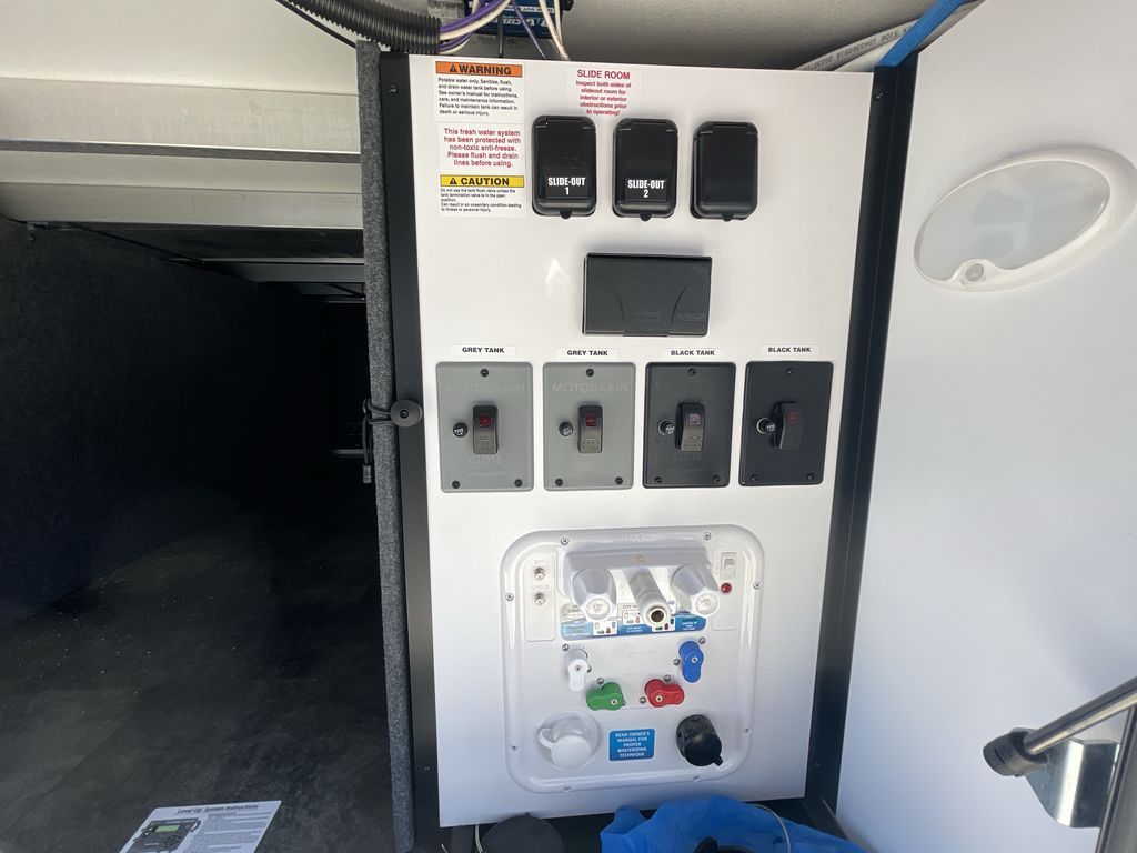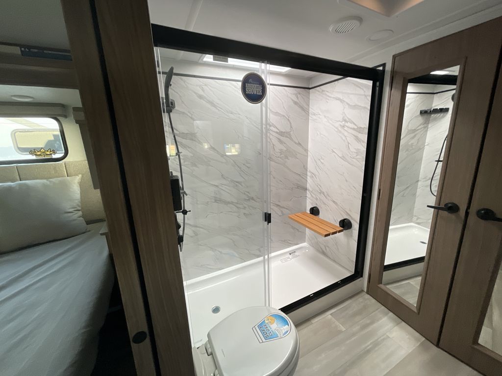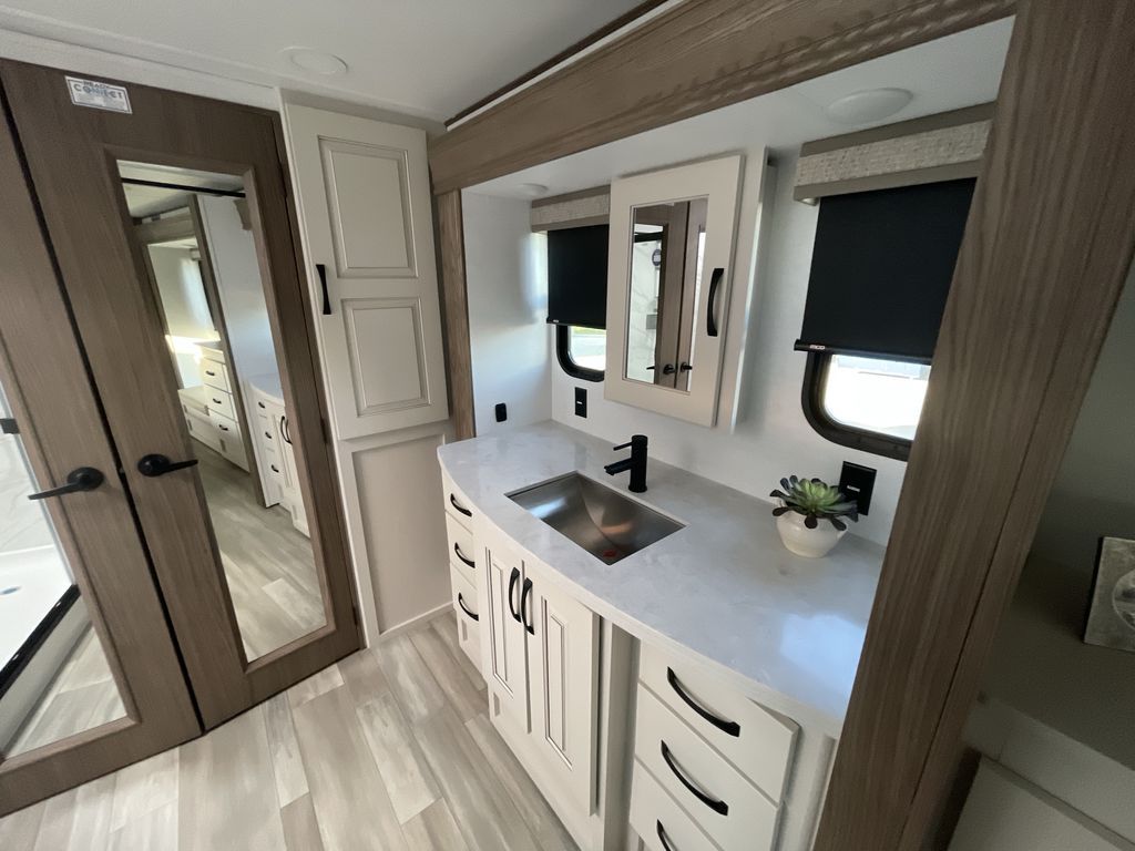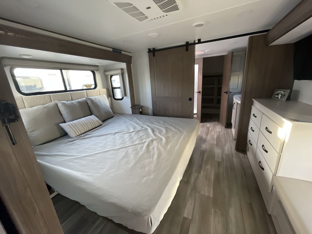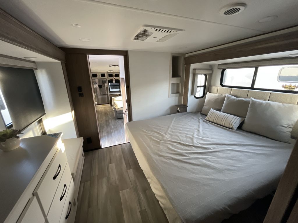 You won't want to camp any other way once you step inside this fifth wheel! the chef will enjoy all of the space in the rear kitchen with ample counter space, a 19 cu. ft. 12 volt residential refrigerator, and a pantry for snacks. Everyone will love to meet in the middle living area that includes dual sleeper sofas and a dual recliner loveseat across from the 50" Smart TV and fireplace. The half bathroom is nearby for quick bathroom breaks too. You will feel right at home in the master suite with a king bed slide to lay your head on at night, a flip top dresser with a Smart TV above it to watch your movies in true comfort, and a seat with storage, plus access to the front full bathroom. Inside the bathroom, you will find a 61" x 30" shower to freshen up in and a walk-in closet with a hamper, shelves, and washer and dryer prep for clean clothes throughout your entire trip!