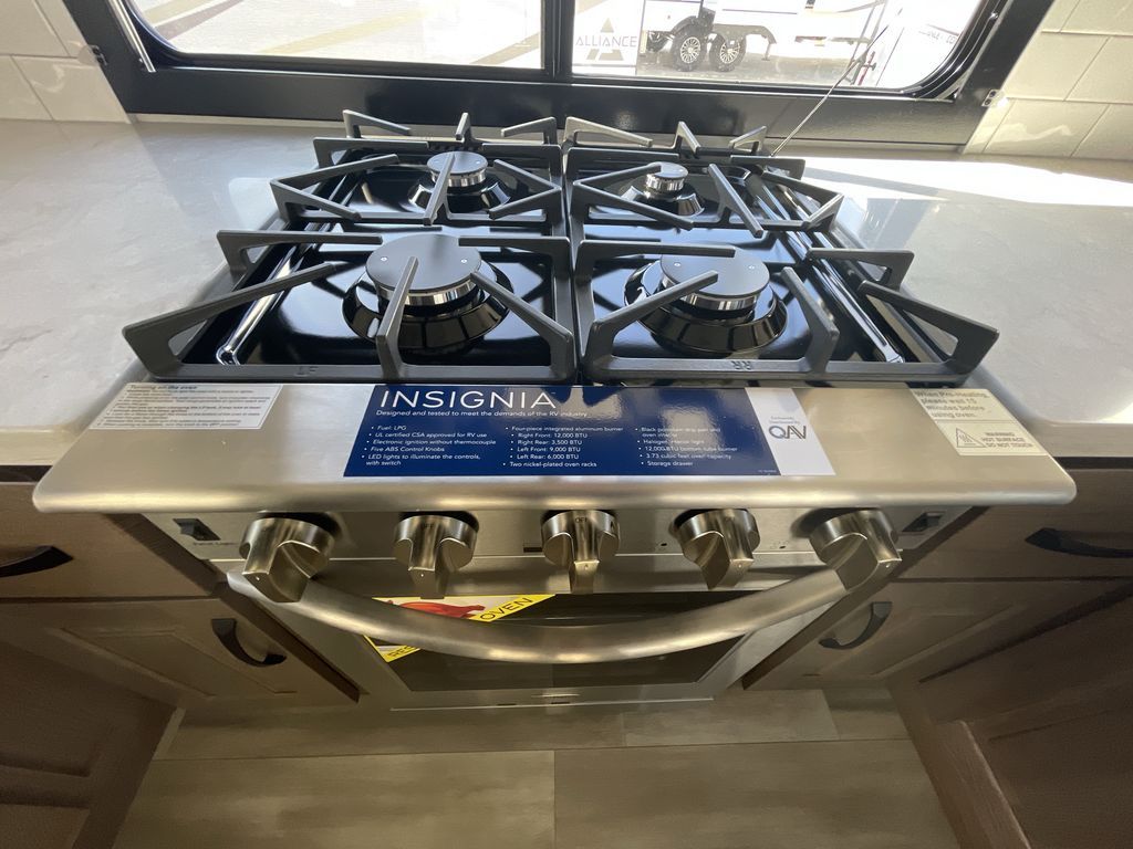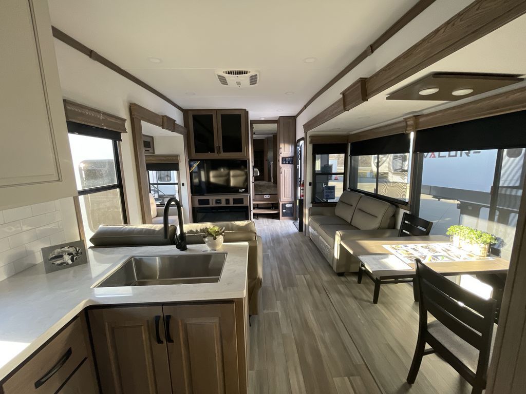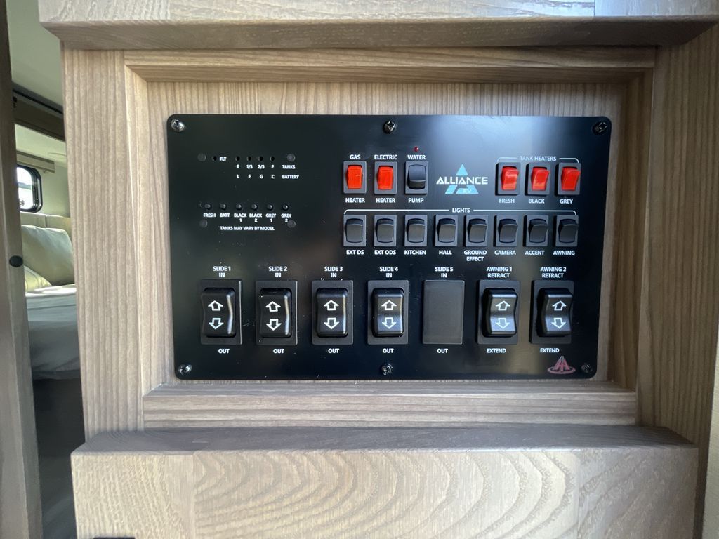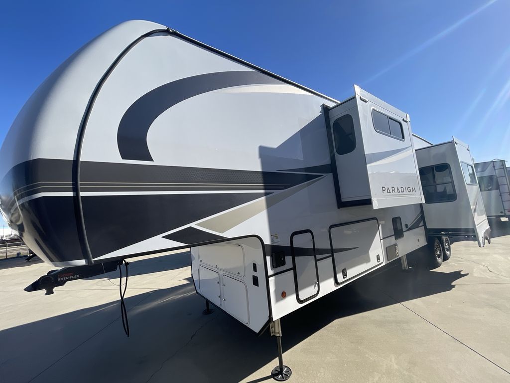 The Paradigm fifth wheels by Alliance RV are functional, high-quality, and luxurious for an unforgettable camping experience. There are three A/C units and a 40K BTU furnace to keep you comfortable year around, and you'll appreciate additional convenient amenities, like the all-in-one enclosed/heated utility center and the color coded and numbered wiring. A Helux Series coil spring pin box comes standard for hassle-free towing, along with Curt 8,000 lb. axles. You'll love the kitchen with its LG solid surface countertops and Lusso range, plus there is LED motion lighting in the pantry and a Maxx fan with a rain sensor to keep everything fresh when making dinner. Each model also includes an HD Smart TV in the living room and bedroom. And of course there are a variety of options you can choose from to further customize your fifth wheel; dual pane windows, Super Solar Plus, slide out awning toppers, and generator prep or a generator to name a few!