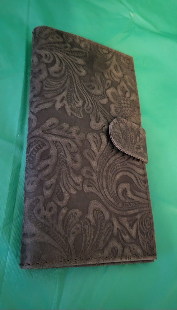 Brand unknown ~ genuine leather with embossed oak flower design ~ several pockets ~ checkbook flap ~ space for credit cards & ID ~ new in package, never used.