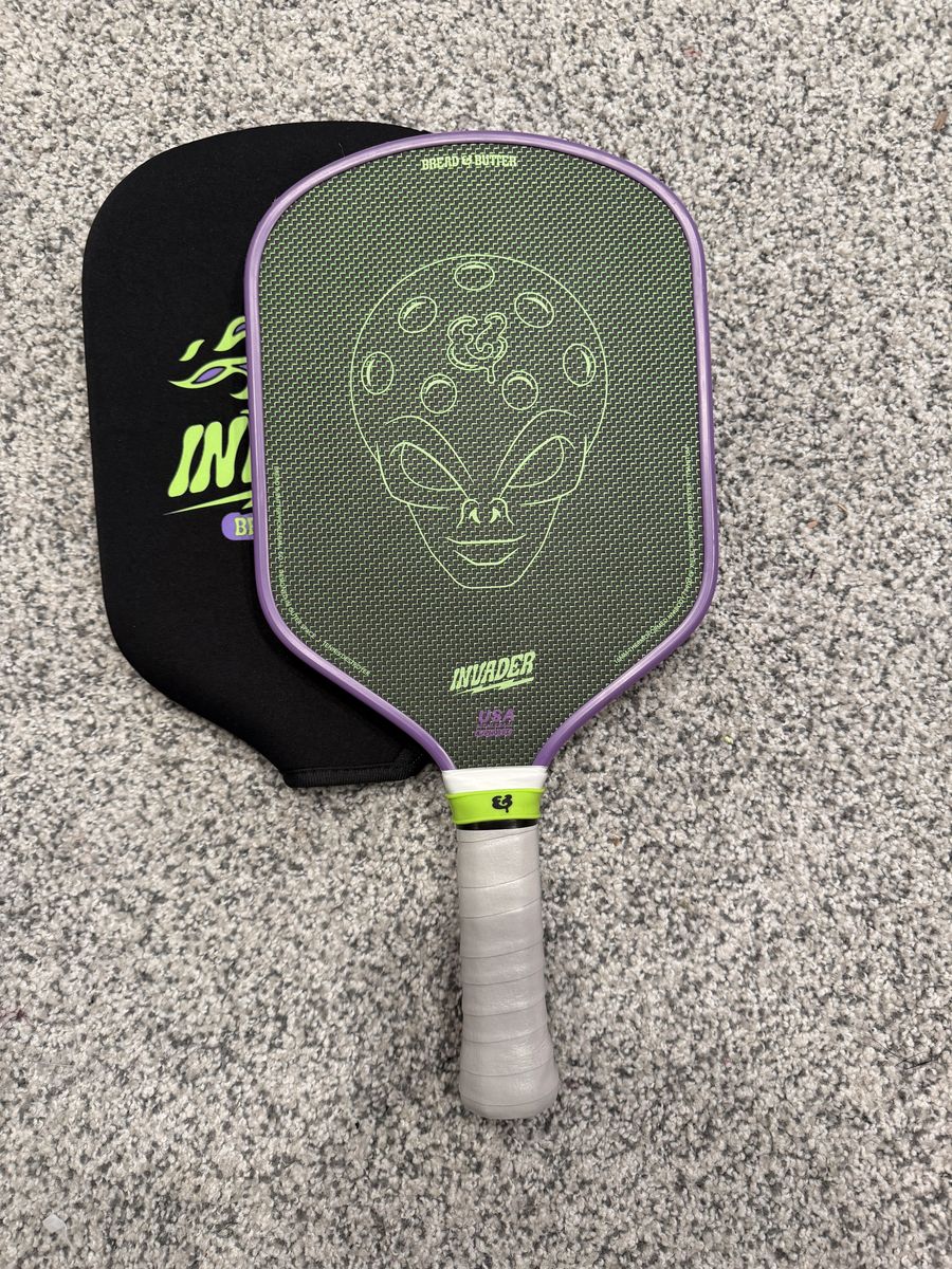 PayPalInvader pickleball paddle in like new shape! I bought this paddle cause I thought it looked cool and ended up never really playing it. It has a new udrippin drip on it that covers the factory grip.