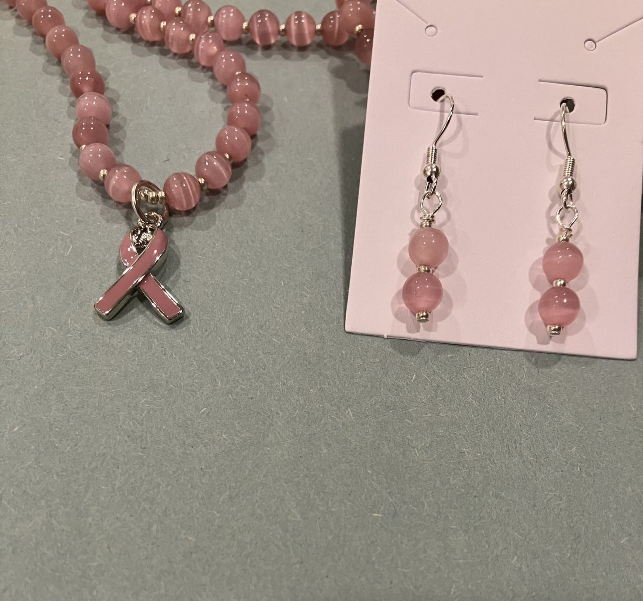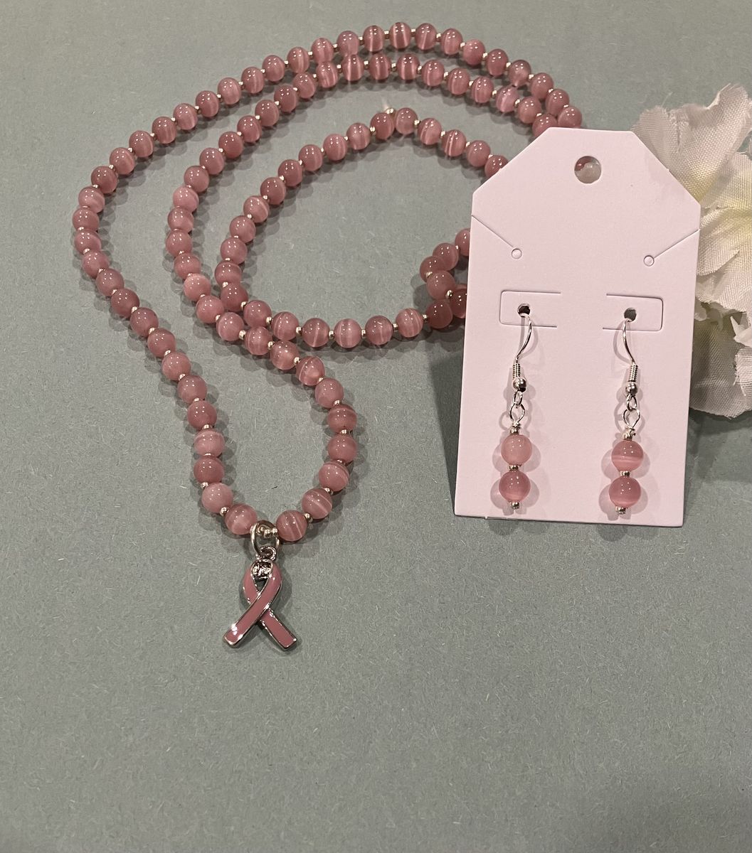 VenmoBeautiful, 34 inch beaded pink rose quartz gemstone necklace, dainty matching earrings, and the cancer awareness, pink ribbon pendant. Ear wires are silver plated. No clasp necessary due to the length of this necklace for easy, comfortable wear. Gift box included. Local meetup or can mail with a ship fee.