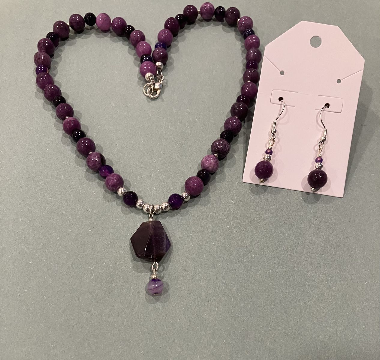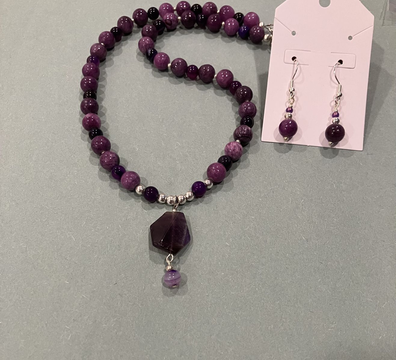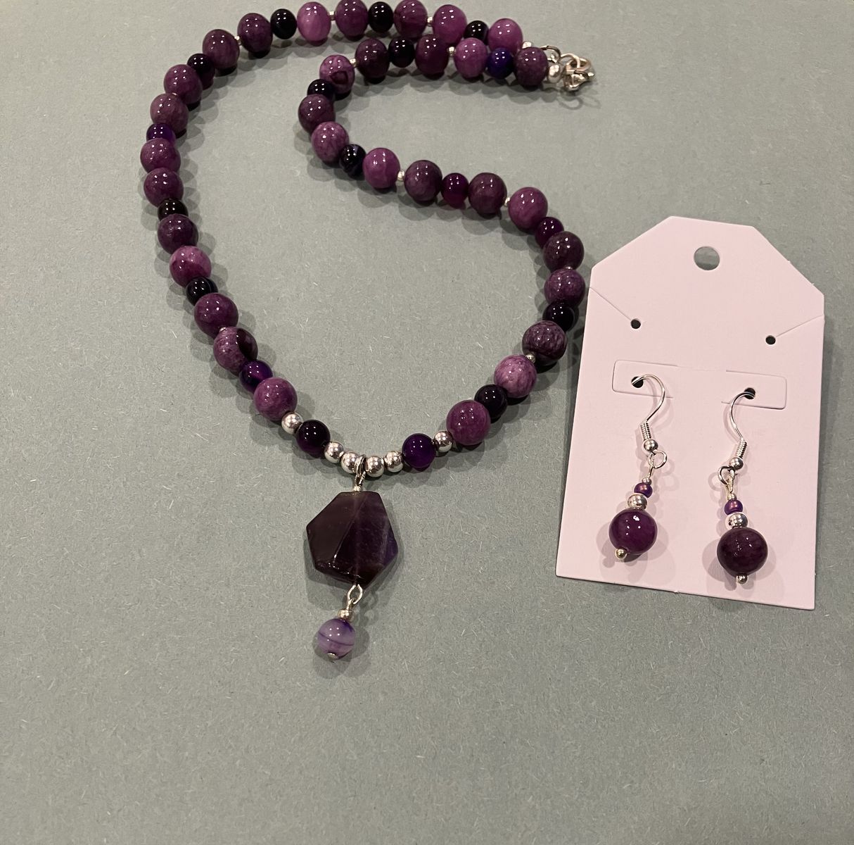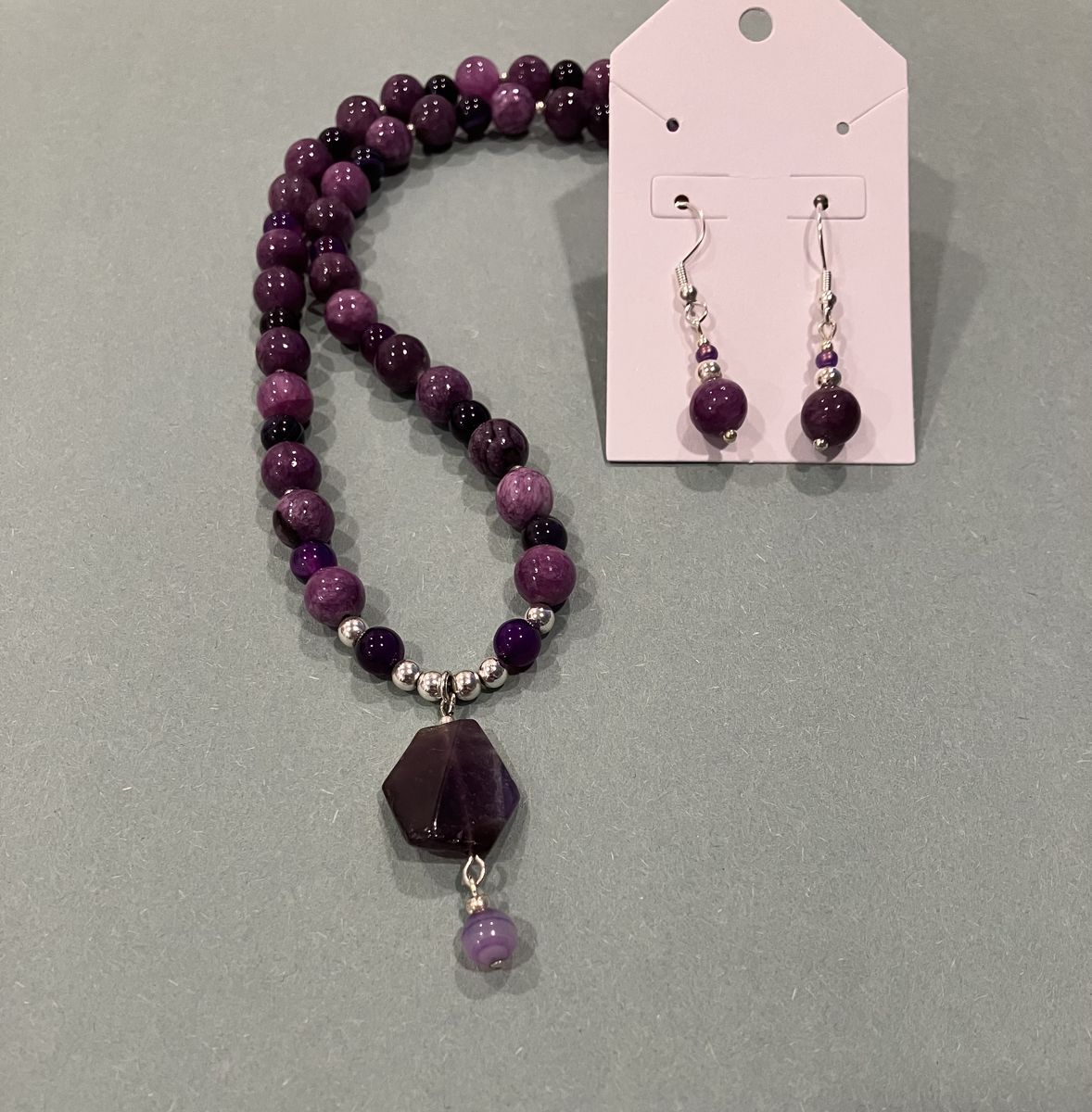 VenmoVintage Style, beautiful 17.4 inch long, purple beaded pendant necklace and earrings. Beads on this unique necklace are a combination of agates and amethyst gemstones. Pendant is approximately 1 inch long. Ear wires are silver plated. Gift box included. Local meetup or can mail with ship fee.