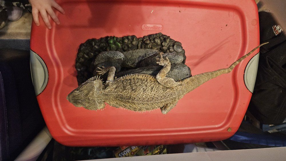 VenmoThis is Dutch. He is my sweet tempered bearded dragon. I am looking for a new home for him because I am moving & I am worried he may not make an out of state moving trip. he is around 10 years old, with a small kink in his tail that never bothered him. He still eats very well & is usually very contempt on his rock. The tank you see in the photo is one I made when his original tank broke. I'm more than happy to give it along with Dutch & all the other things I have for him. his favorite foods are crickets, horned worms, strawberries, raspberries, kale, & once in a blue moon a frozen thawed pinkie mouse.
